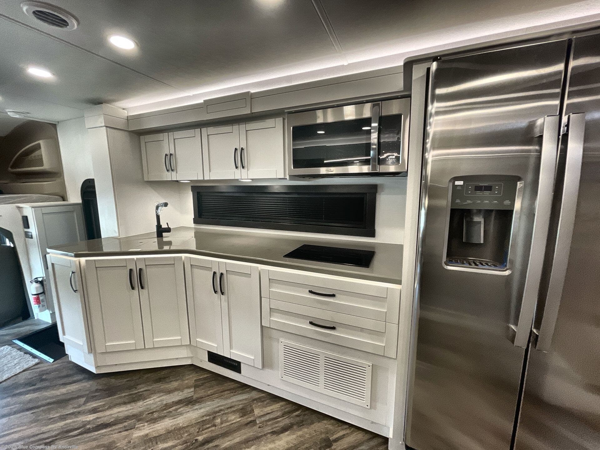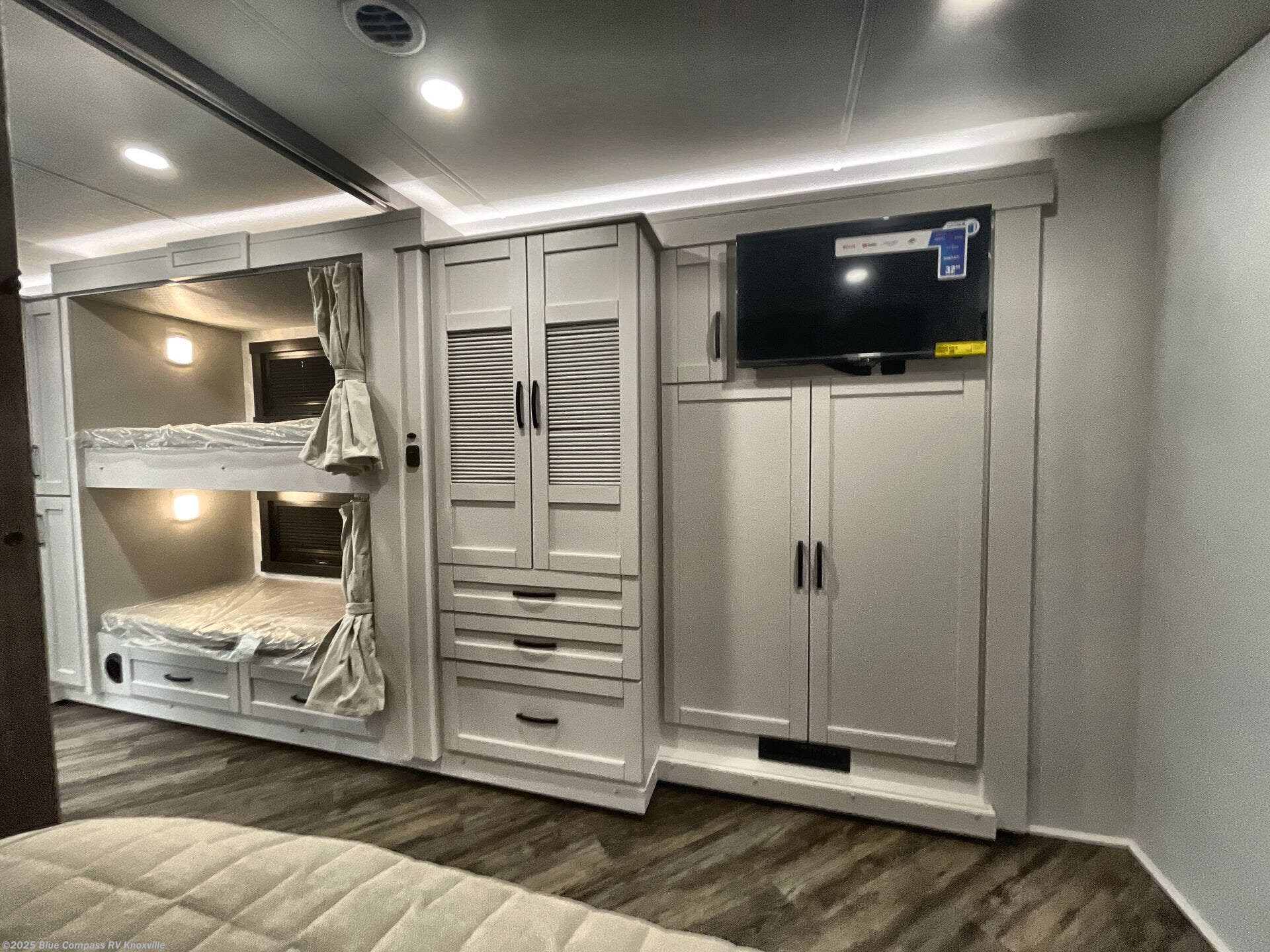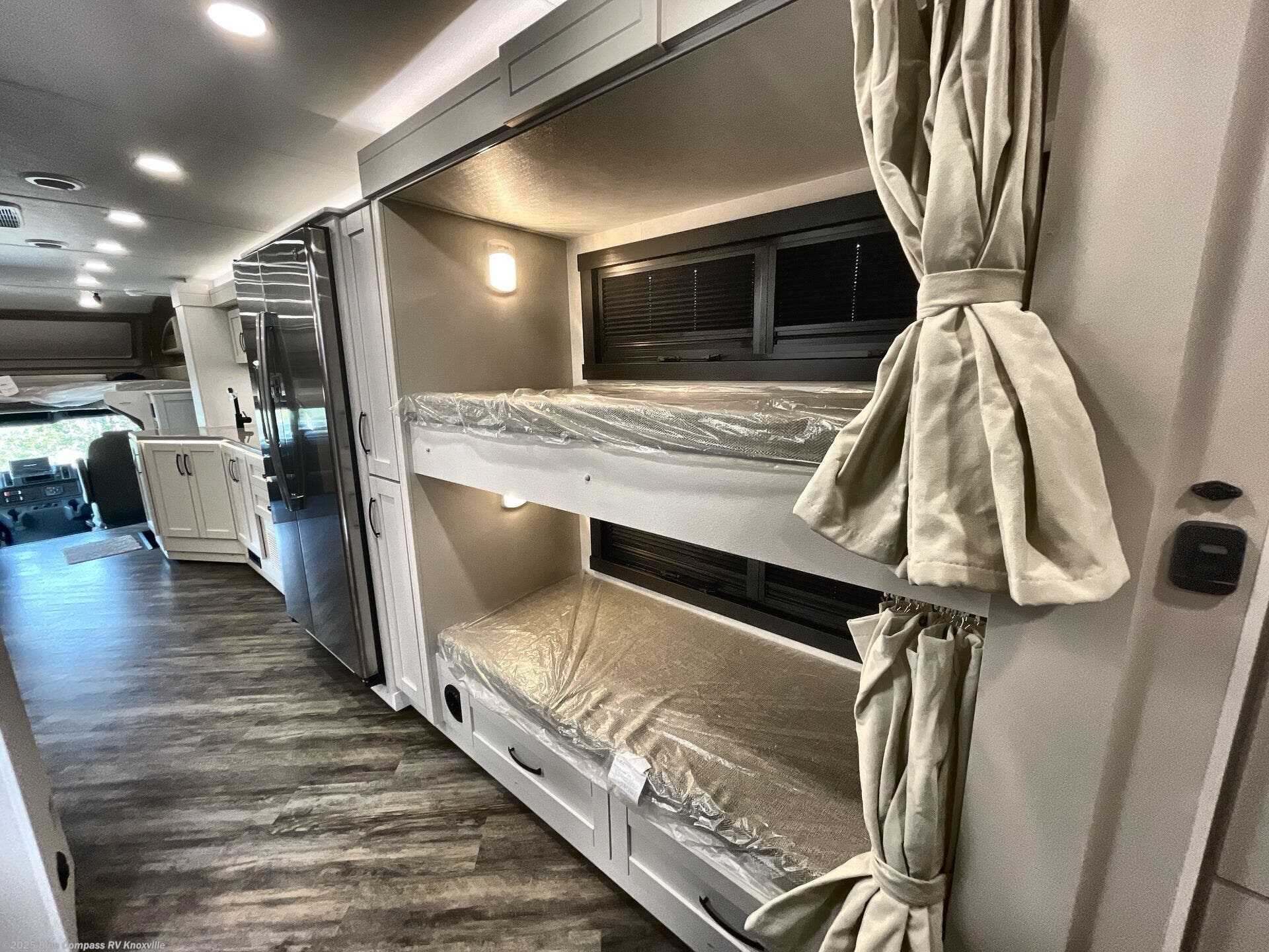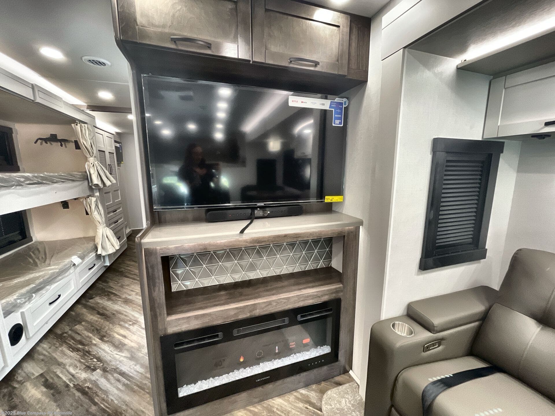 Family vacations just got sweeter in this coach with 28" x 70" bunk beds! The little ones will love having their own bunks with wall-mounted tablet holders in each, plus there is a cab-over bunk for even more sleeping space. You will have your own bedroom in the back with a king bed, a wardrobe to keep your clothes tidy, and an optional washer and dryer if you plan to go full-time. Everyone can meet in the main living area on the72" hide-a-bed sofa or at the booth dinette, and there is an LED HD Smart TV here and a fireplace for a more at-home feel. A residential refrigerator comes standard in the kitchen, as well as a pantry to store snacks and a two burner induction cooktop. The outside is just as impressive as the inside with its 18' power awning with LED lights and outside entertainment center!