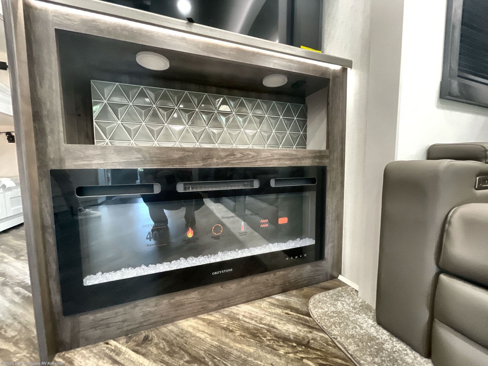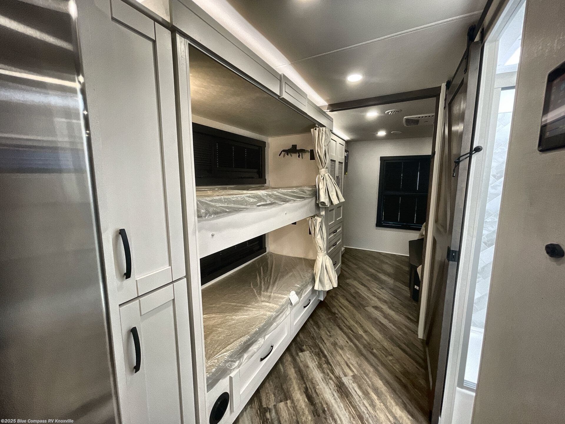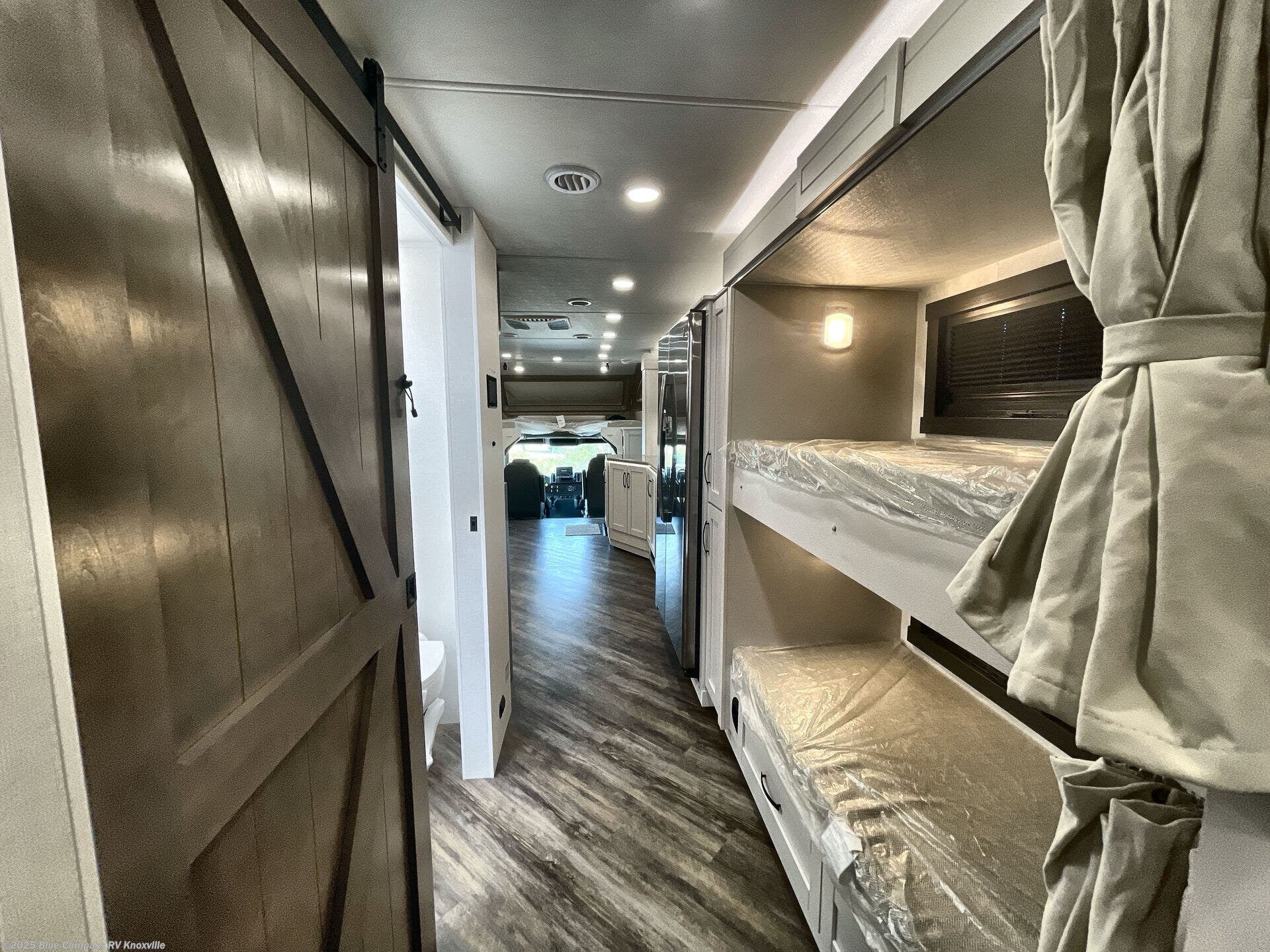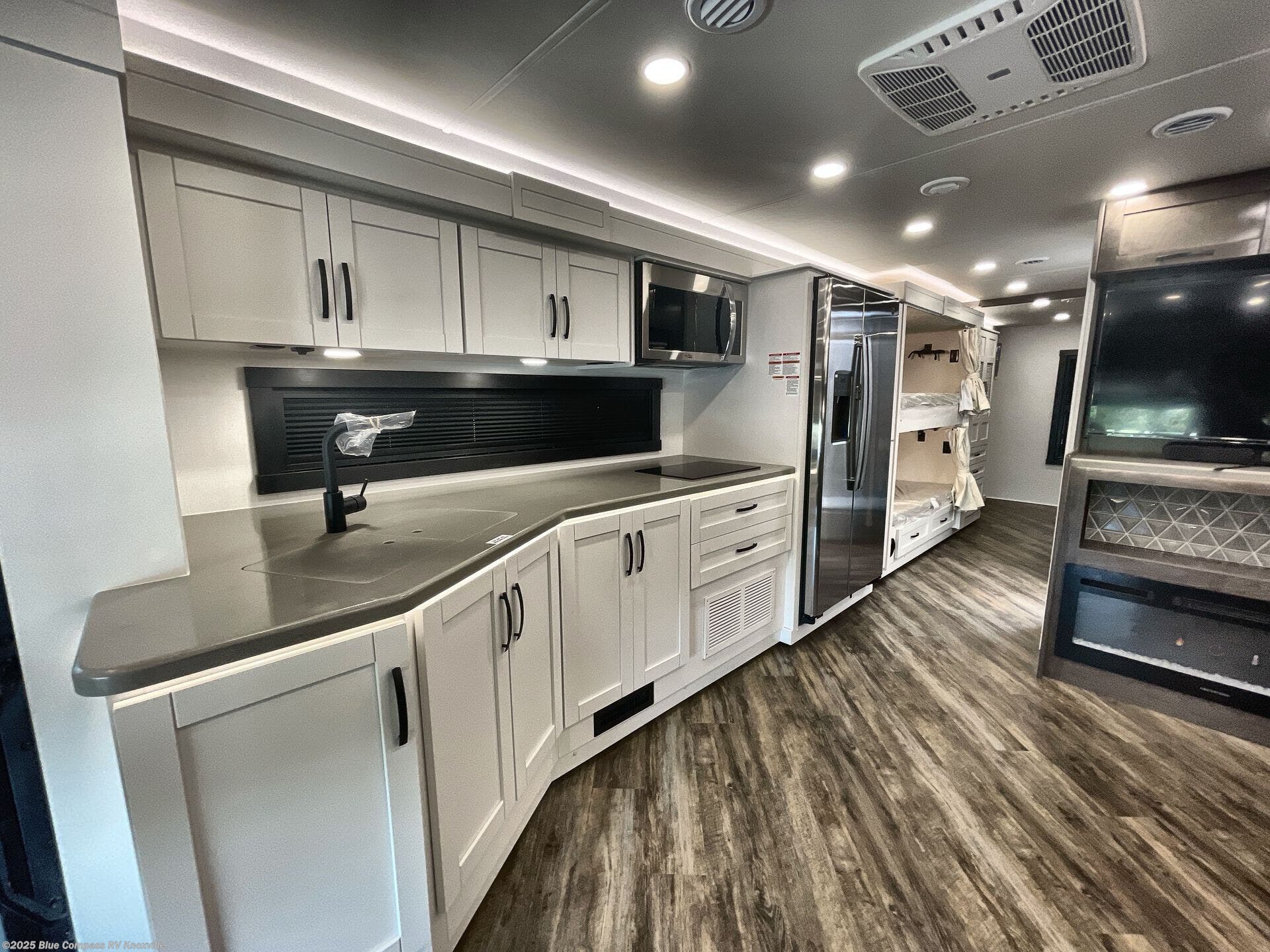 Family vacations just got sweeter in this coach with 28" x 70" bunk beds! The little ones will love having their own bunks with wall-mounted tablet holders in each, plus there is a cab-over bunk for even more sleeping space. You will have your own bedroom in the back with a king bed, a wardrobe to keep your clothes tidy, and an optional washer and dryer if you plan to go full-time. Everyone can meet in the main living area on the72" hide-a-bed sofa or at the booth dinette, and there is an LED HD Smart TV here and a fireplace for a more at-home feel. A residential refrigerator comes standard in the kitchen, as well as a pantry to store snacks and a two burner induction cooktop. The outside is just as impressive as the inside with its 18' power awning with LED lights and outside entertainment center!