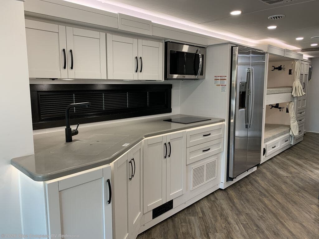 Family vacations just got sweeter in this coach with 28" x 70" bunk beds! The little ones will love having their own bunks with wall-mounted tablet holders in each, plus there is a cab-over bunk for even more sleeping space. You will have your own bedroom in the back with a king bed, a wardrobe to keep your clothes tidy, and an optional washer and dryer if you plan to go full-time. Everyone can meet in the main living area on the72" hide-a-bed sofa or at the booth dinette, and there is an LED HD Smart TV here and a fireplace for a more at-home feel. A residential refrigerator comes standard in the kitchen, as well as a pantry to store snacks and a two burner induction cooktop. The outside is just as impressive as the inside with its 18' power awning with LED lights and outside entertainment center!
