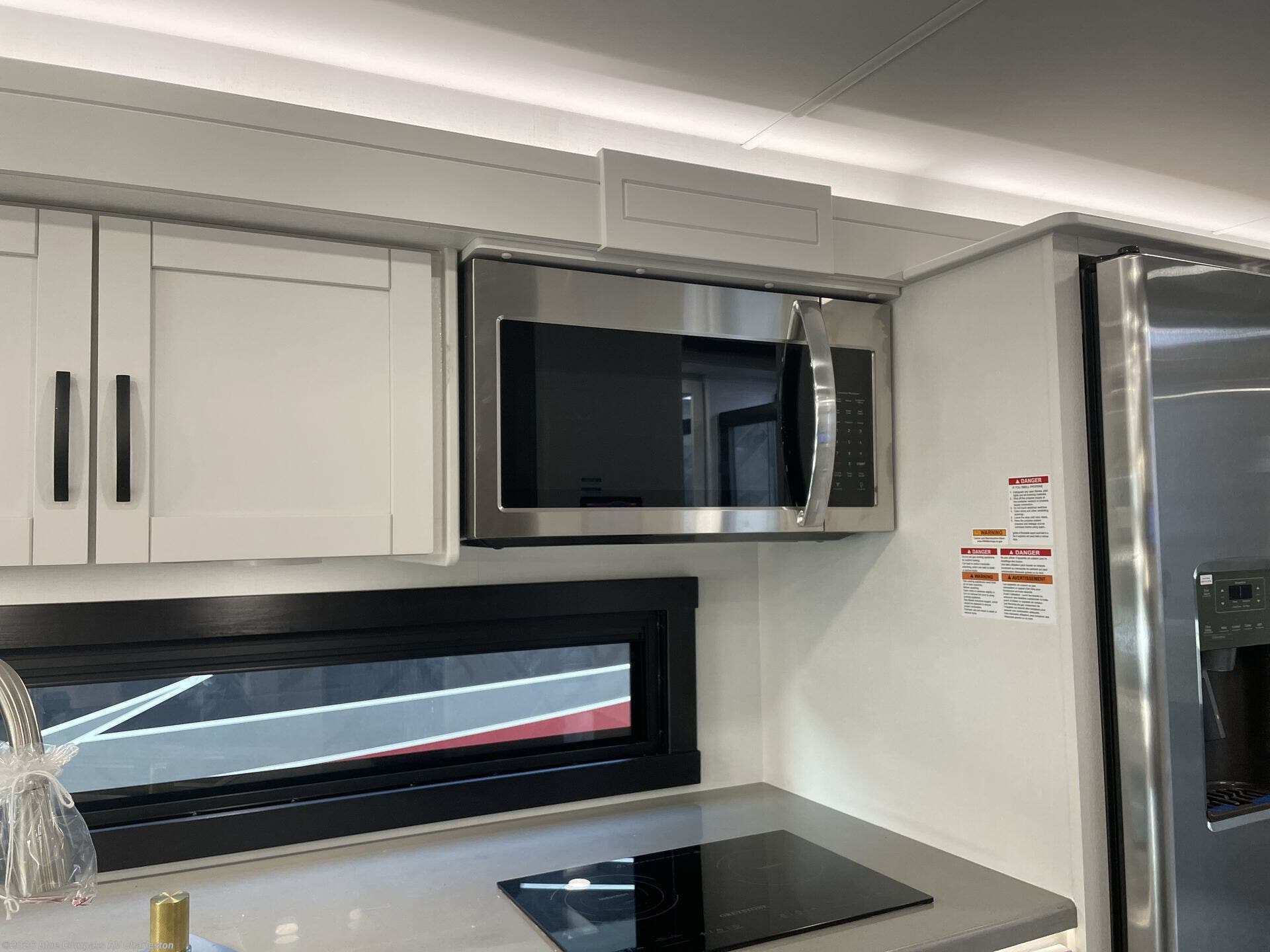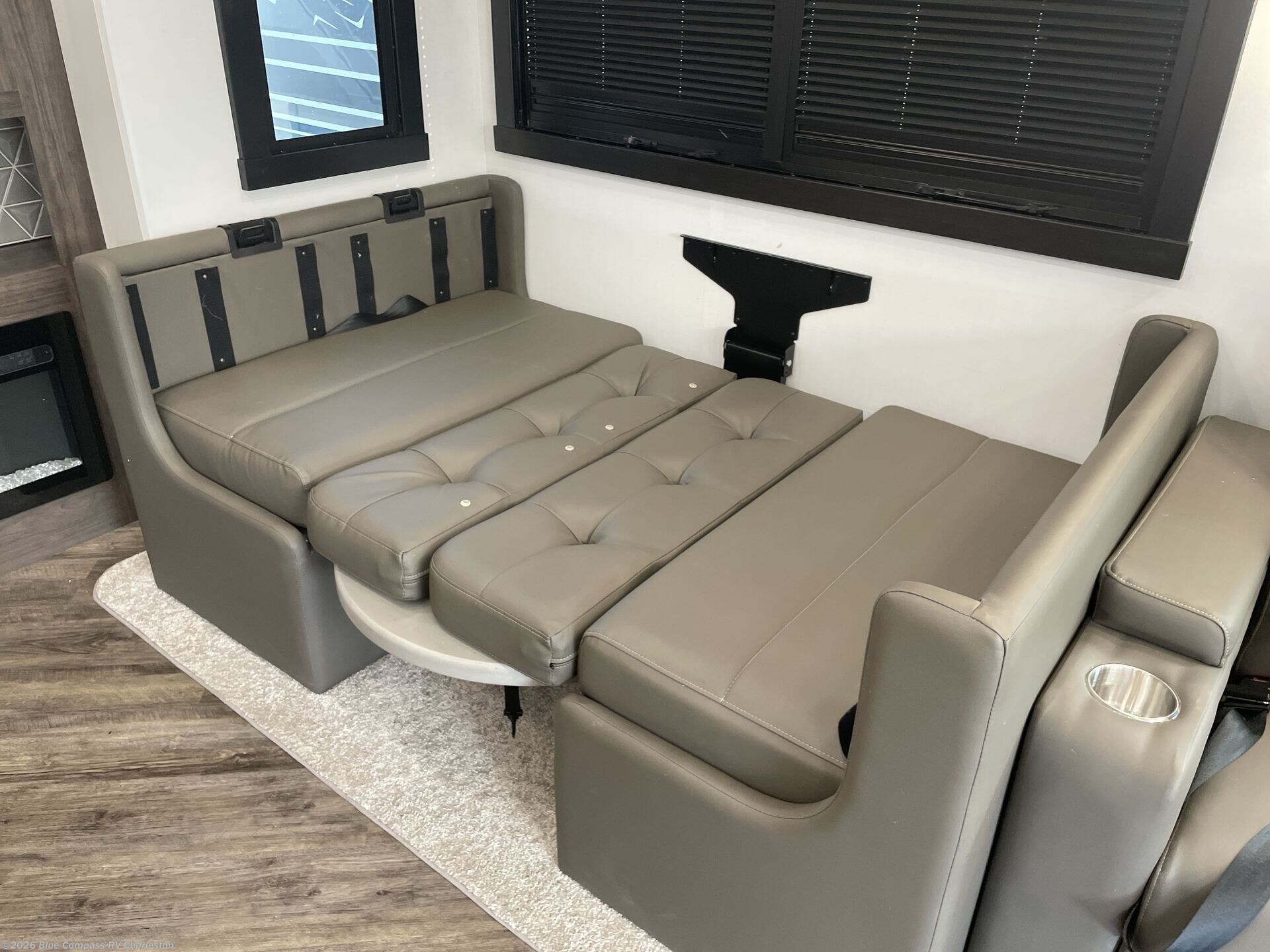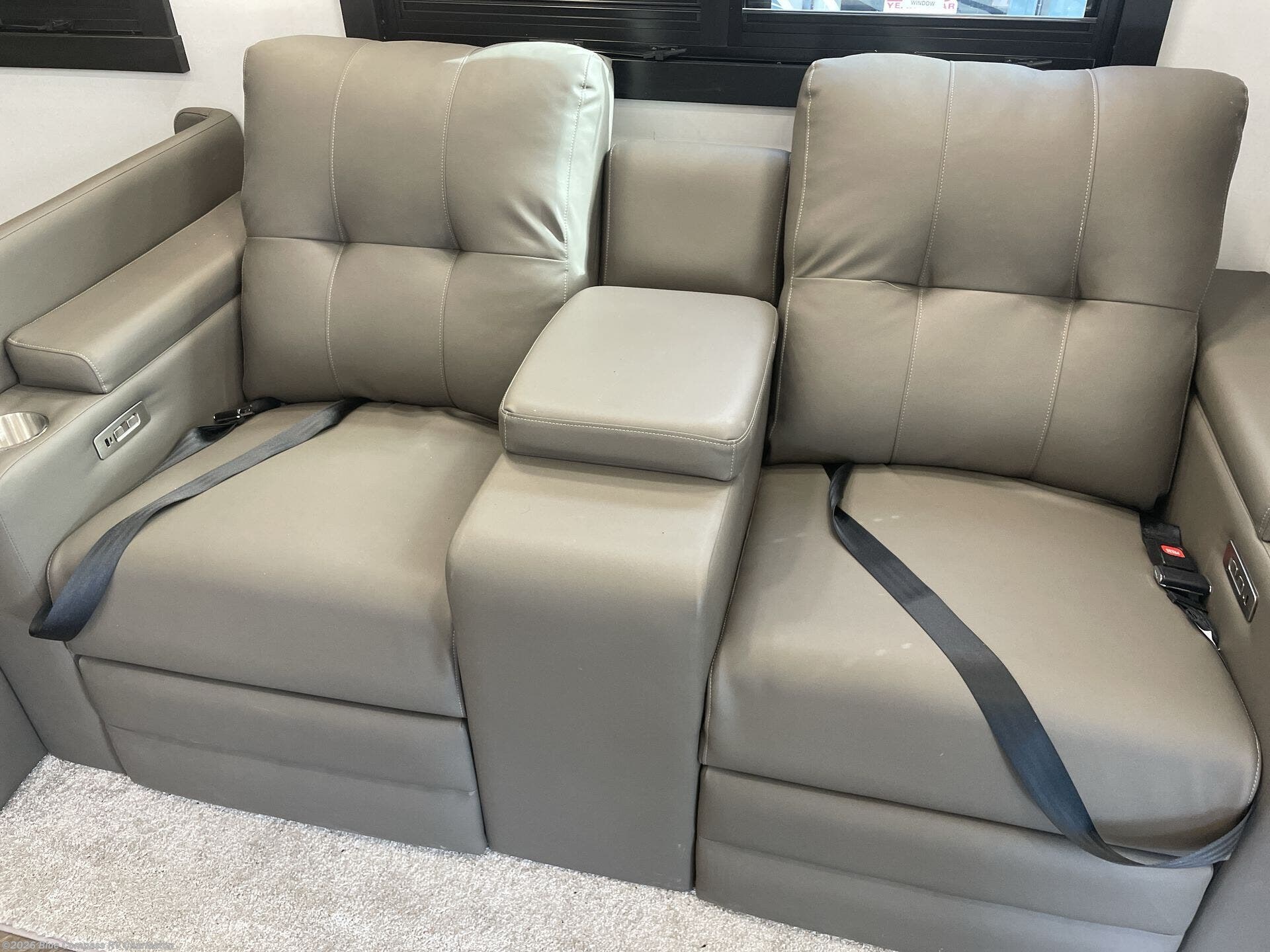 If you liked the Accolade model 37L, but don't need the extra sleeping space from the bunks, this 37M Accolade coach is perfect for you! You'll still have the cab-over bunk, the full-wall slide, and the rear private bedroom. The power head lift king bed will allow you to sit up and read at night, or you may just want to watch a movie on the bedroom LED TV. The chef of your group can prepare meals on the two burner induction cooktop, or use the residential-size convection microwave, and there is a residential refrigerator just like at home. Relaxing each day will be a breeze with the power theater seating across from the 50" TV lift and second sofa, and you can dine at the booth dinette. There is also a hutch for added storage space, and an impressive 23' power awning with LED lights!