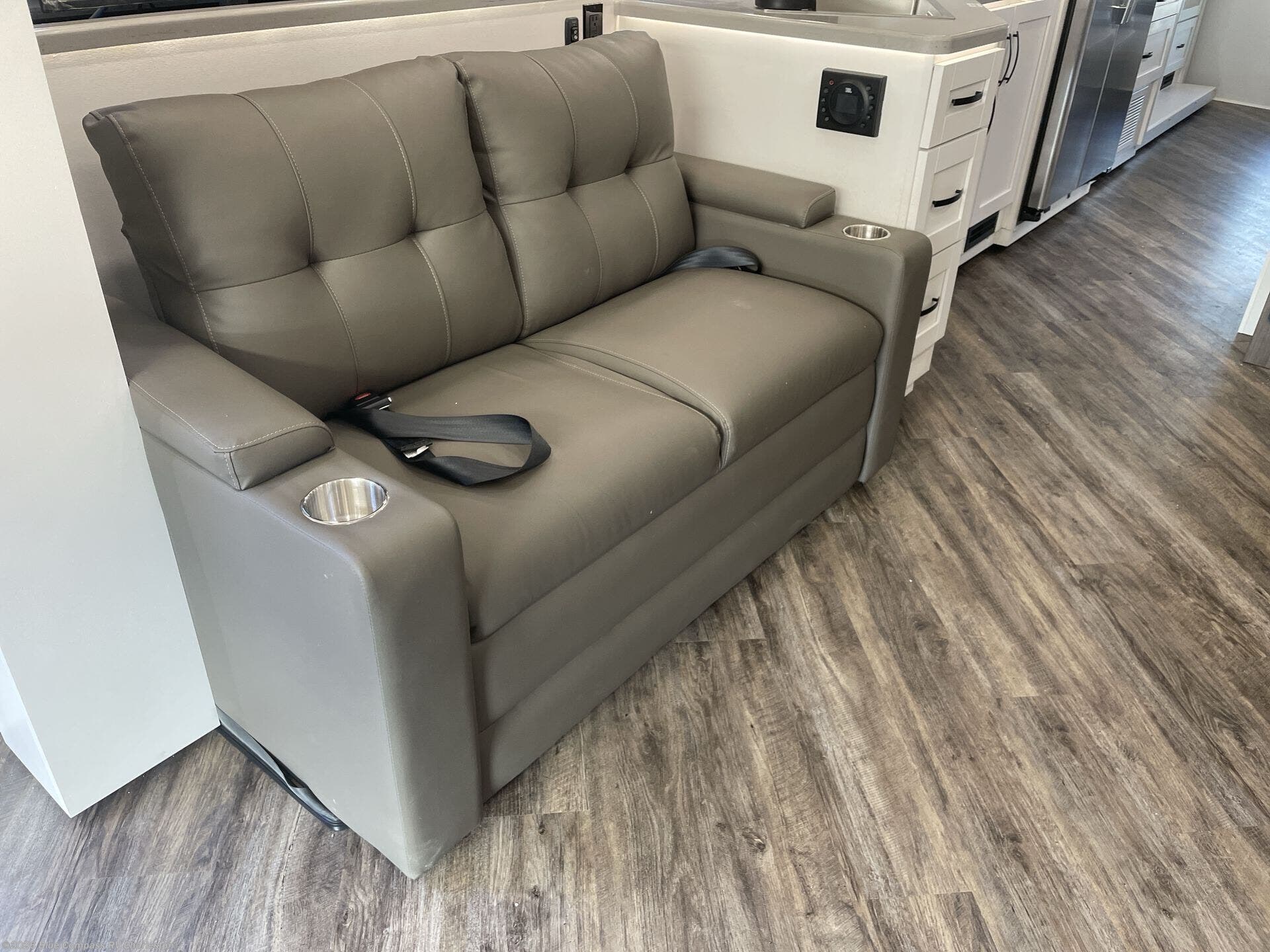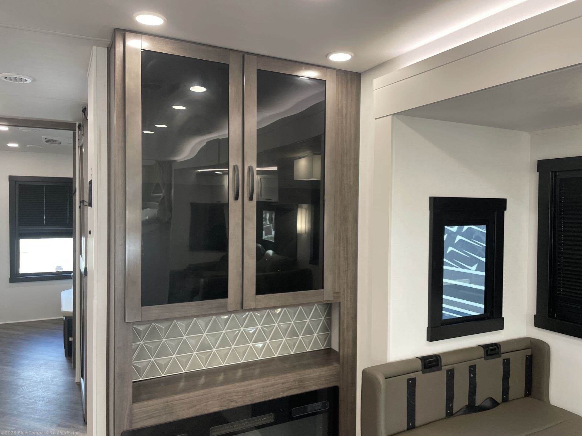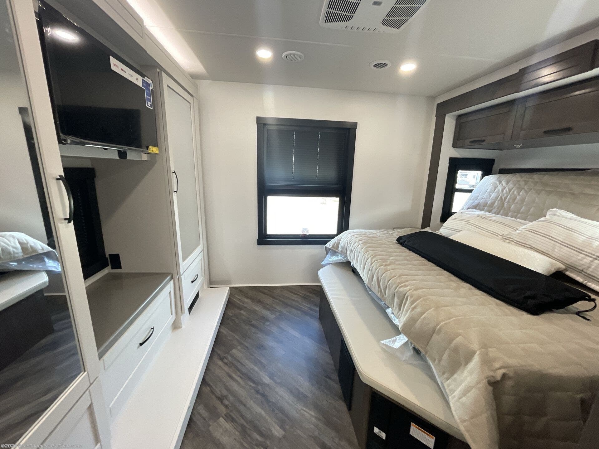 If you liked the Accolade model 37L, but don't need the extra sleeping space from the bunks, this 37M Accolade coach is perfect for you! You'll still have the cab-over bunk, the full-wall slide, and the rear private bedroom. The power head lift king bed will allow you to sit up and read at night, or you may just want to watch a movie on the bedroom LED TV. The chef of your group can prepare meals on the two burner induction cooktop, or use the residential-size convection microwave, and there is a residential refrigerator just like at home. Relaxing each day will be a breeze with the power theater seating across from the 50" TV lift and second sofa, and you can dine at the booth dinette. There is also a hutch for added storage space, and an impressive 23' power awning with LED lights!