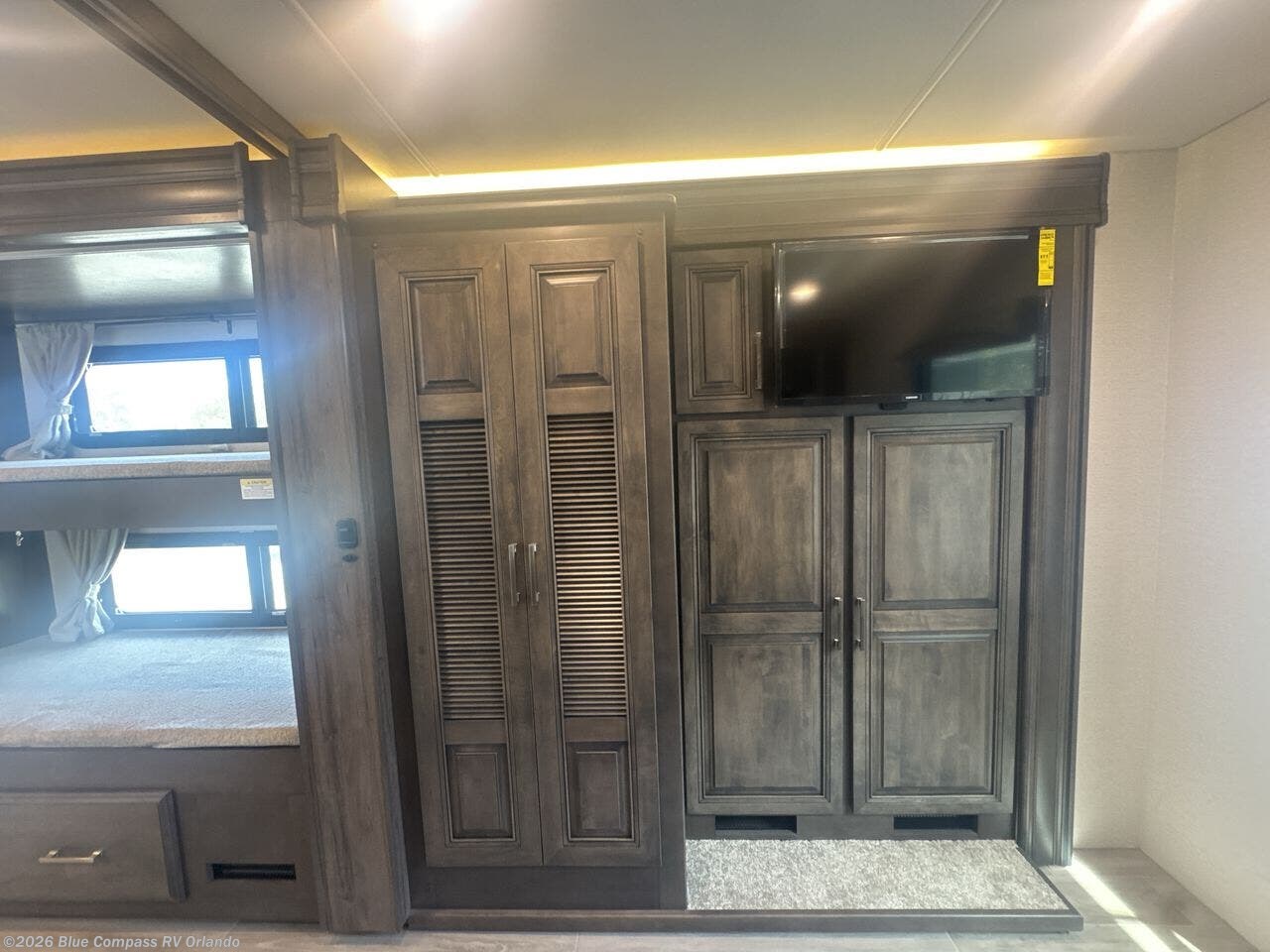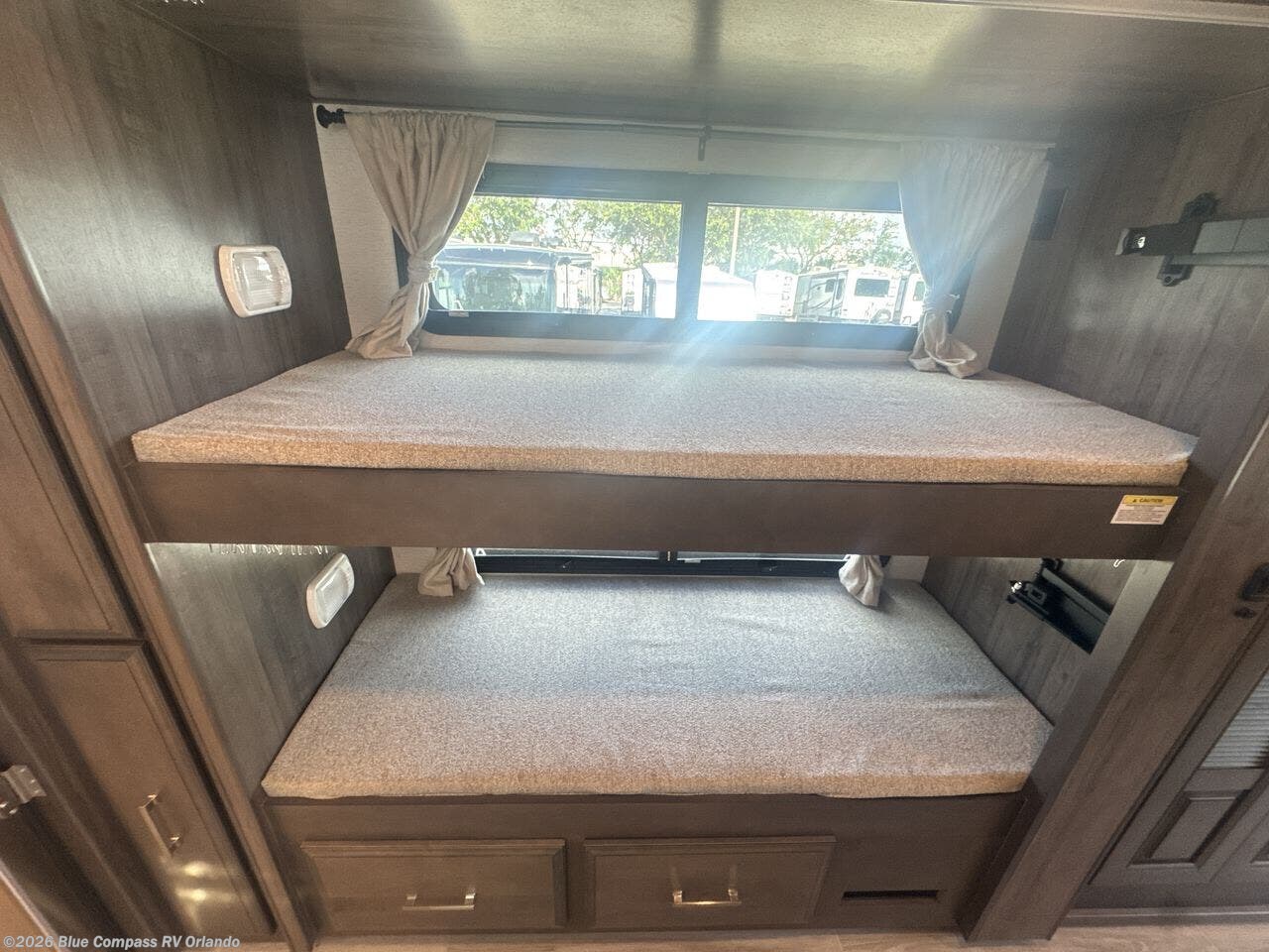 The whole gang can tag along in this motorhome! It features a rear private bedroom with a 72" x 80" king bed slide across from a wardrobe and an area prepped to add an optional stacked washer and dryer. The 28" x 72" bunk beds each have their own TV and are conveniently across from the full bathroom which has a 30" x 36" shower. The kitchen has everything you will need to prepare your best home cooked meals including a two burner induction cooktop with LED display. There is a booth dinette to dine at each day, and a hide-a-bed sofa for more sleeping space. If you want even more comfort, just choose the optional power theater seating in place of the sofa! Why stay inside to watch the big game when you can watch it at the outside entertainment center and breathe in some fresh air!