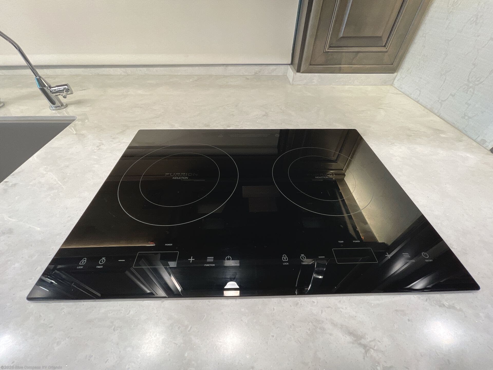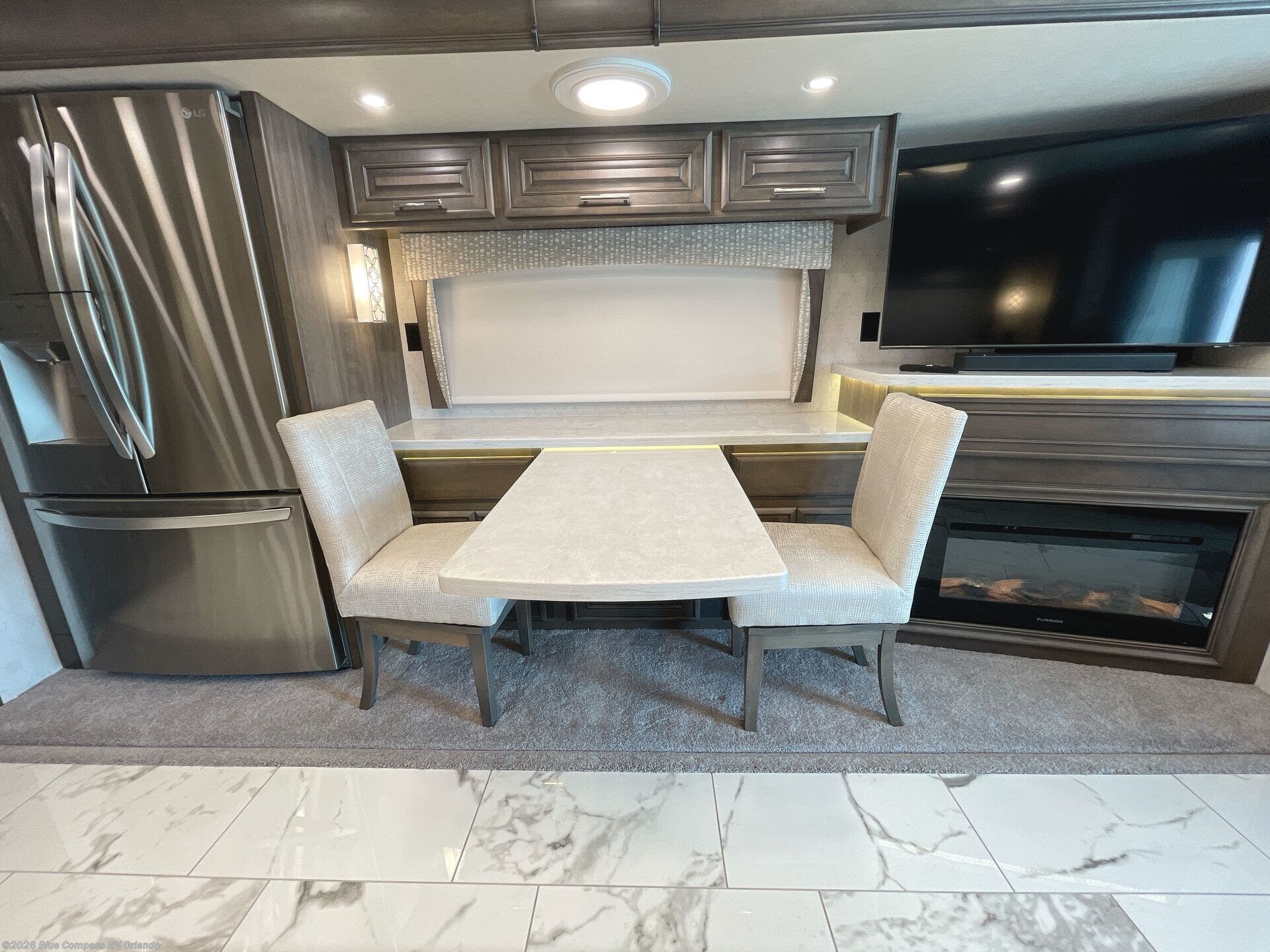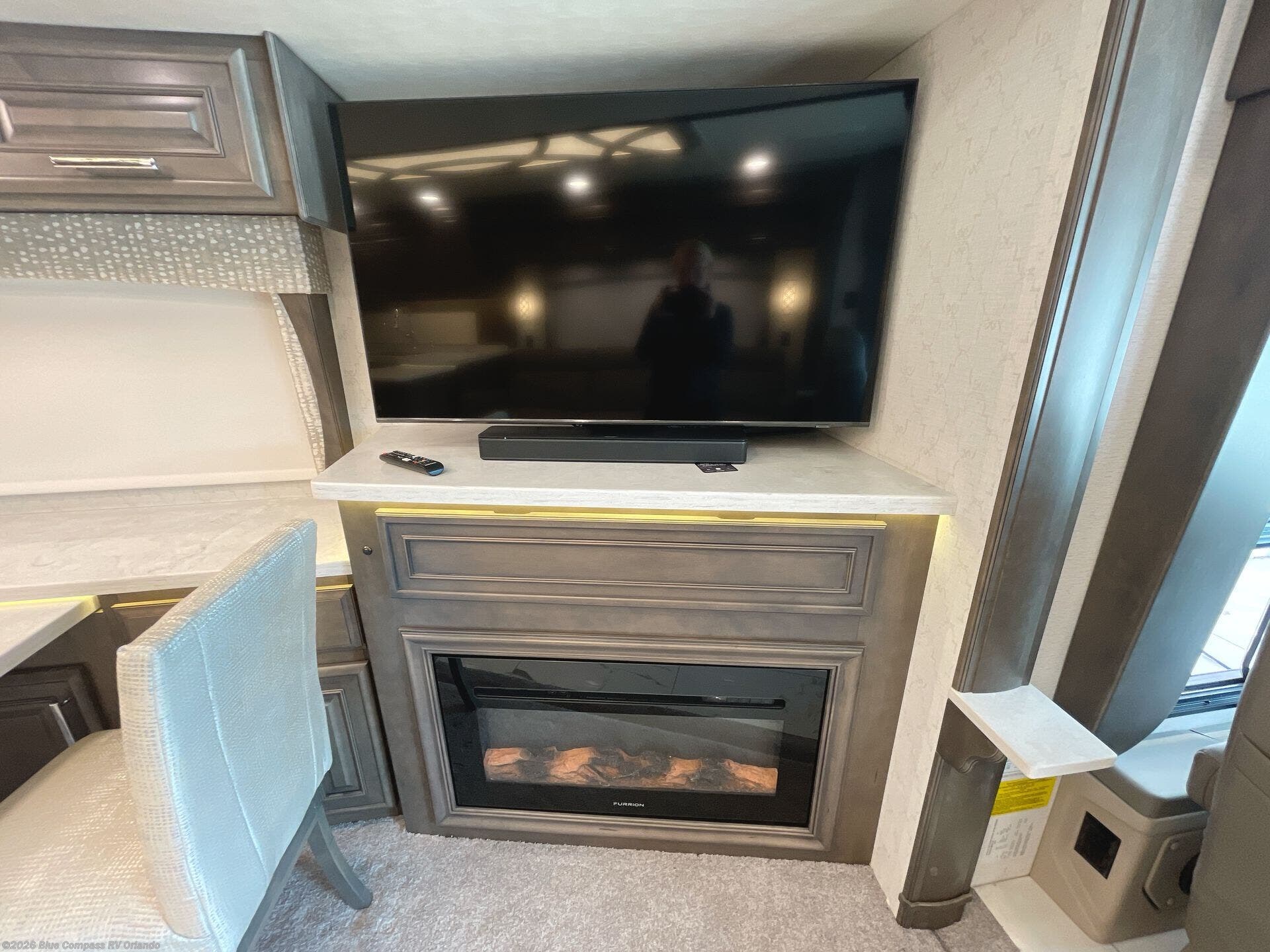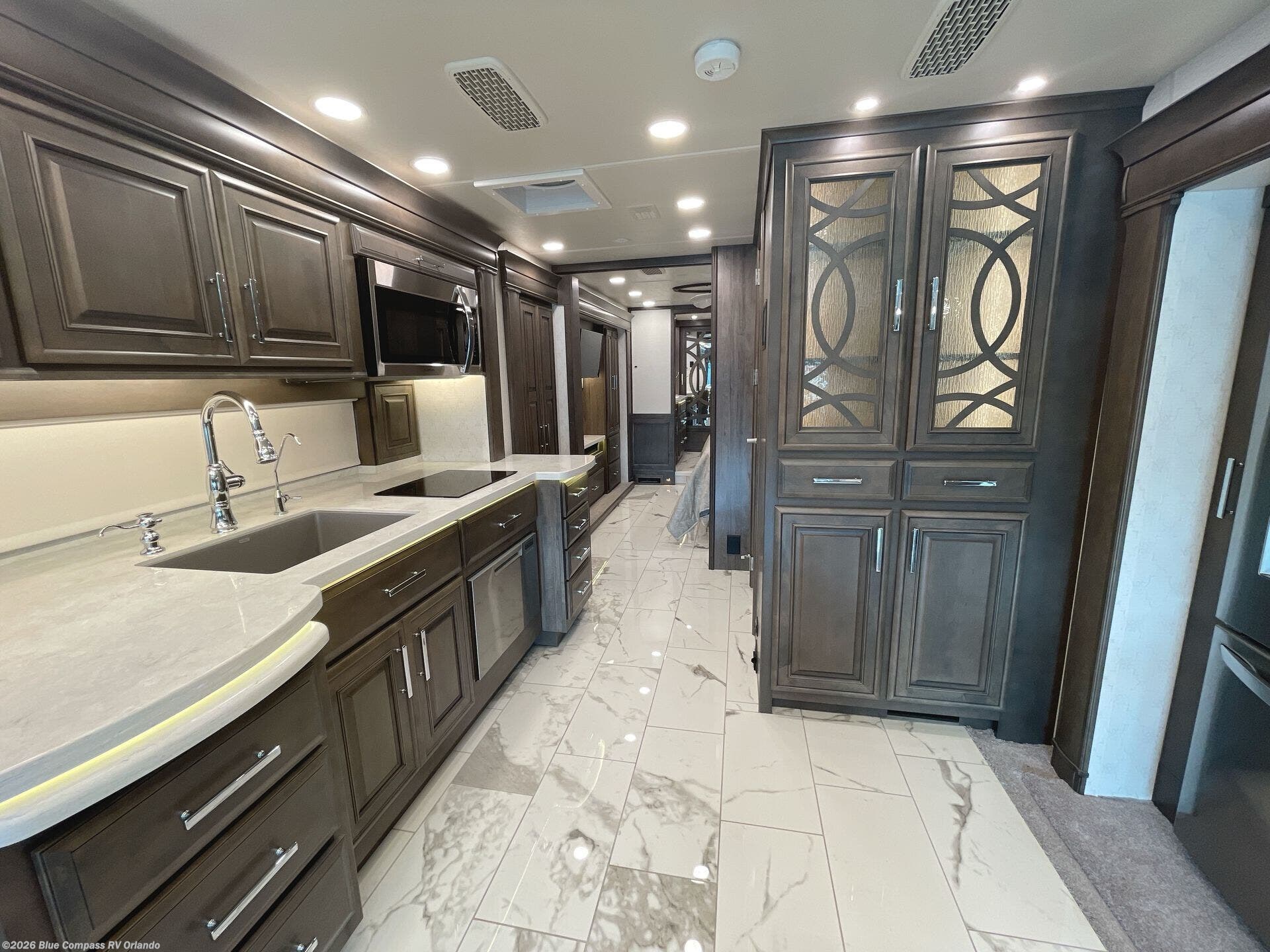 Whether you travel for work, to see family or explore the country side, this coach offers the power you want and the luxury you desire! Once at your destination, easily set up and relax on the three-seat power reclining sofa or choose the hide-a-bed sofa option, or eat a snack at the table. The 50" Smart TV and fireplace add coziness, the broom closet offers tidiness. The kitchen allows you to cook like at home with a convection microwave and induction cooktop, plus there is a Fisher & Paykel dishwasher for easy clean-up. There is a 32" Smart TV over the cab to watch as well, and a mid-coach half bath for convenience. The master suite offers a slide out king bed, sliding doors for privacy, wardrobes, and a 43" Smart TV to watch before bedtime. And the rear full bathroom offers a shower, a large wardrobe, plus a washer and dryer.
