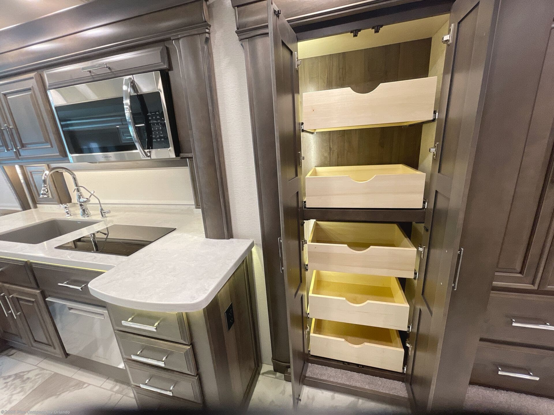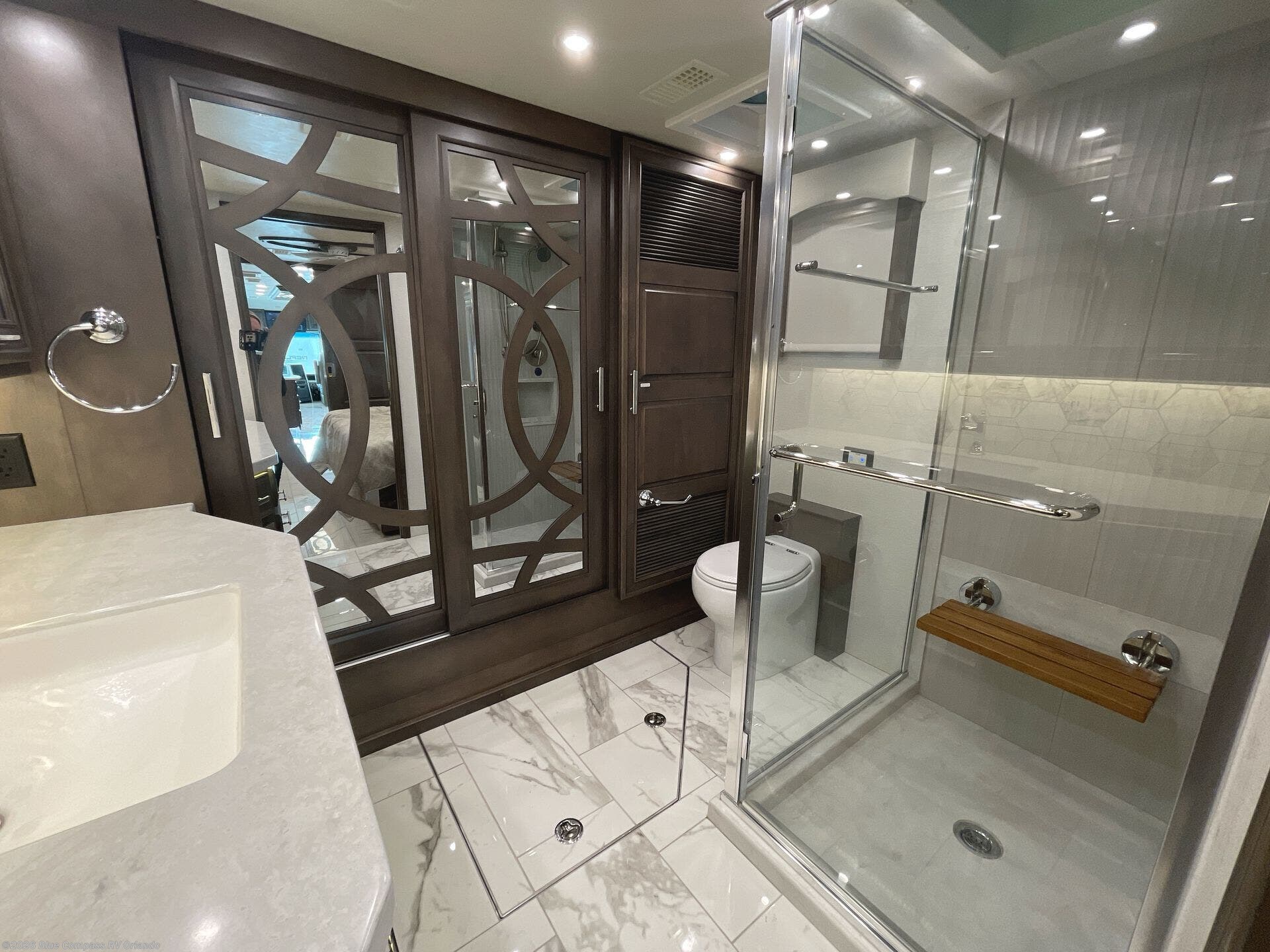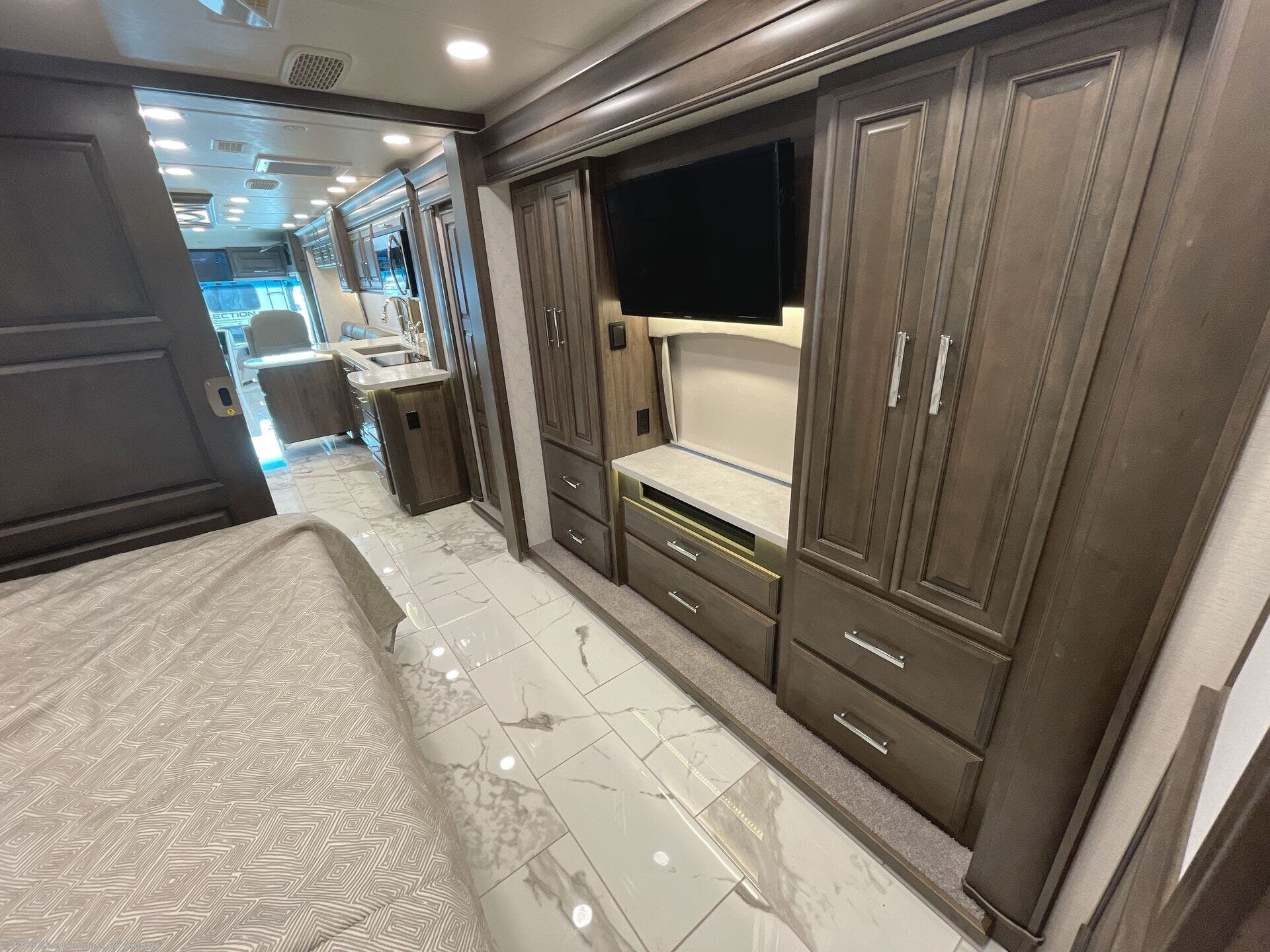 Whether you travel for work, to see family or explore the country side, this coach offers the power you want and the luxury you desire! Once at your destination, easily set up and relax on the three-seat power reclining sofa or choose the hide-a-bed sofa option, or eat a snack at the table. The 50" Smart TV and fireplace add coziness, the broom closet offers tidiness. The kitchen allows you to cook like at home with a convection microwave and induction cooktop, plus there is a Fisher & Paykel dishwasher for easy clean-up. There is a 32" Smart TV over the cab to watch as well, and a mid-coach half bath for convenience. The master suite offers a slide out king bed, sliding doors for privacy, wardrobes, and a 43" Smart TV to watch before bedtime. And the rear full bathroom offers a shower, a large wardrobe, plus a washer and dryer.