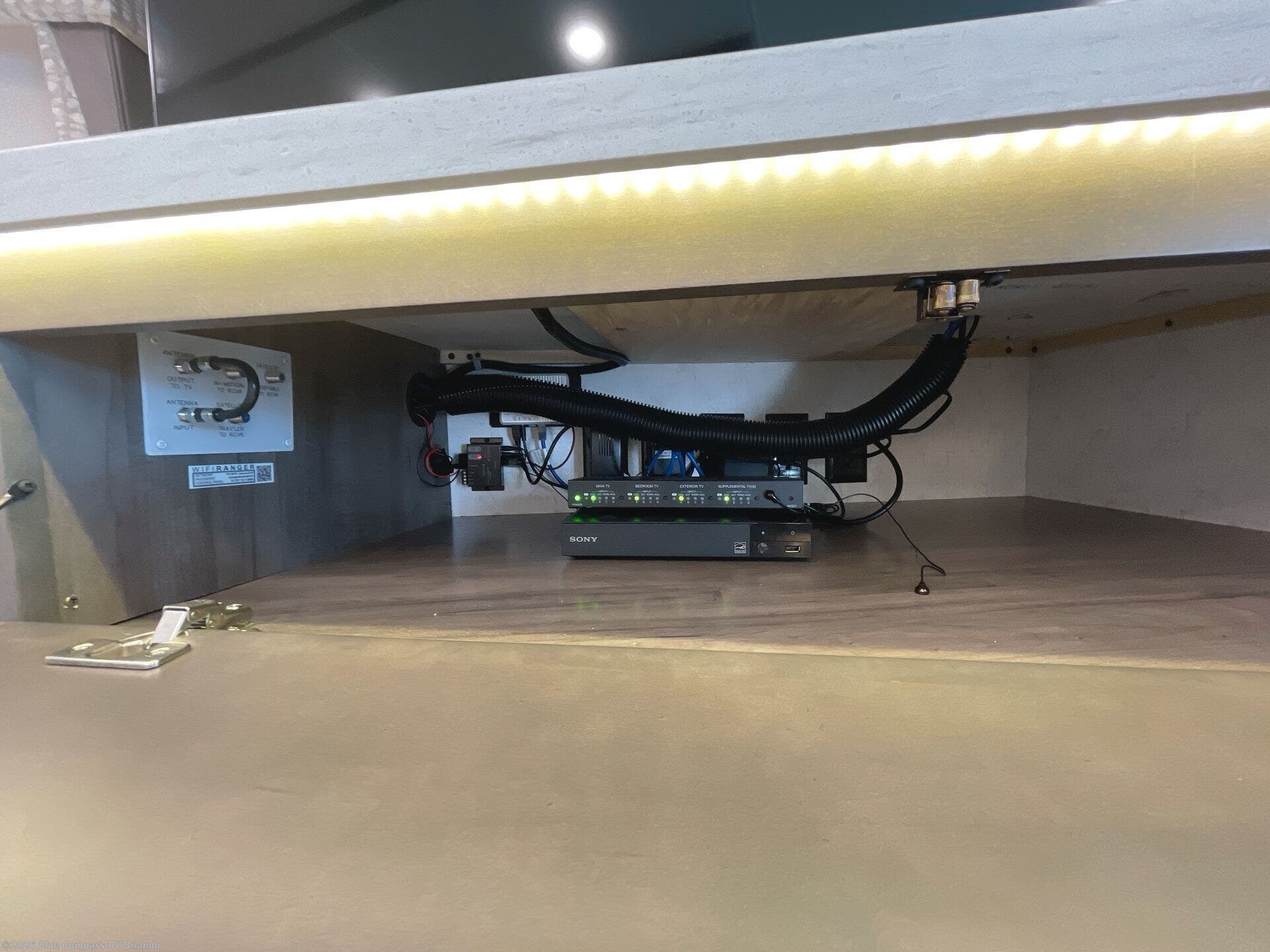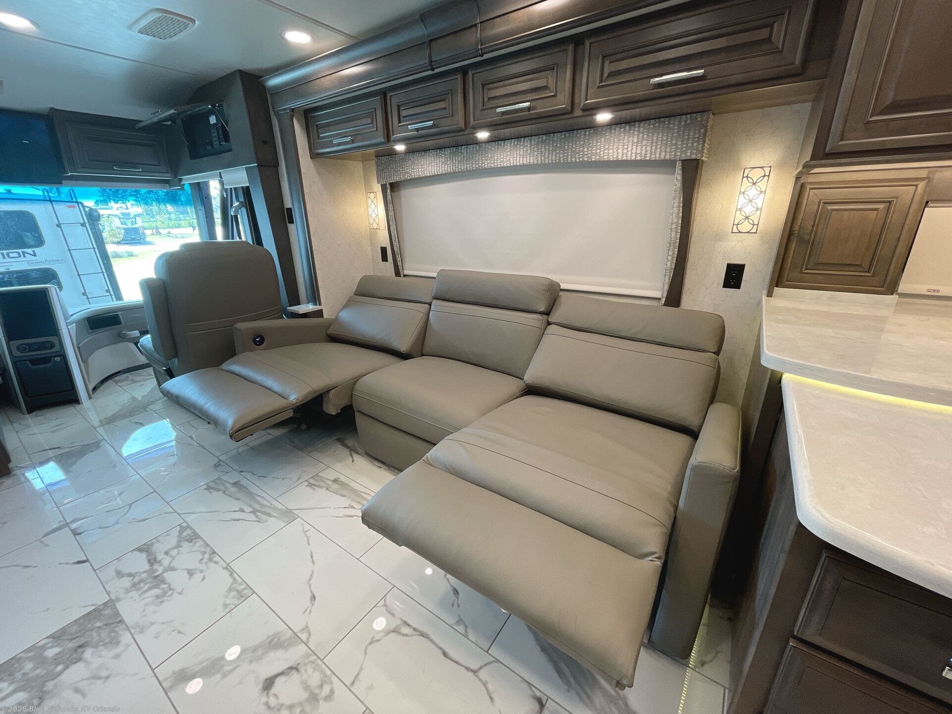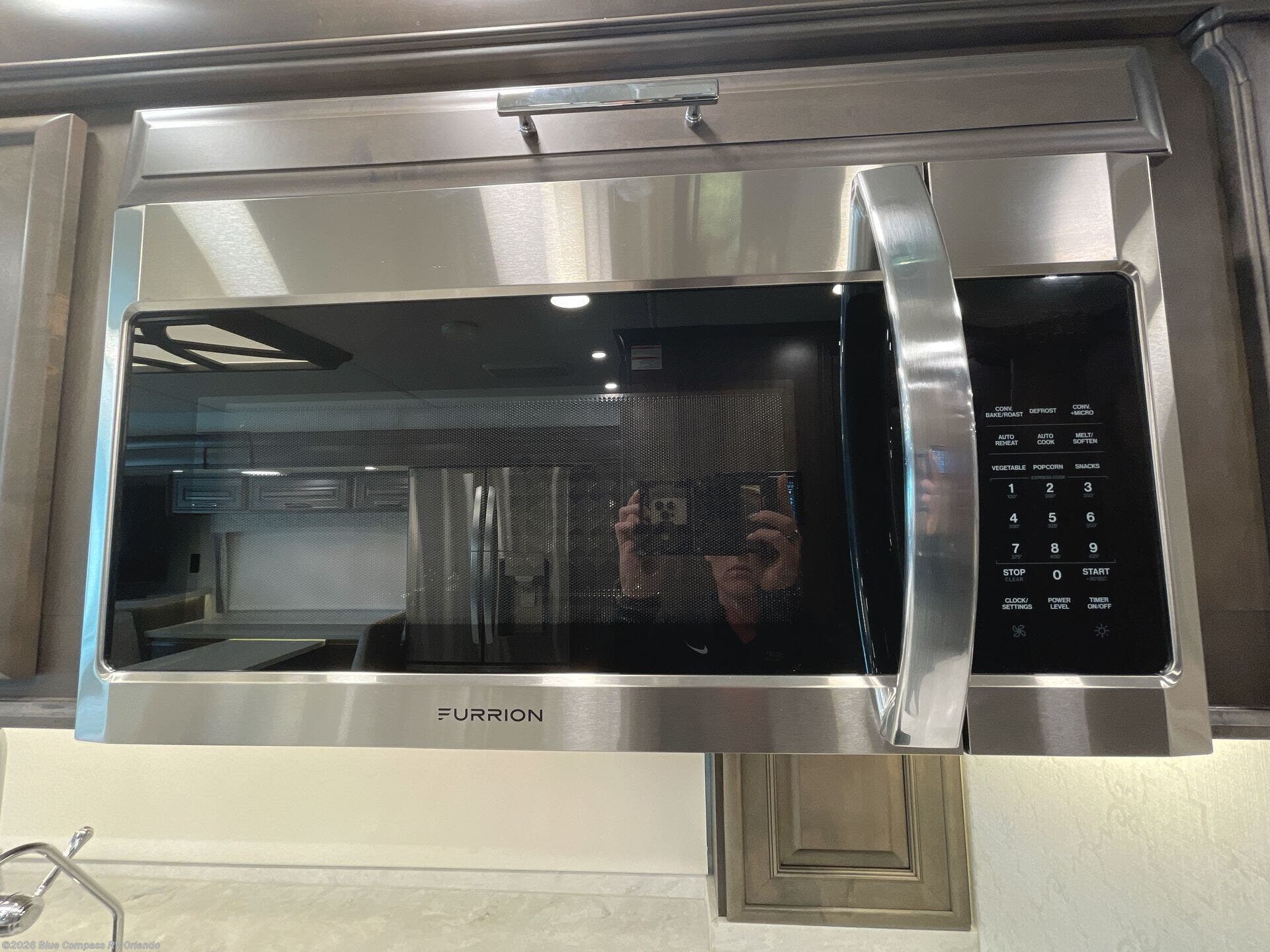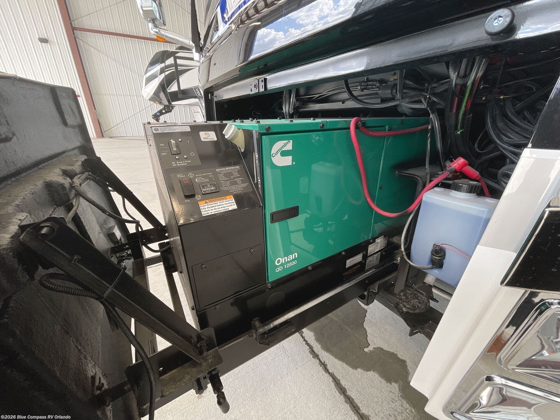 Whether you travel for work, to see family or explore the country side, this coach offers the power you want and the luxury you desire! Once at your destination, easily set up and relax on the three-seat power reclining sofa or choose the hide-a-bed sofa option, or eat a snack at the table. The 50" Smart TV and fireplace add coziness, the broom closet offers tidiness. The kitchen allows you to cook like at home with a convection microwave and induction cooktop, plus there is a Fisher & Paykel dishwasher for easy clean-up. There is a 32" Smart TV over the cab to watch as well, and a mid-coach half bath for convenience. The master suite offers a slide out king bed, sliding doors for privacy, wardrobes, and a 43" Smart TV to watch before bedtime. And the rear full bathroom offers a shower, a large wardrobe, plus a washer and dryer.