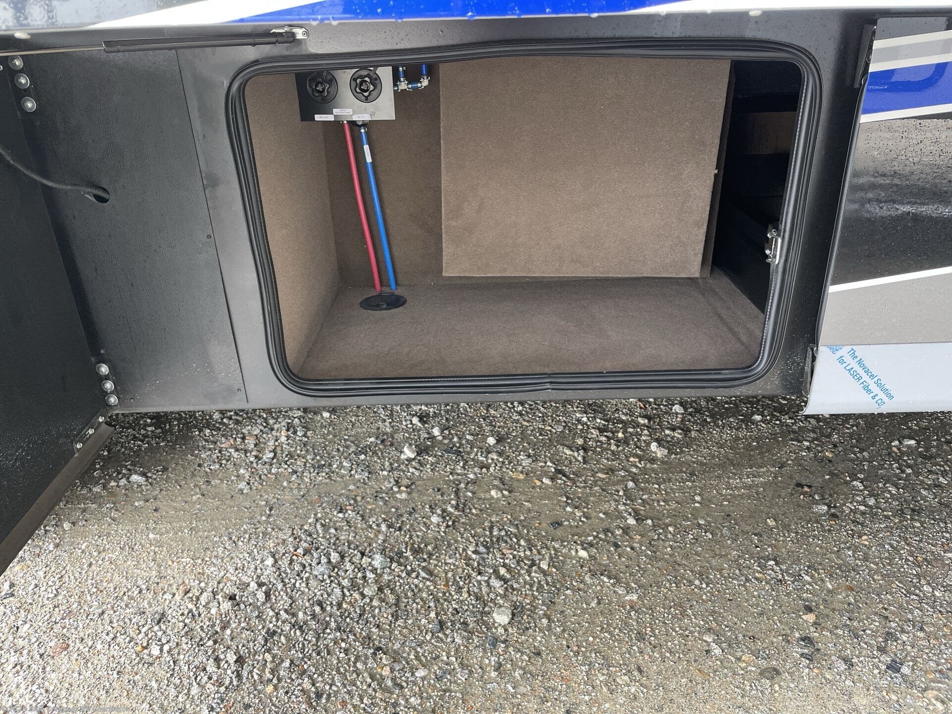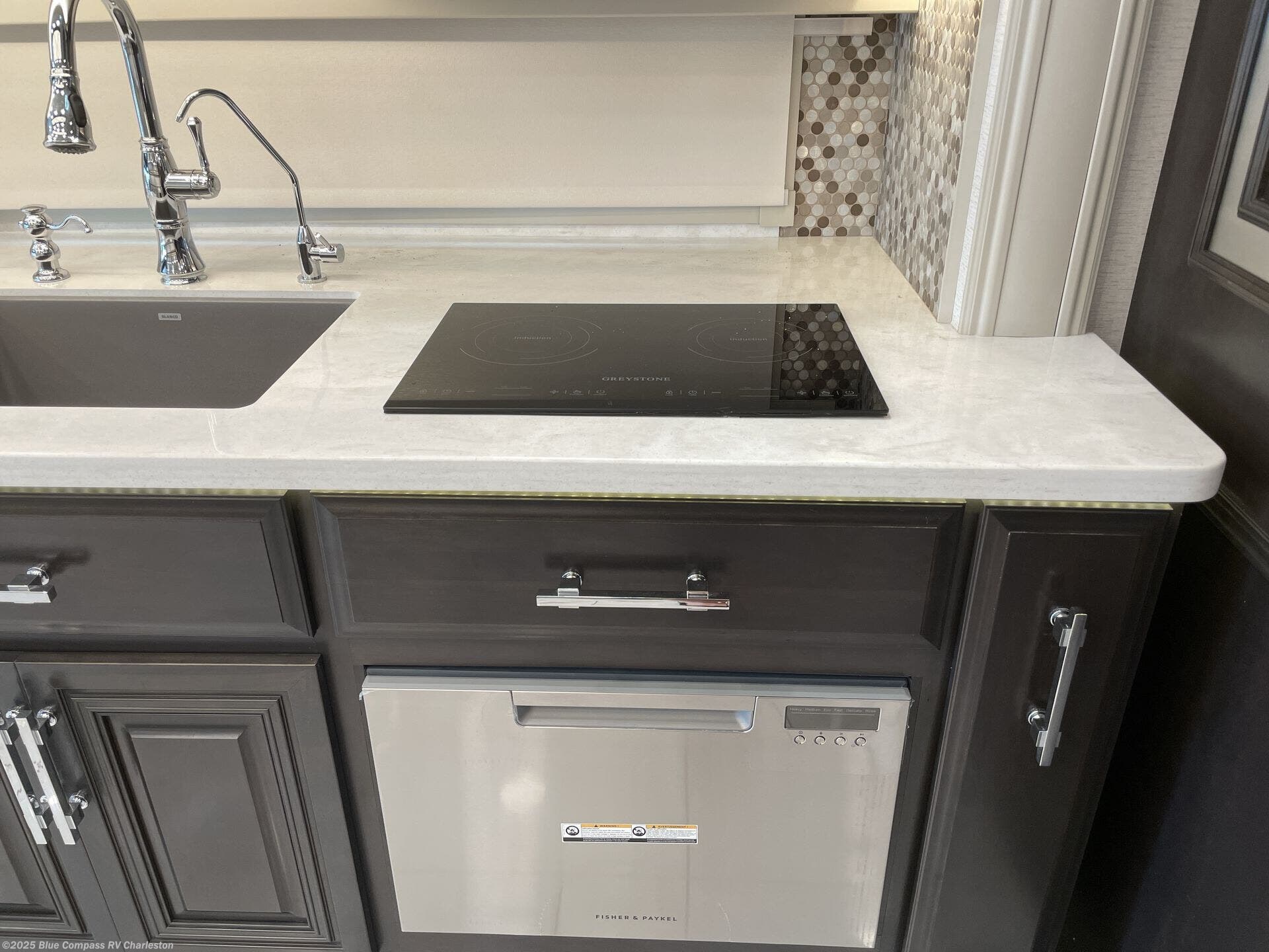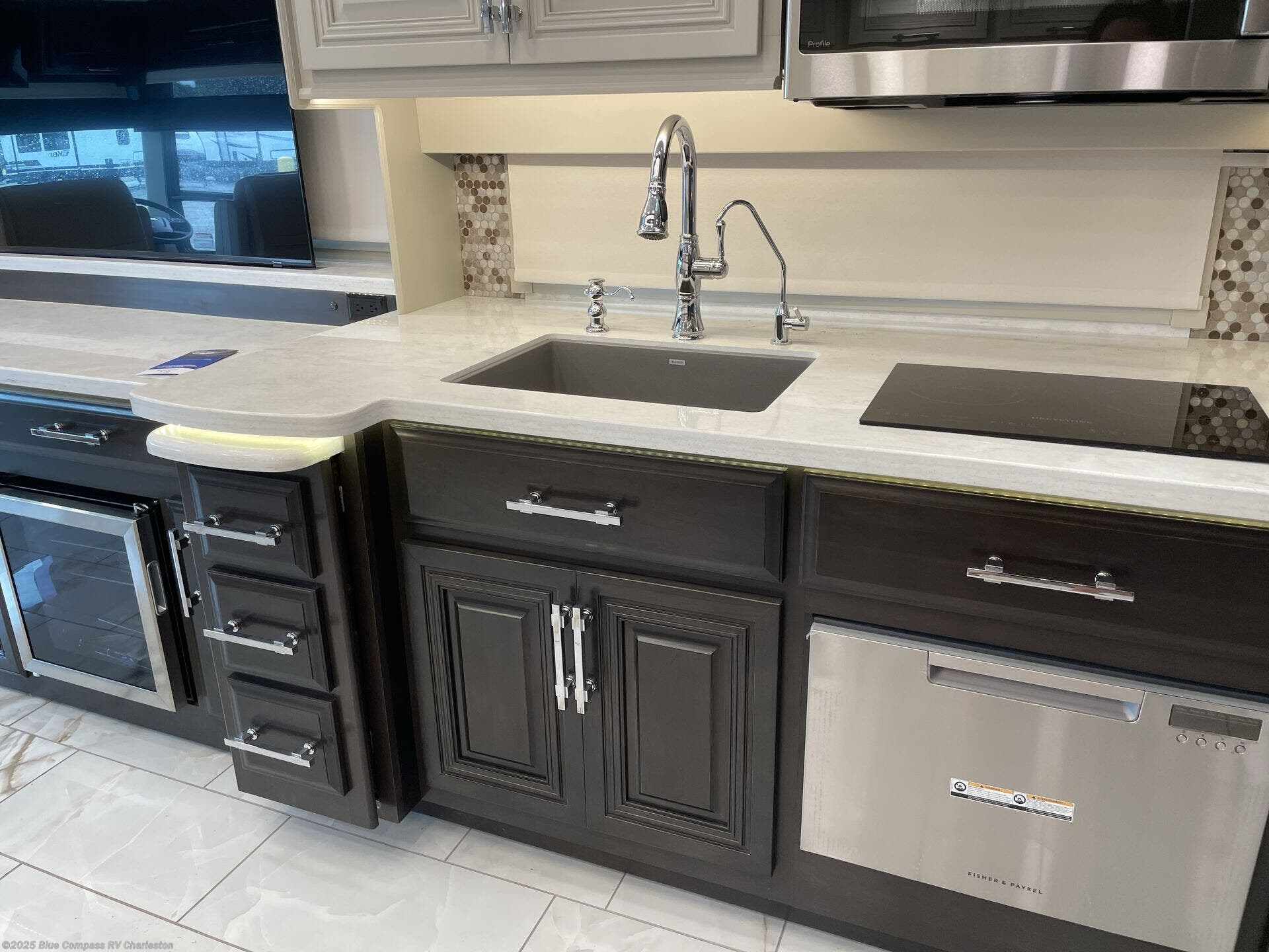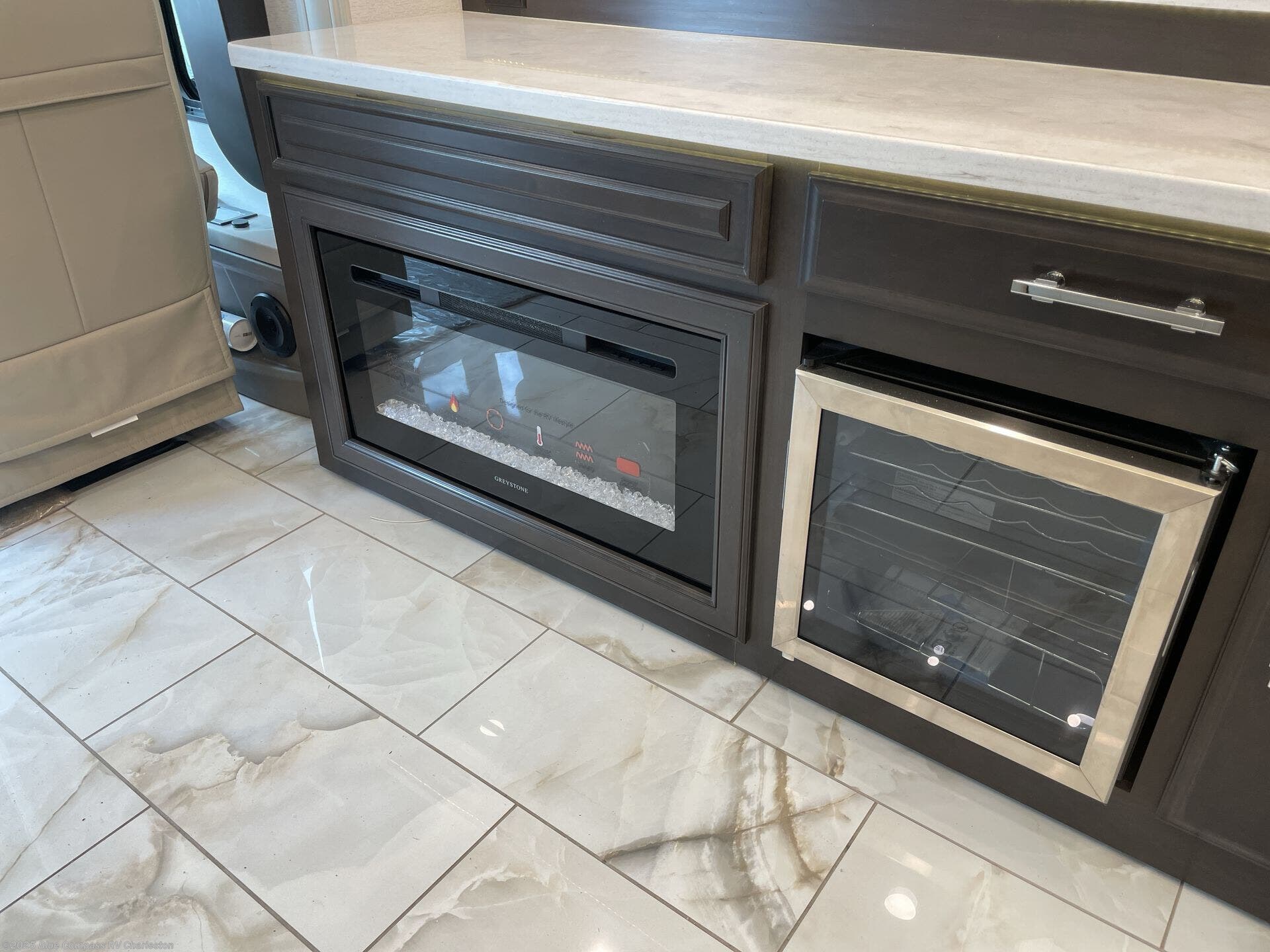 Comfortable traveling and living can be found in this coach with a master suite that includes a slide out king bed, dual wardrobes, drawers for storage and a 43" Smart TV, plus a full bathroom with a dual sink vanity. There is also a huge walk-in wardrobe with more storage areas plus a washer and dryer to keep everything clean while away. There is a mid-coach half bath for convenience, and the combined living and kitchen area offers full kitchen amenities such as a convection microwave, a Fisher & Paykel dishwasher, slide-out storage trays in the overhead cabinet, a buffet/table and two chairs to dine or work from. You'll also enjoy power theater seating while watching one of two Smart TVs in this area, plus a hide-a-bed sofa. There are options to change out the furniture if you wish such as a booth dinette, a 74" sofa with ottomans, and/or another hide-a-bed sofa with the desk/fireplace entertainment center option.
