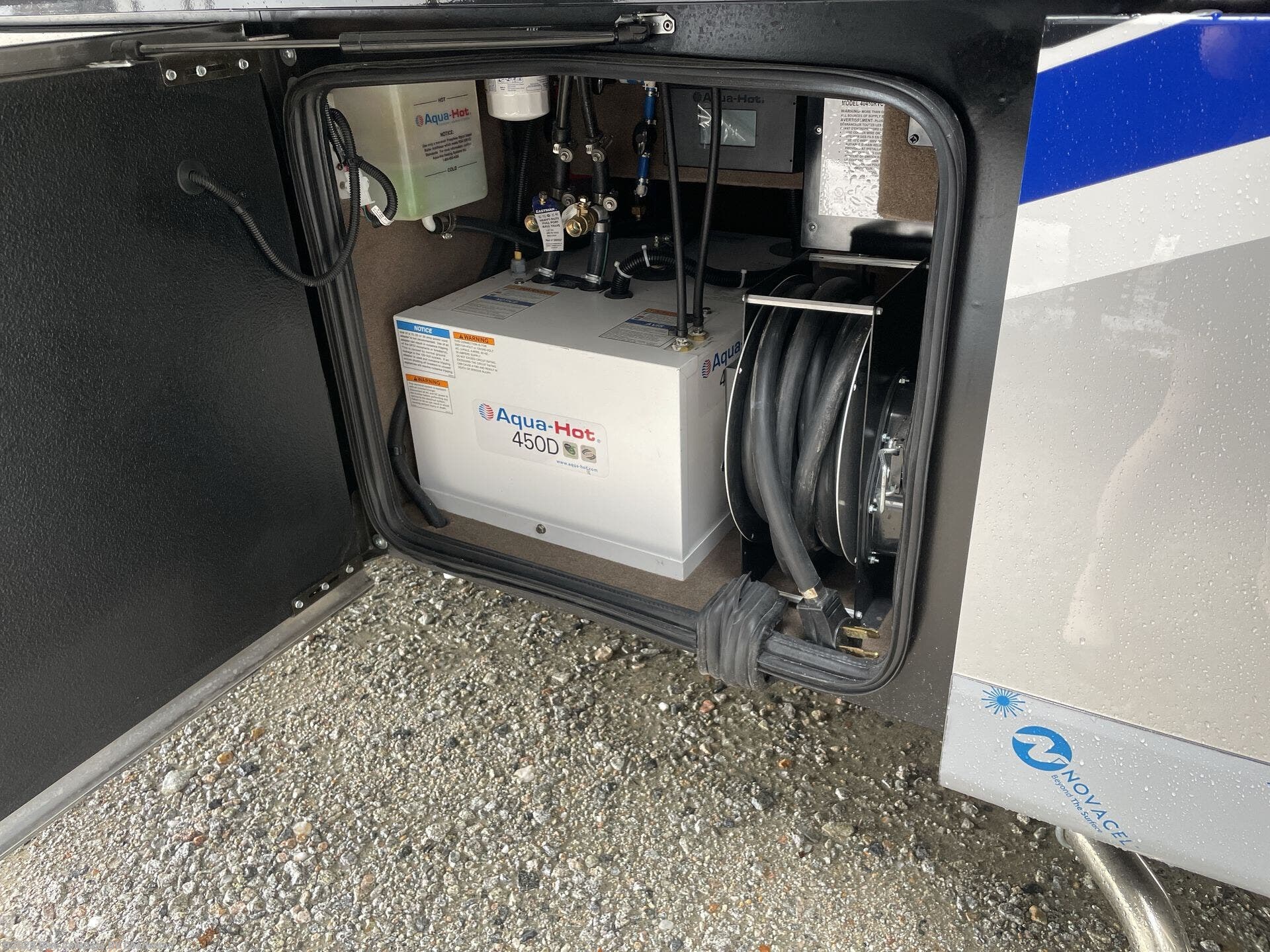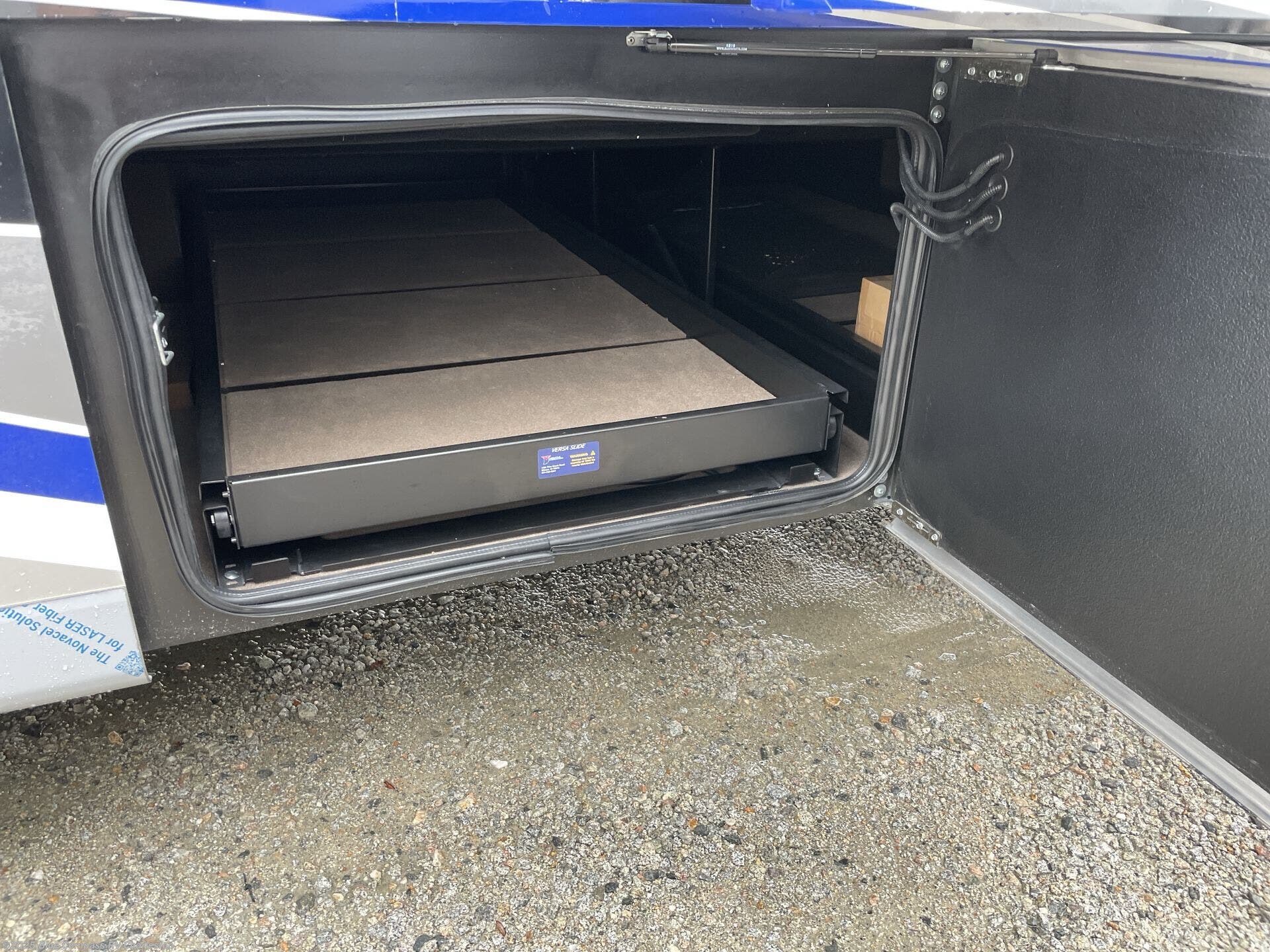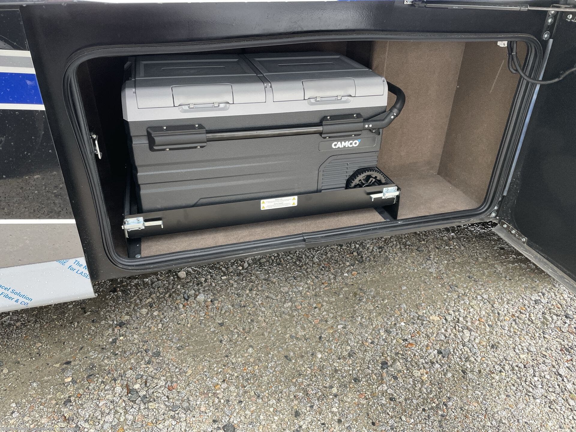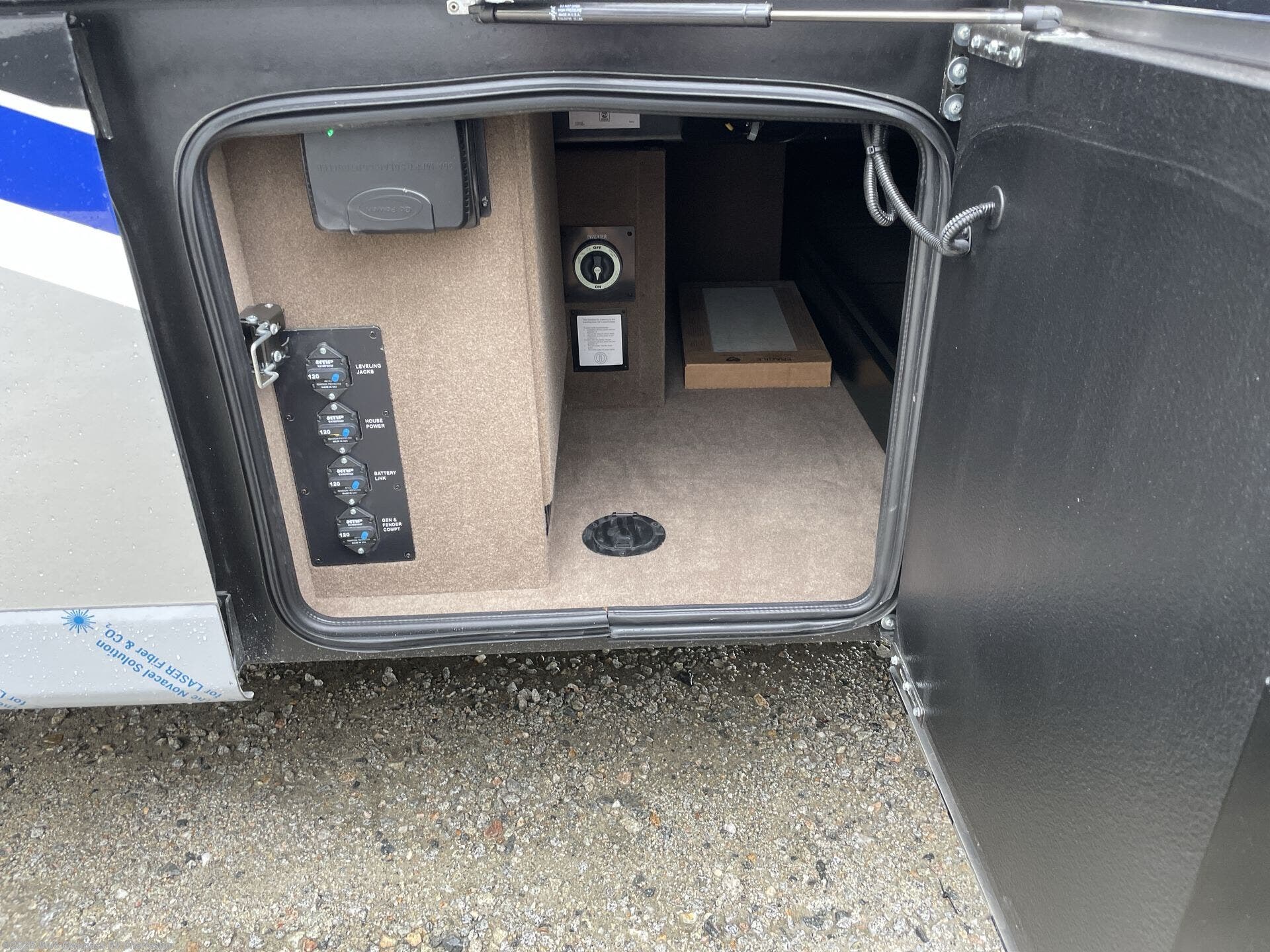 Comfortable traveling and living can be found in this coach with a master suite that includes a slide out king bed, dual wardrobes, drawers for storage and a 43" Smart TV, plus a full bathroom with a dual sink vanity. There is also a huge walk-in wardrobe with more storage areas plus a washer and dryer to keep everything clean while away. There is a mid-coach half bath for convenience, and the combined living and kitchen area offers full kitchen amenities such as a convection microwave, a Fisher & Paykel dishwasher, slide-out storage trays in the overhead cabinet, a buffet/table and two chairs to dine or work from. You'll also enjoy power theater seating while watching one of two Smart TVs in this area, plus a hide-a-bed sofa. There are options to change out the furniture if you wish such as a booth dinette, a 74" sofa with ottomans, and/or another hide-a-bed sofa with the desk/fireplace entertainment center option.