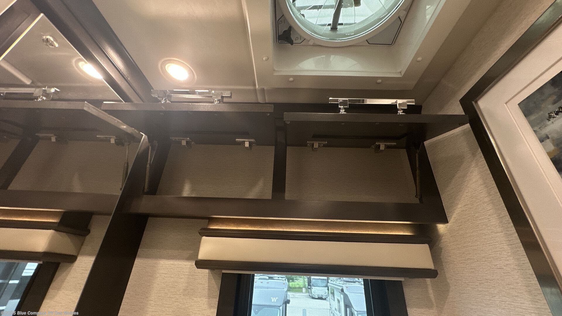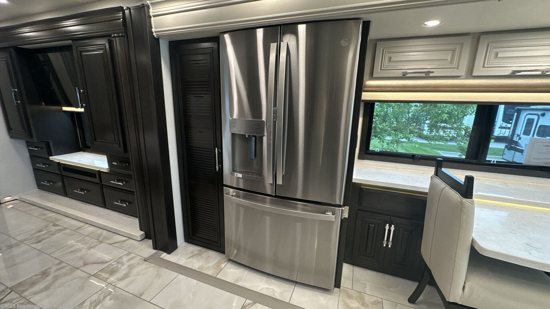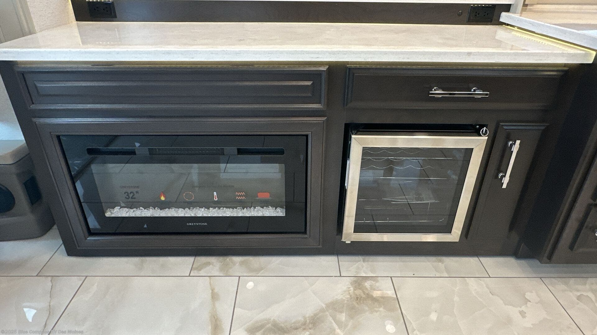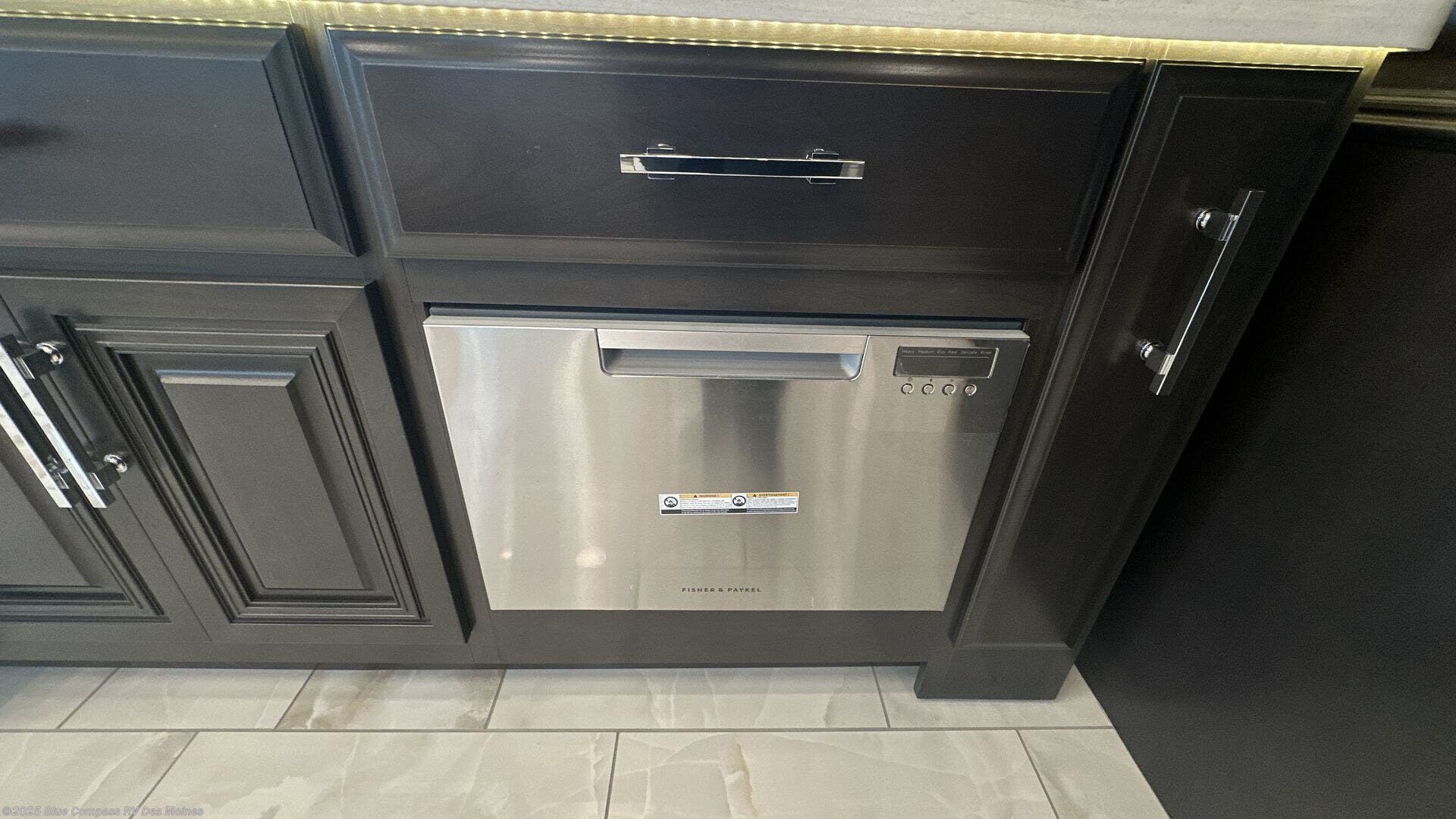 Comfortable traveling and living can be found in this coach with a master suite that includes a slide out king bed, dual wardrobes, drawers for storage and a 43" Smart TV, plus a full bathroom with a dual sink vanity. There is also a huge walk-in wardrobe with more storage areas plus a washer and dryer to keep everything clean while away. There is a mid-coach half bath for convenience, and the combined living and kitchen area offers full kitchen amenities such as a convection microwave, a Fisher & Paykel dishwasher, slide-out storage trays in the overhead cabinet, a buffet/table and two chairs to dine or work from. You'll also enjoy power theater seating while watching one of two Smart TVs in this area, plus a hide-a-bed sofa. There are options to change out the furniture if you wish such as a booth dinette, a 74" sofa with ottomans, and/or another hide-a-bed sofa with the desk/fireplace entertainment center option.