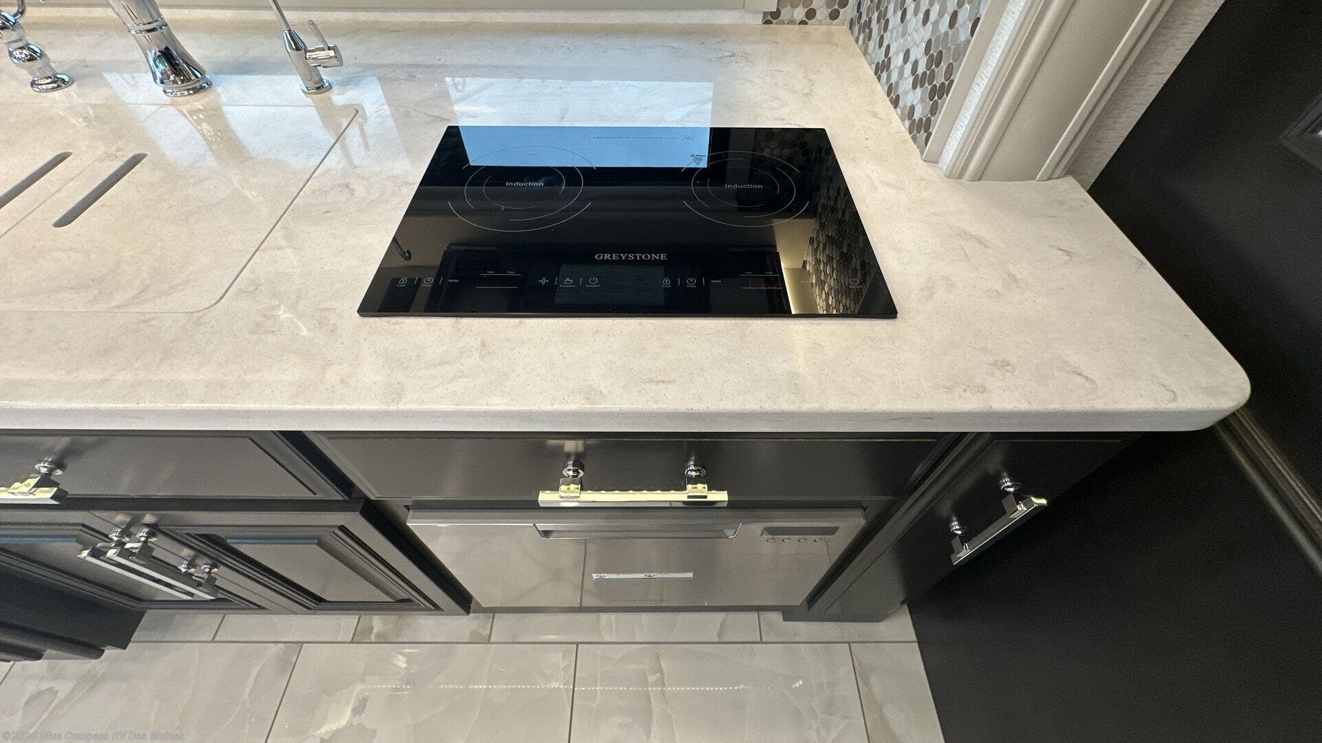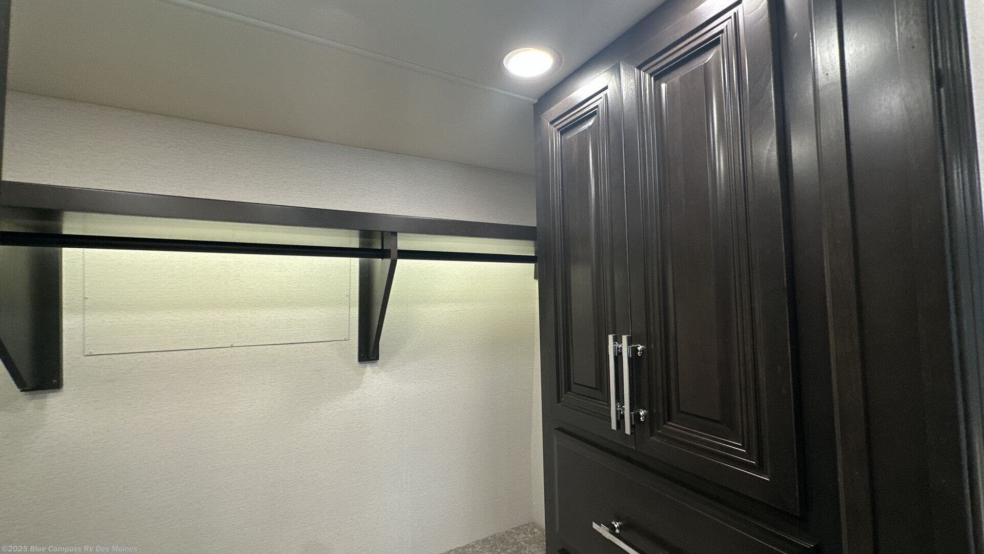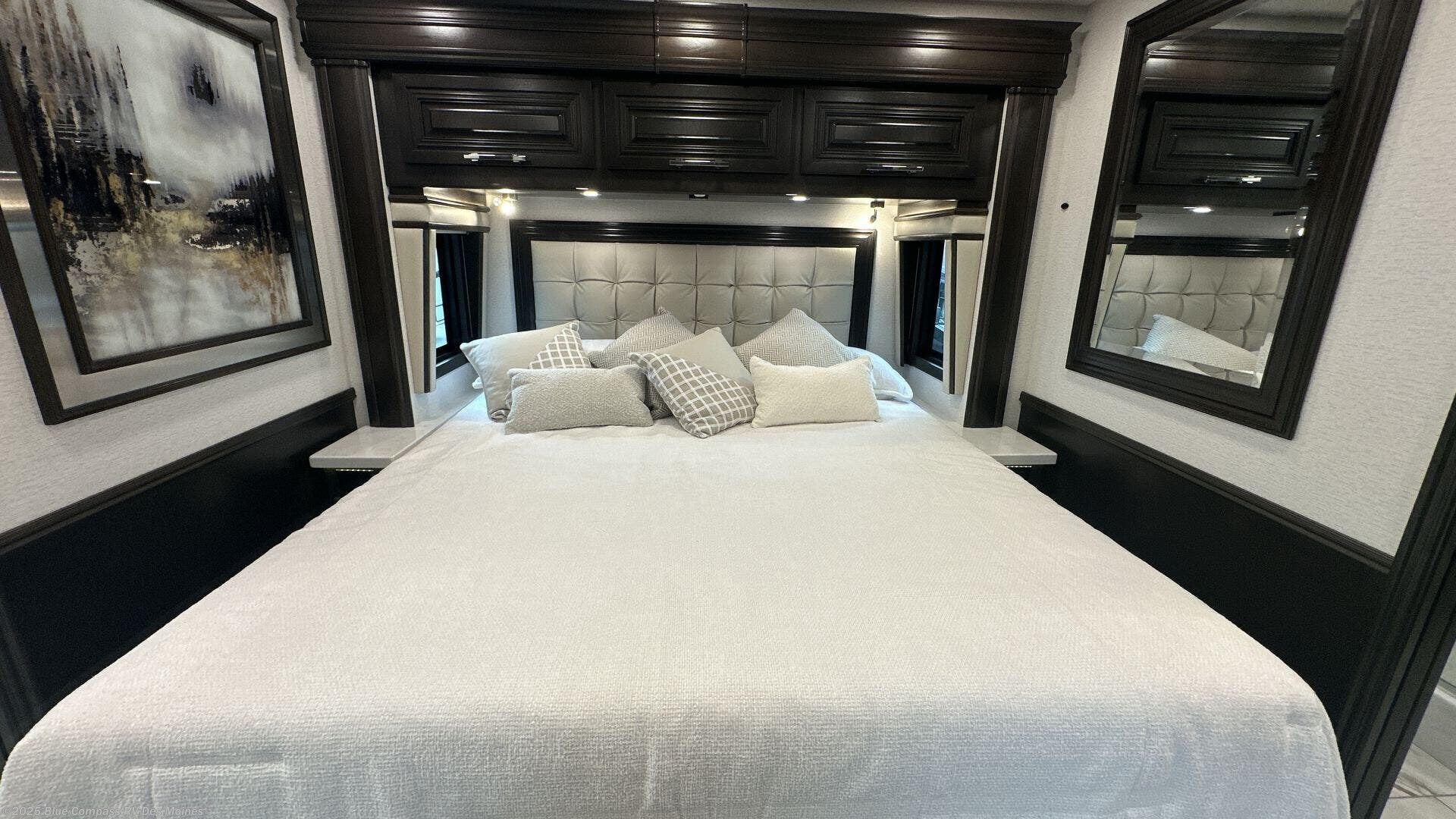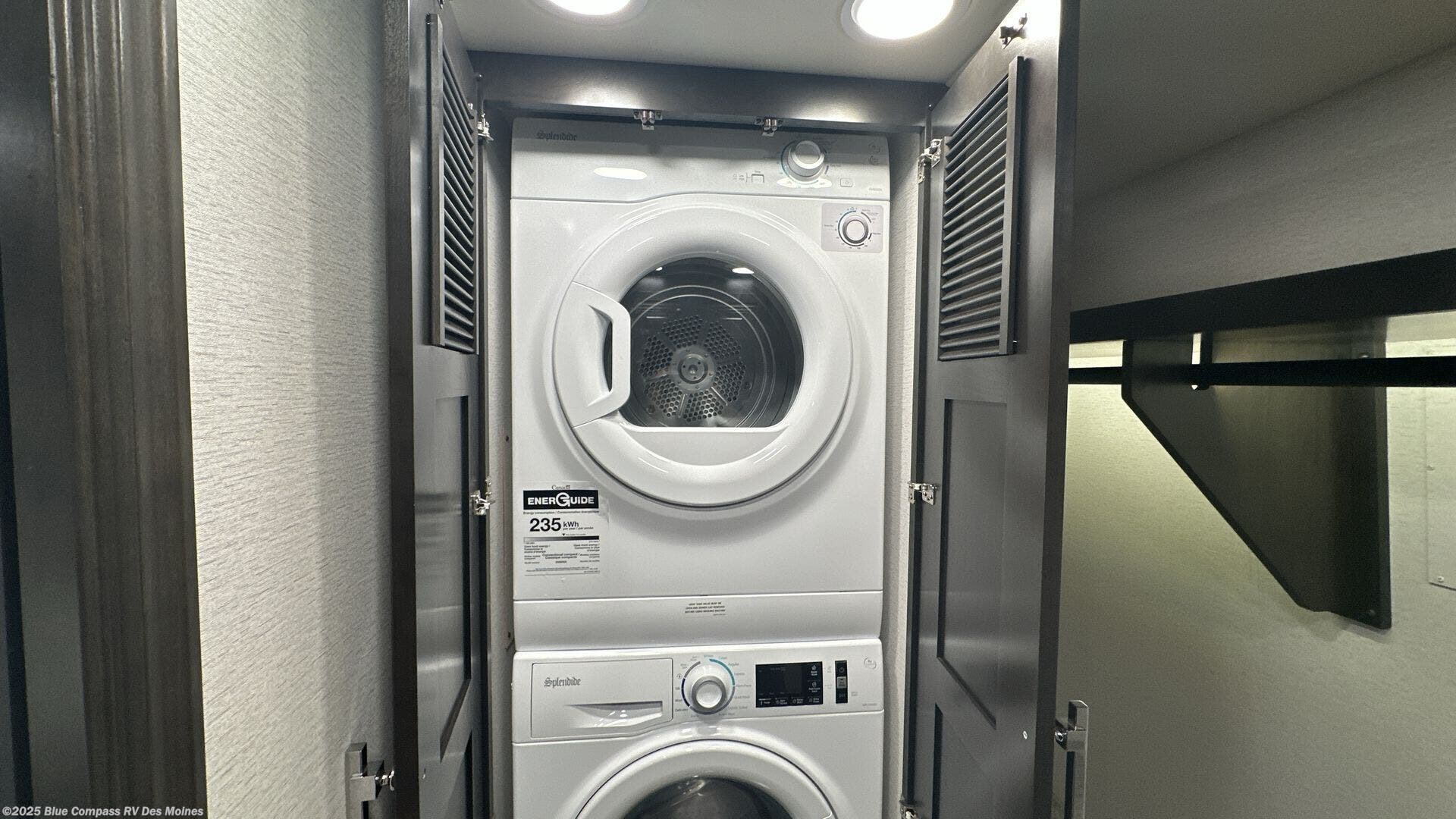 Comfortable traveling and living can be found in this coach with a master suite that includes a slide out king bed, dual wardrobes, drawers for storage and a 43" Smart TV, plus a full bathroom with a dual sink vanity. There is also a huge walk-in wardrobe with more storage areas plus a washer and dryer to keep everything clean while away. There is a mid-coach half bath for convenience, and the combined living and kitchen area offers full kitchen amenities such as a convection microwave, a Fisher & Paykel dishwasher, slide-out storage trays in the overhead cabinet, a buffet/table and two chairs to dine or work from. You'll also enjoy power theater seating while watching one of two Smart TVs in this area, plus a hide-a-bed sofa. There are options to change out the furniture if you wish such as a booth dinette, a 74" sofa with ottomans, and/or another hide-a-bed sofa with the desk/fireplace entertainment center option.