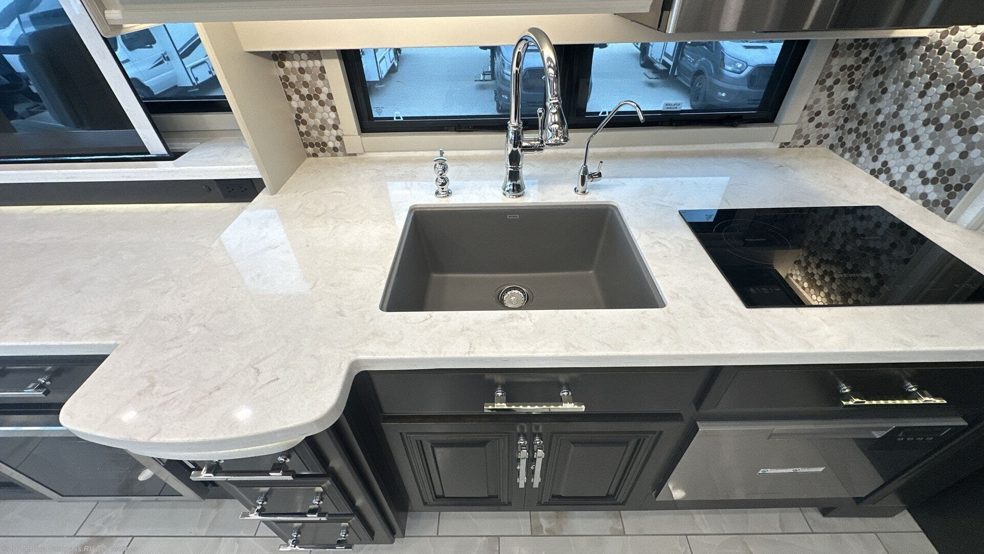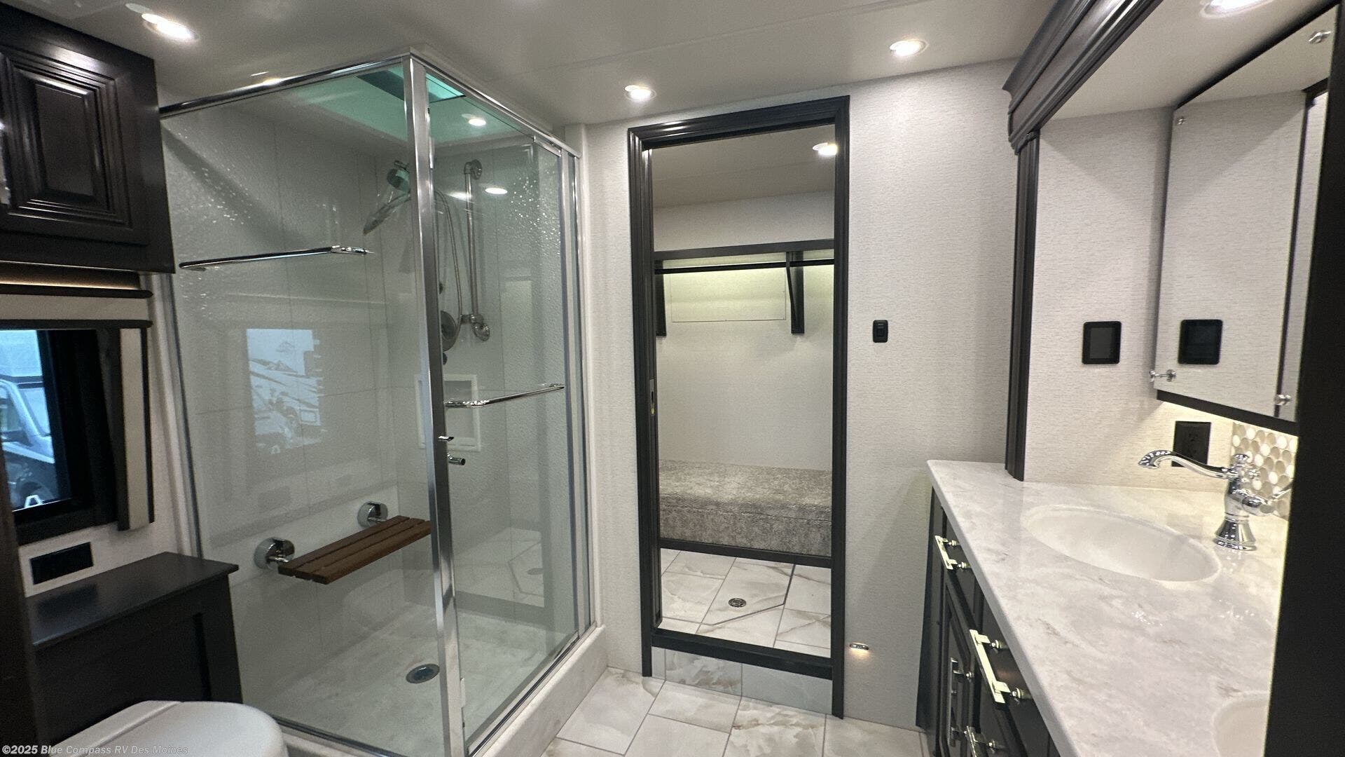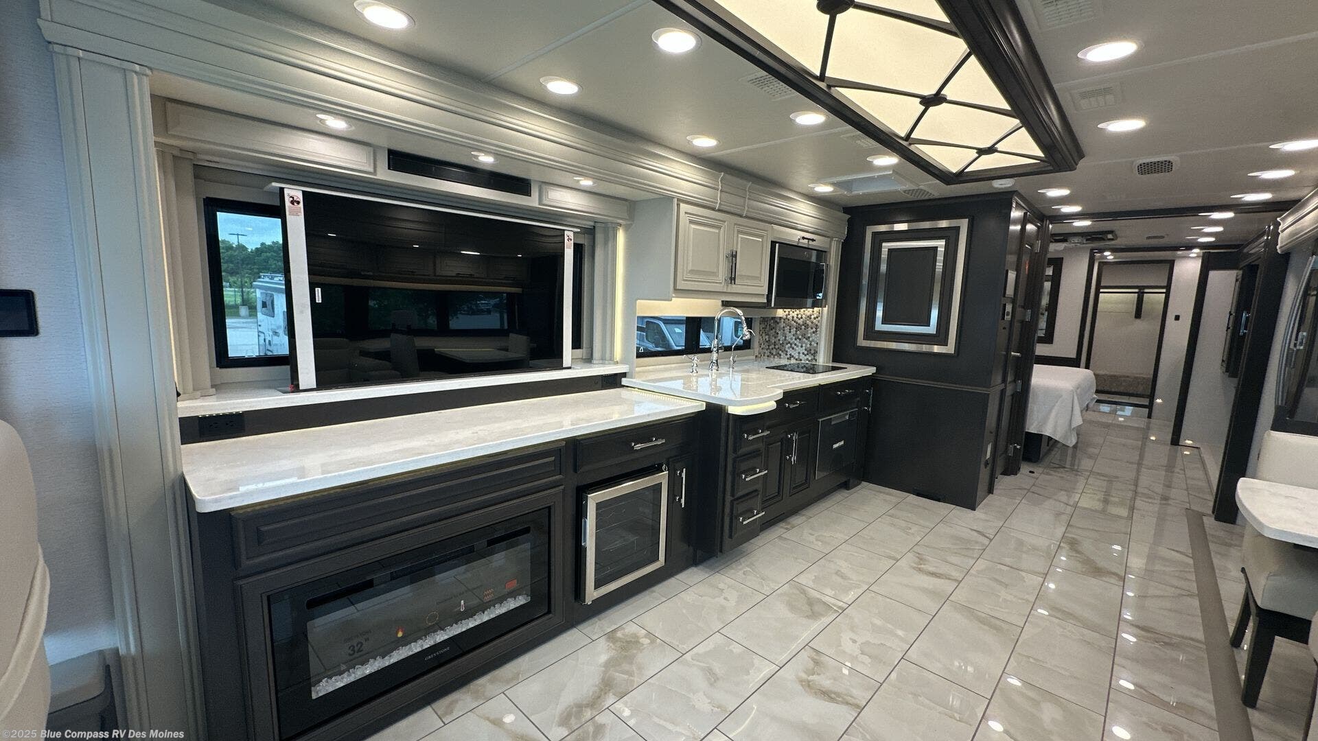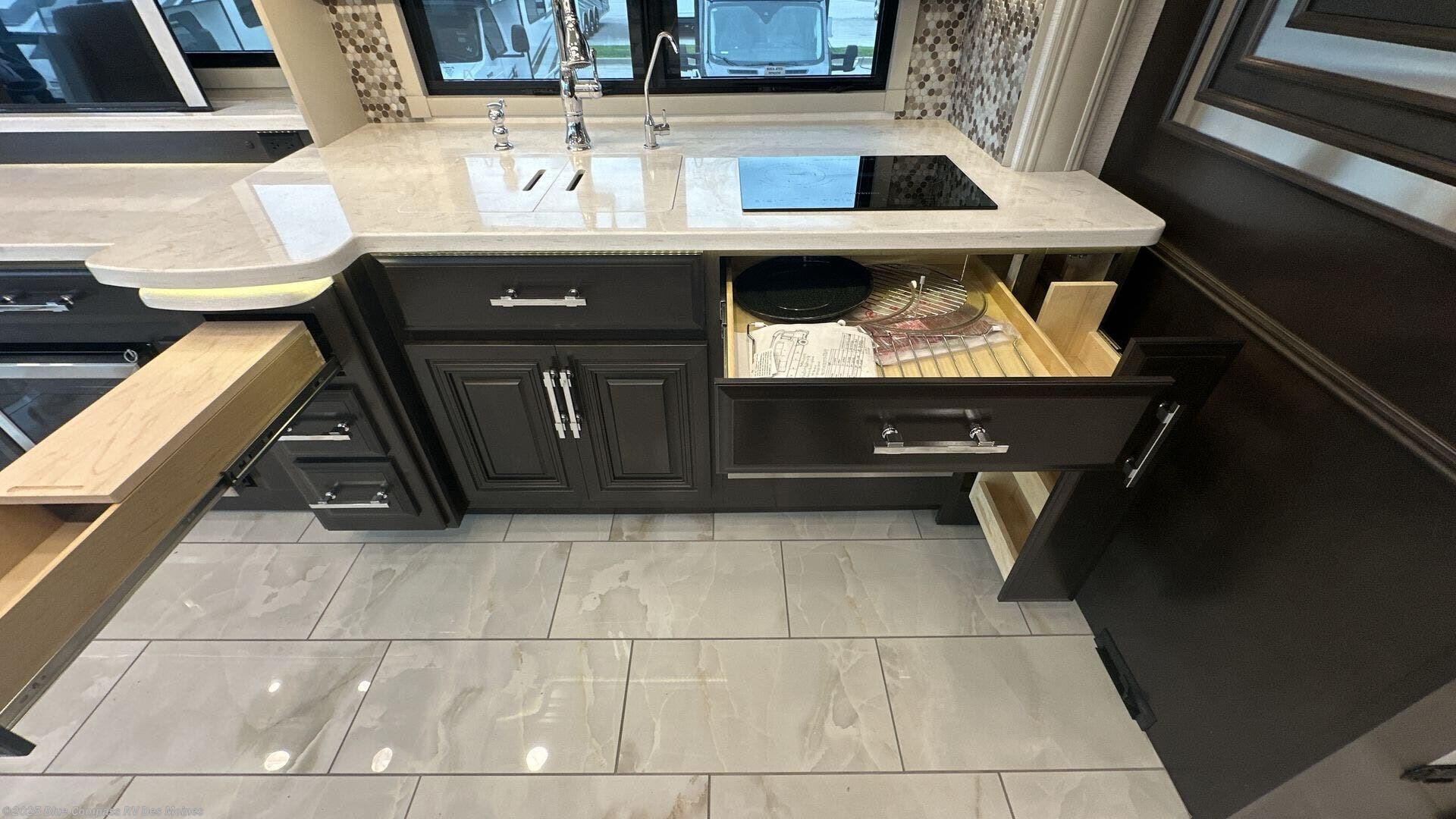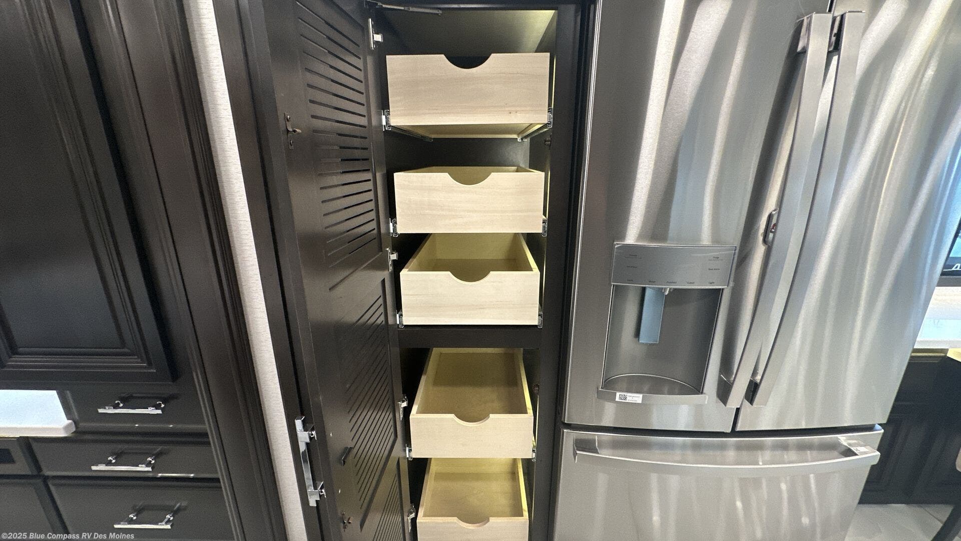 Comfortable traveling and living can be found in this coach with a master suite that includes a slide out king bed, dual wardrobes, drawers for storage and a 43" Smart TV, plus a full bathroom with a dual sink vanity. There is also a huge walk-in wardrobe with more storage areas plus a washer and dryer to keep everything clean while away. There is a mid-coach half bath for convenience, and the combined living and kitchen area offers full kitchen amenities such as a convection microwave, a Fisher & Paykel dishwasher, slide-out storage trays in the overhead cabinet, a buffet/table and two chairs to dine or work from. You'll also enjoy power theater seating while watching one of two Smart TVs in this area, plus a hide-a-bed sofa. There are options to change out the furniture if you wish such as a booth dinette, a 74" sofa with ottomans, and/or another hide-a-bed sofa with the desk/fireplace entertainment center option.