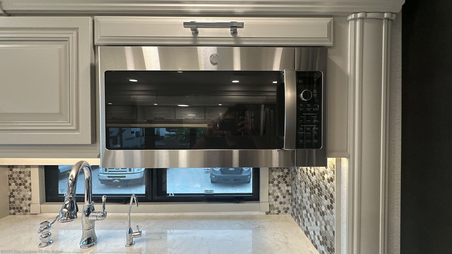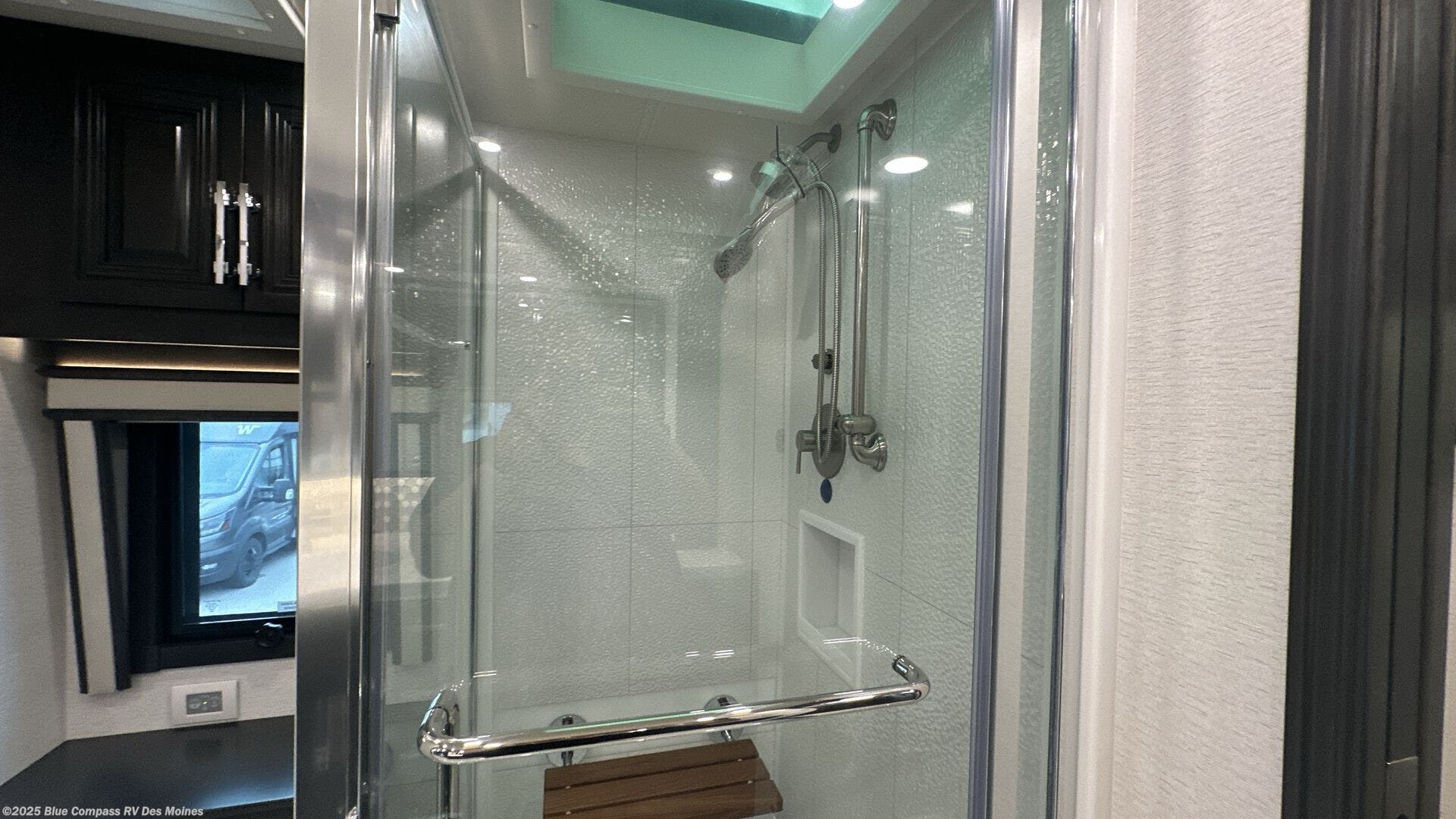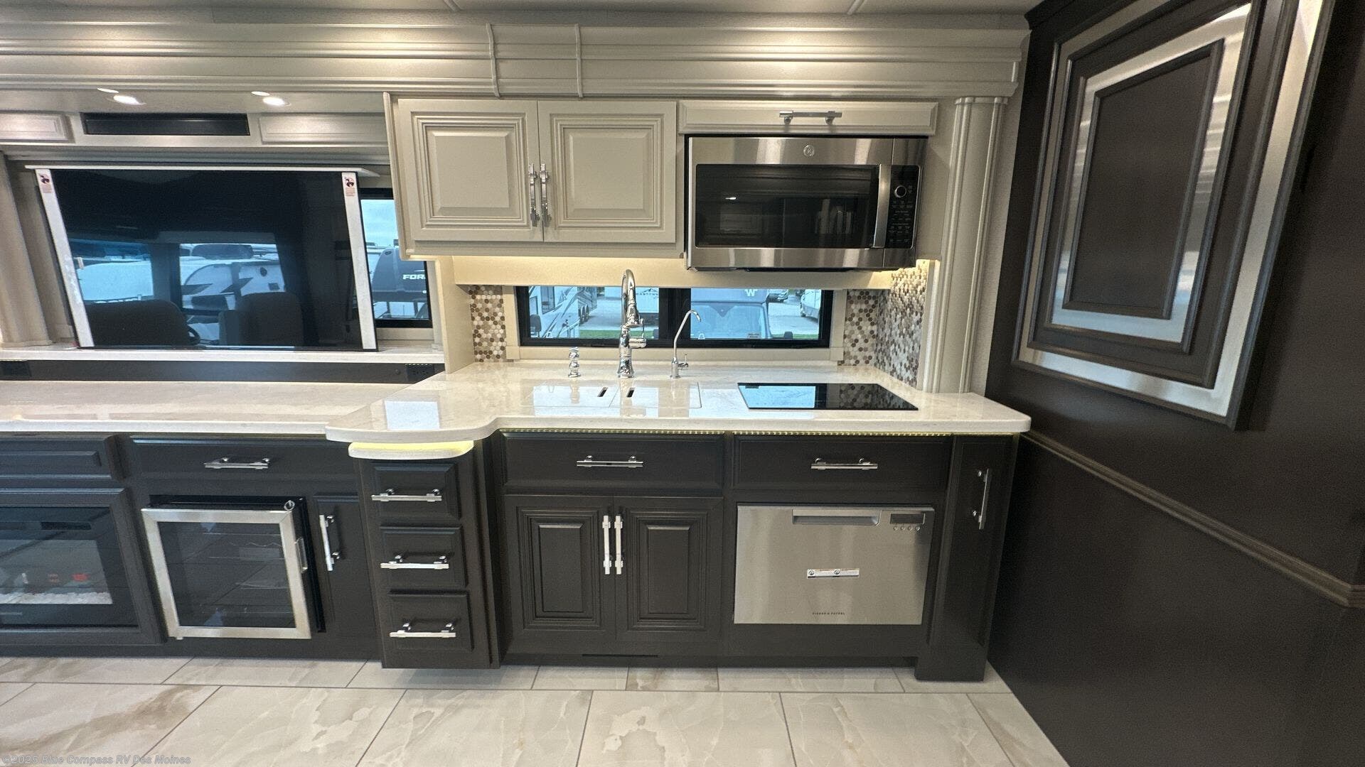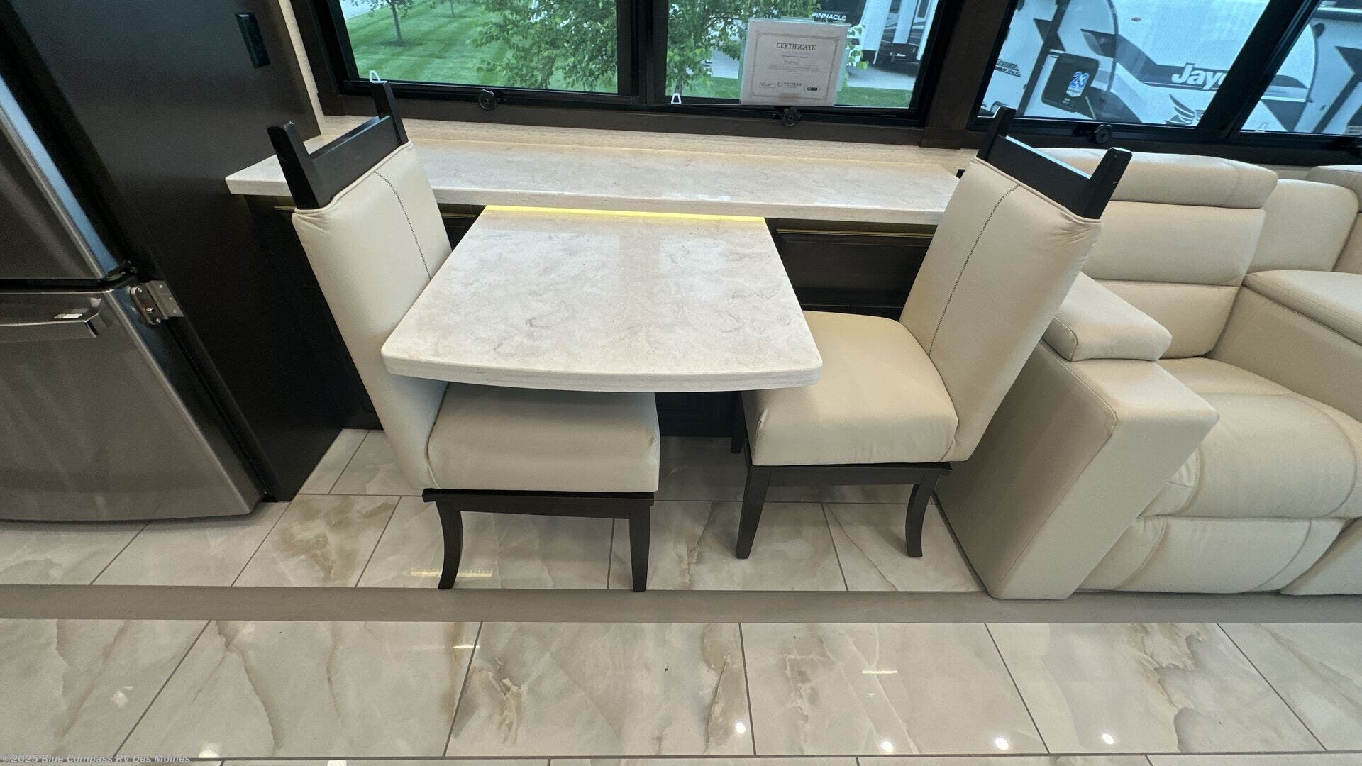 Comfortable traveling and living can be found in this coach with a master suite that includes a slide out king bed, dual wardrobes, drawers for storage and a 43" Smart TV, plus a full bathroom with a dual sink vanity. There is also a huge walk-in wardrobe with more storage areas plus a washer and dryer to keep everything clean while away. There is a mid-coach half bath for convenience, and the combined living and kitchen area offers full kitchen amenities such as a convection microwave, a Fisher & Paykel dishwasher, slide-out storage trays in the overhead cabinet, a buffet/table and two chairs to dine or work from. You'll also enjoy power theater seating while watching one of two Smart TVs in this area, plus a hide-a-bed sofa. There are options to change out the furniture if you wish such as a booth dinette, a 74" sofa with ottomans, and/or another hide-a-bed sofa with the desk/fireplace entertainment center option.