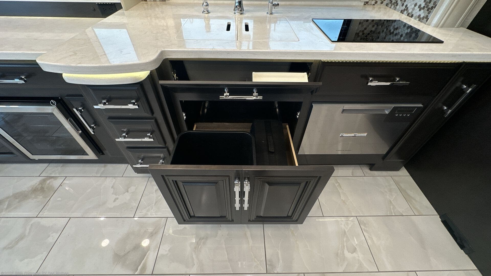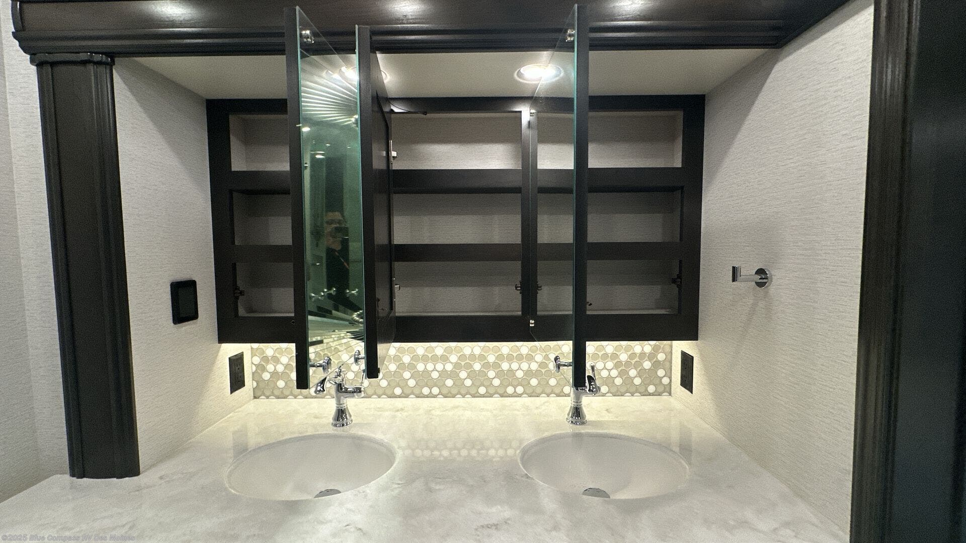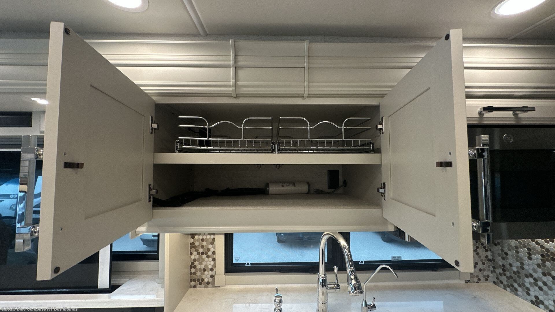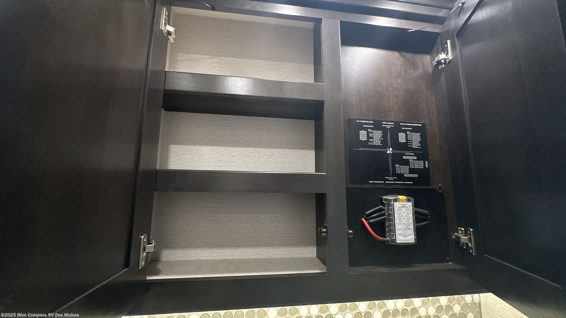 Comfortable traveling and living can be found in this coach with a master suite that includes a slide out king bed, dual wardrobes, drawers for storage and a 43" Smart TV, plus a full bathroom with a dual sink vanity. There is also a huge walk-in wardrobe with more storage areas plus a washer and dryer to keep everything clean while away. There is a mid-coach half bath for convenience, and the combined living and kitchen area offers full kitchen amenities such as a convection microwave, a Fisher & Paykel dishwasher, slide-out storage trays in the overhead cabinet, a buffet/table and two chairs to dine or work from. You'll also enjoy power theater seating while watching one of two Smart TVs in this area, plus a hide-a-bed sofa. There are options to change out the furniture if you wish such as a booth dinette, a 74" sofa with ottomans, and/or another hide-a-bed sofa with the desk/fireplace entertainment center option.