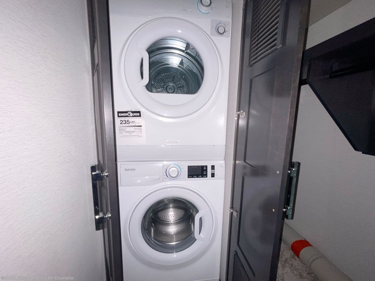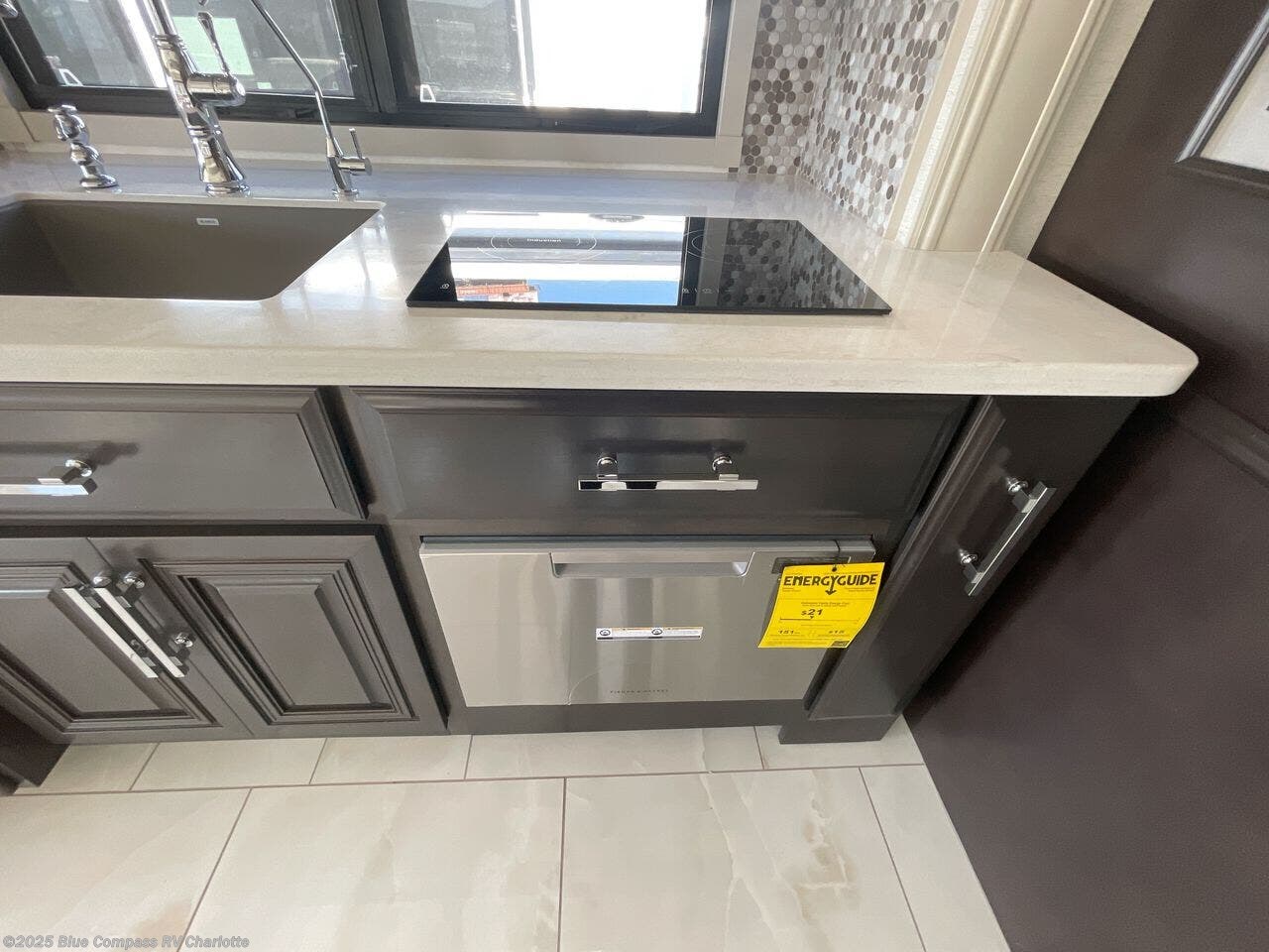 Comfortable traveling and living can be found in this coach with a master suite that includes a slide out king bed, dual wardrobes, drawers for storage and a 43" Smart TV, plus a full bathroom with a dual sink vanity. There is also a huge walk-in wardrobe with more storage areas plus a washer and dryer to keep everything clean while away. There is a mid-coach half bath for convenience, and the combined living and kitchen area offers full kitchen amenities such as a convection microwave, a Fisher & Paykel dishwasher, slide-out storage trays in the overhead cabinet, a buffet/table and two chairs to dine or work from. You'll also enjoy power theater seating while watching one of two Smart TVs in this area, plus a hide-a-bed sofa. There are options to change out the furniture if you wish such as a booth dinette, a 74" sofa with ottomans, and/or another hide-a-bed sofa with the desk/fireplace entertainment center option.