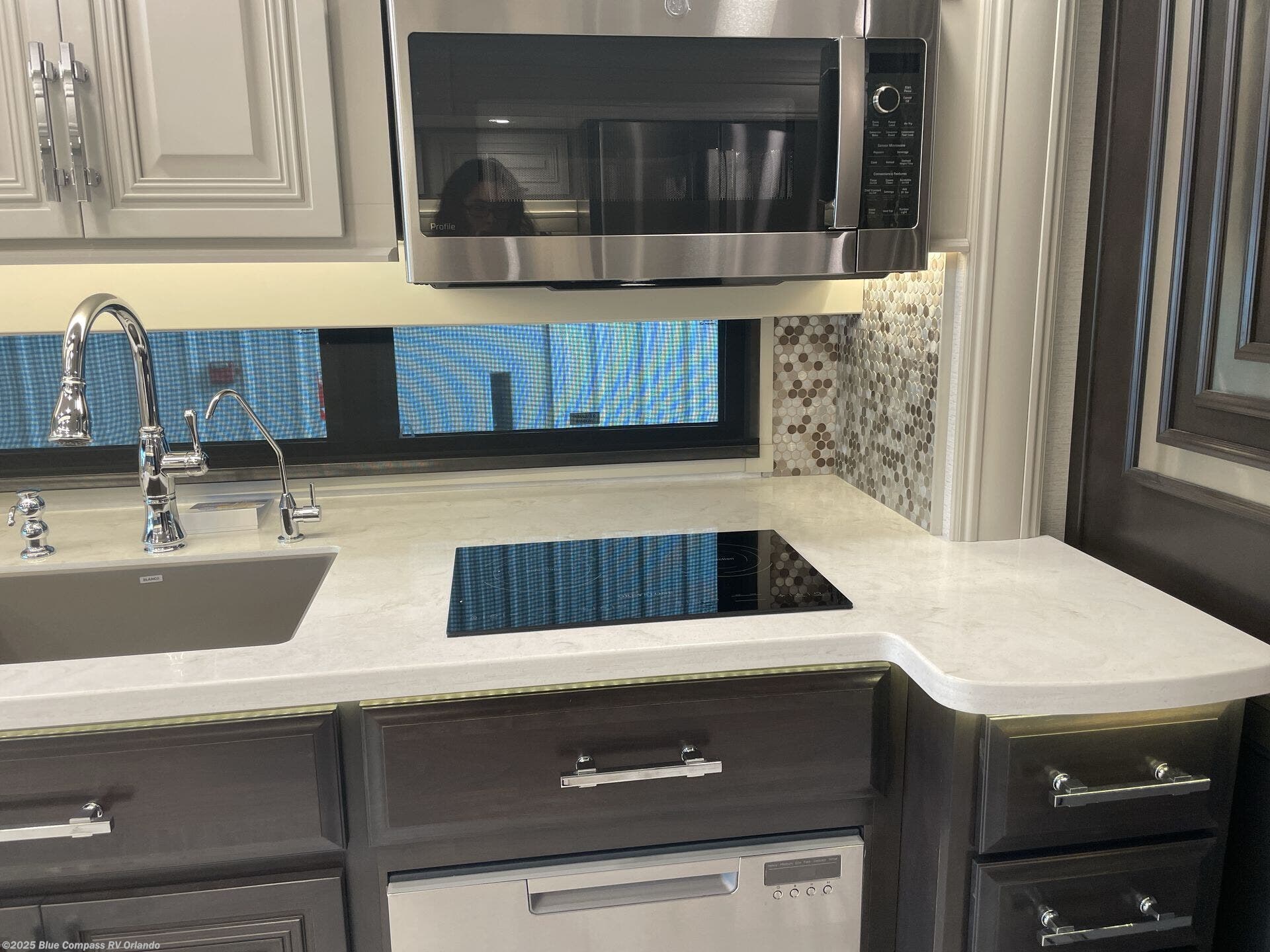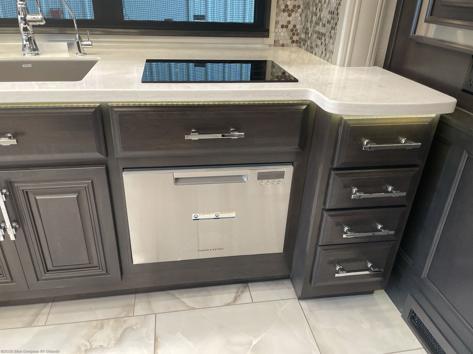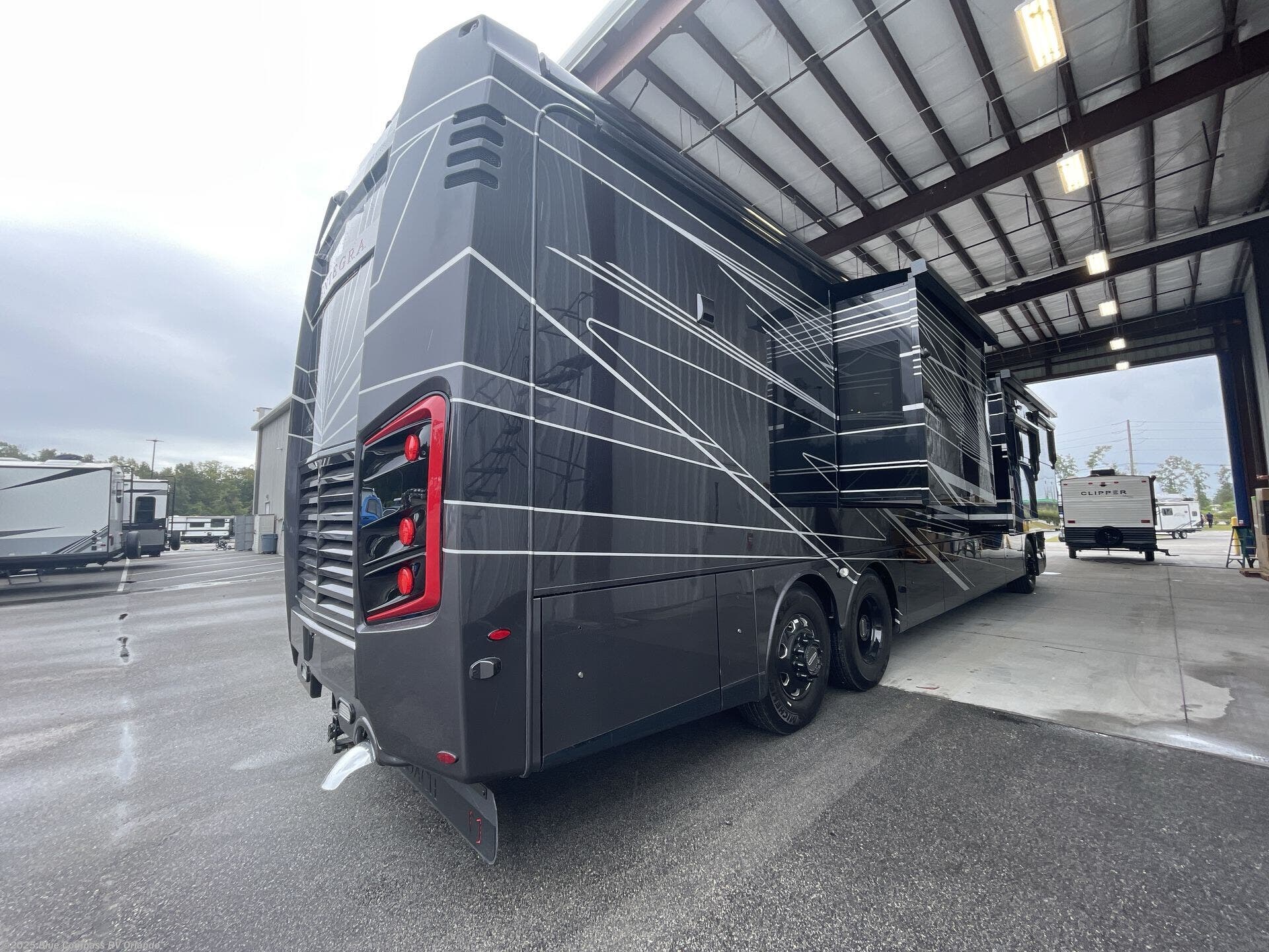 Whether you travel for work, to see family or explore the country side, this coach offers the power you want and the luxury you desire! Once at your destination, easily set up and relax on the three-seat power reclining sofa or choose the hide-a-bed sofa option, or eat a snack at the table. The 50" Smart TV and fireplace add coziness, the broom closet offers tidiness. The kitchen allows you to cook like at home with a convection microwave and induction cooktop, plus there is a Fisher & Paykel dishwasher for easy clean-up. There is a 32" Smart TV over the cab to watch as well, and a mid-coach half bath for convenience. The master suite offers a slide out king bed, sliding doors for privacy, wardrobes, and a 43" Smart TV to watch before bedtime. And the rear full bathroom offers a shower, a large wardrobe, plus a washer and dryer.