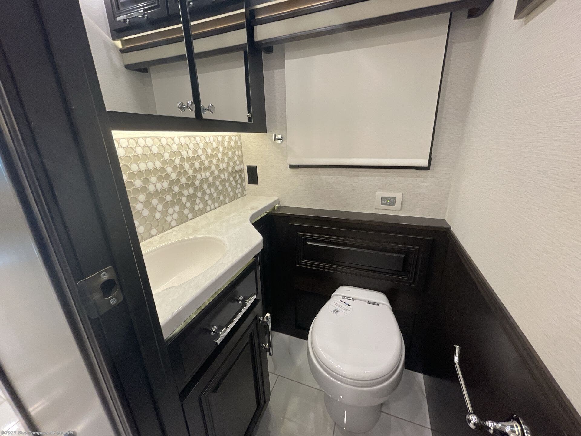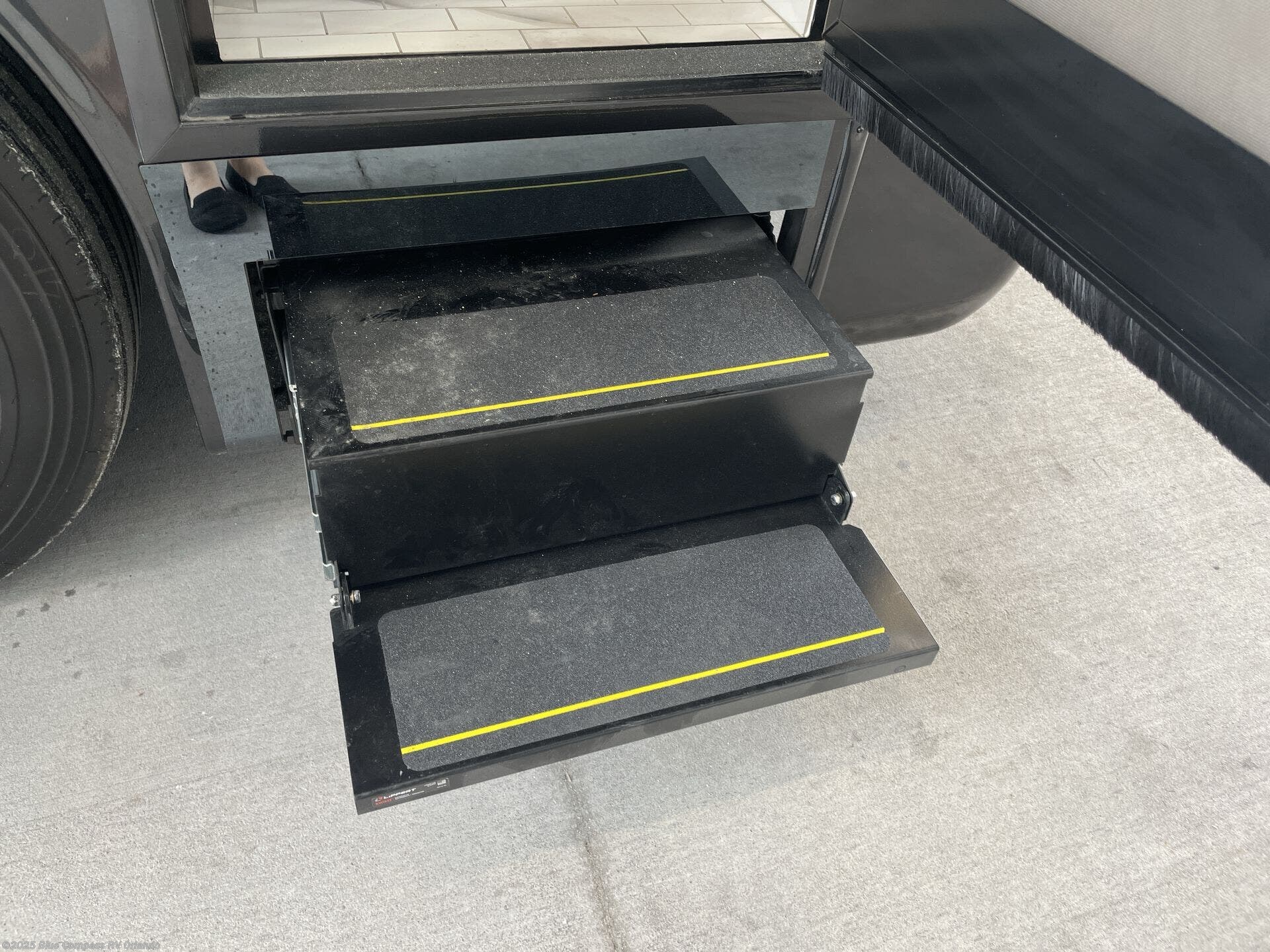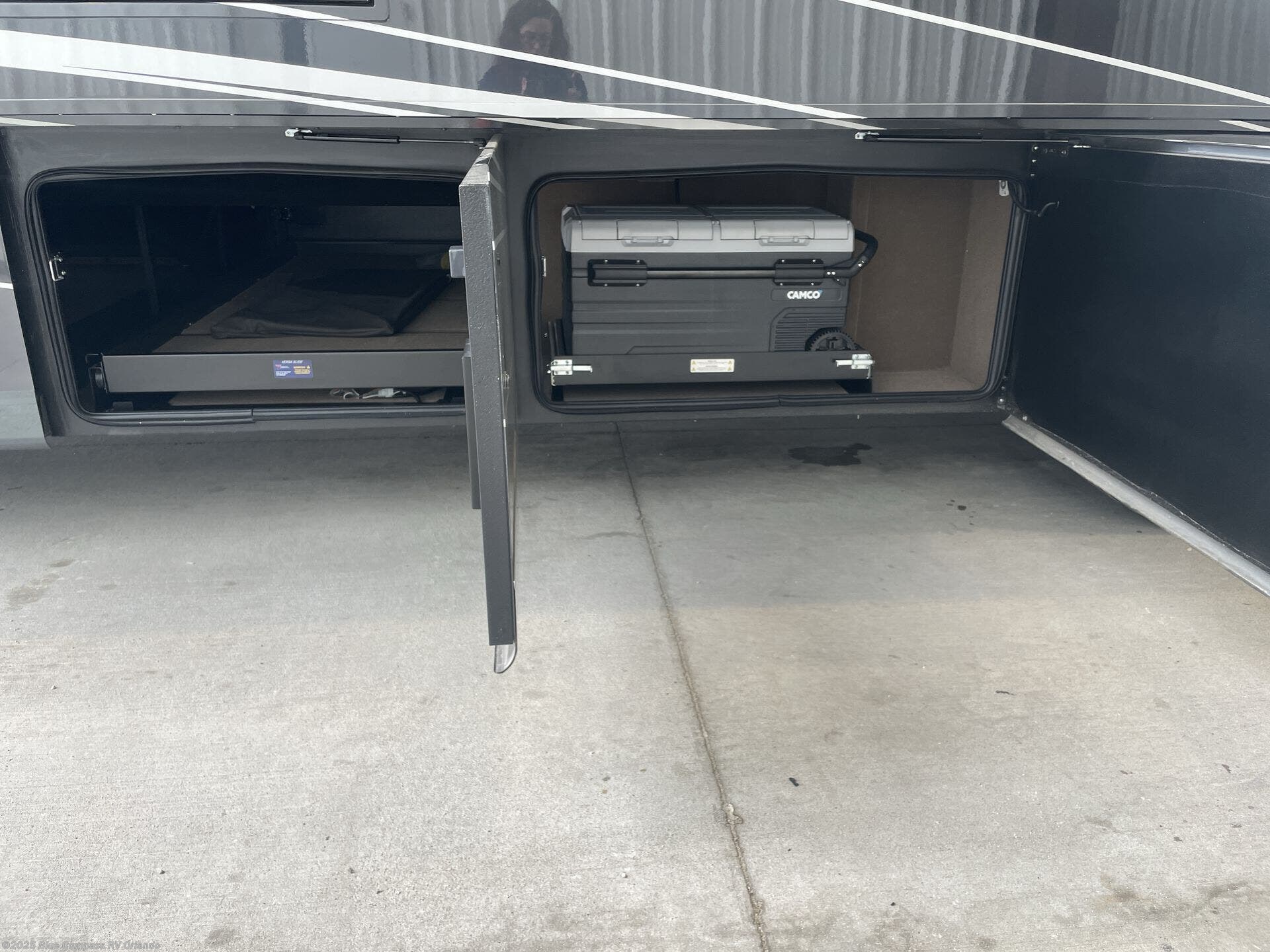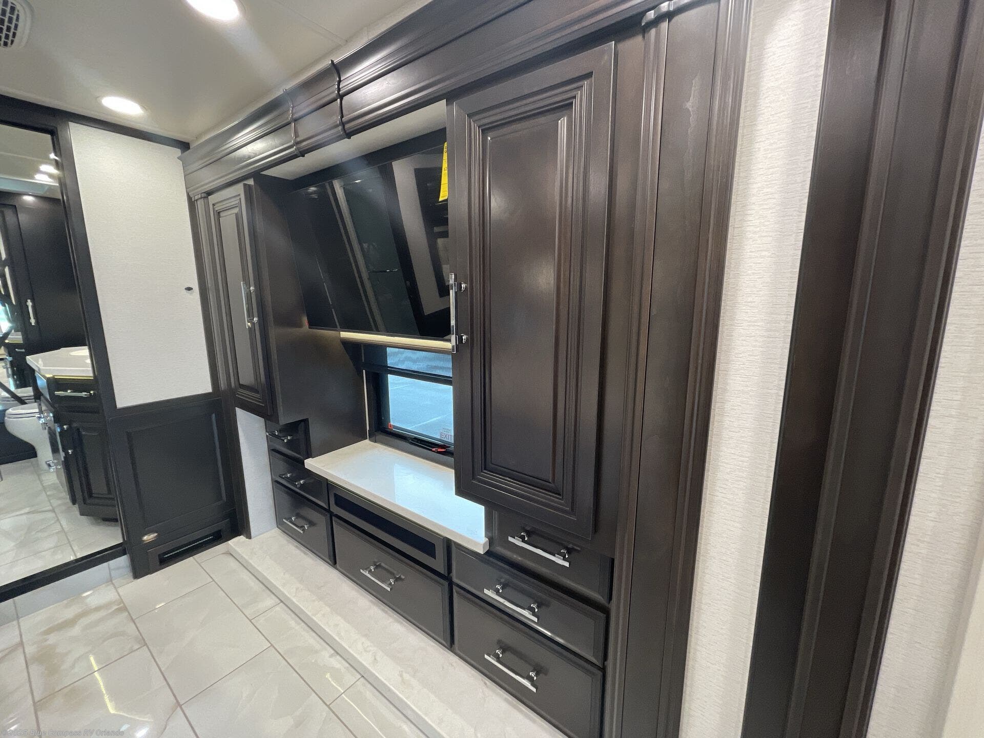 Whether you travel for work, to see family or explore the country side, this coach offers the power you want and the luxury you desire! Once at your destination, easily set up and relax on the three-seat power reclining sofa or choose the hide-a-bed sofa option, or eat a snack at the table. The 50" Smart TV and fireplace add coziness, the broom closet offers tidiness. The kitchen allows you to cook like at home with a convection microwave and induction cooktop, plus there is a Fisher & Paykel dishwasher for easy clean-up. There is a 32" Smart TV over the cab to watch as well, and a mid-coach half bath for convenience. The master suite offers a slide out king bed, sliding doors for privacy, wardrobes, and a 43" Smart TV to watch before bedtime. And the rear full bathroom offers a shower, a large wardrobe, plus a washer and dryer.