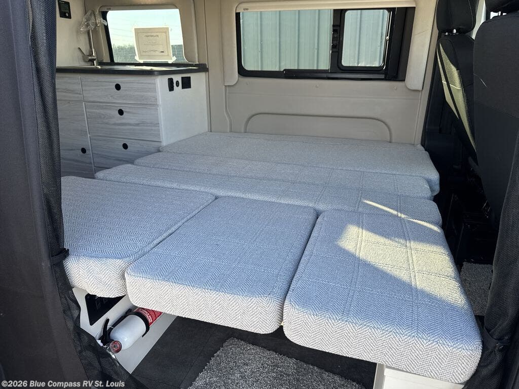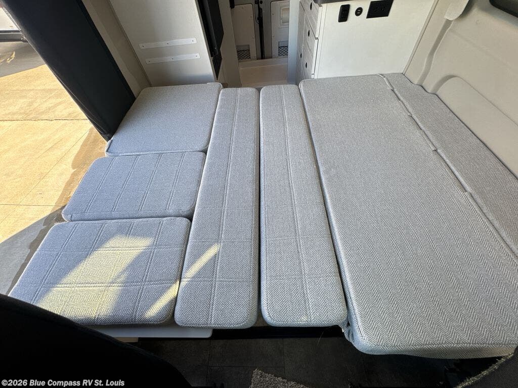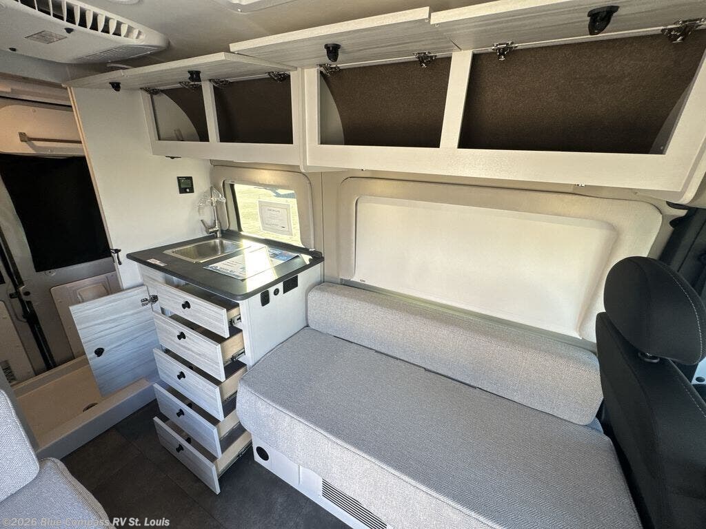 Any trip in this camper van will be spent in comfort thanks to the convenient wet bath and full kitchen amenities. You can whip up a hearty breakfast on the portable induction cooktop or use the microwave oven. There is a stainless steel sink to clean up, and the pressed countertops will be easy to clean. After you've hiked for the day and gotten cleaned up in the rear wet bath, you can relax on the 54" sofa that will convert to a 54" x 72" bed. There is also a 27" bench seat for more seating space and plenty of overhead cabinets for personal belongings, board games and more.