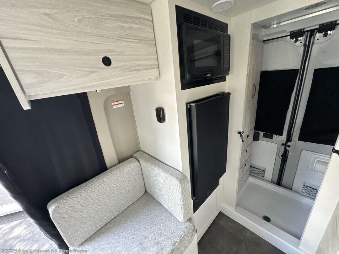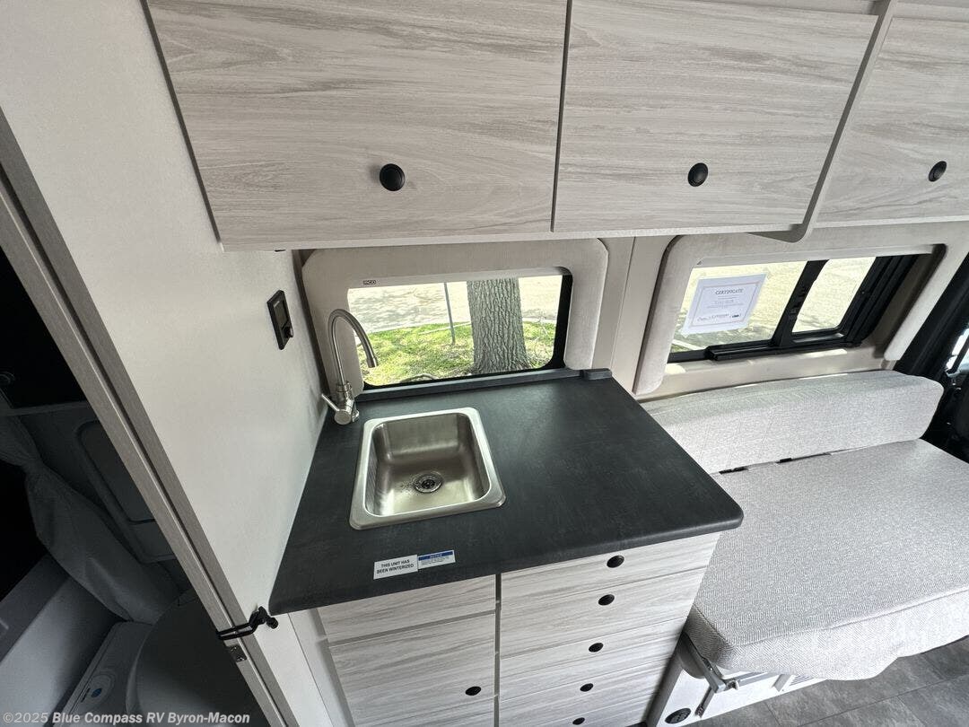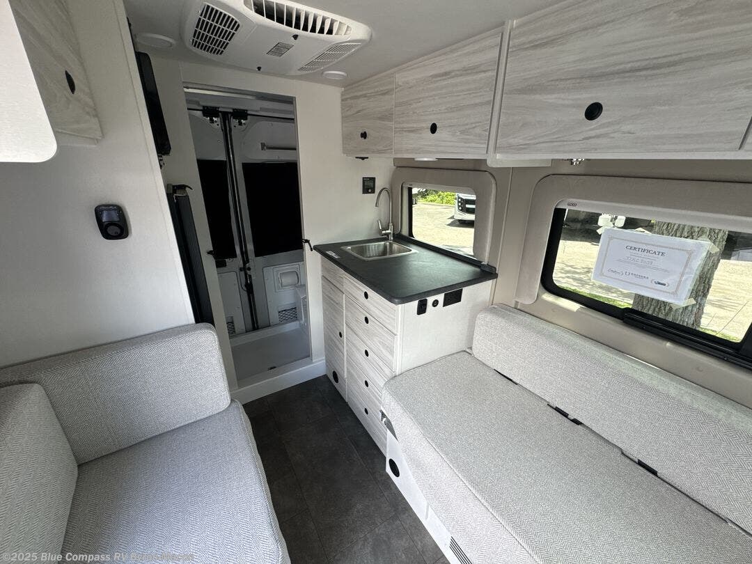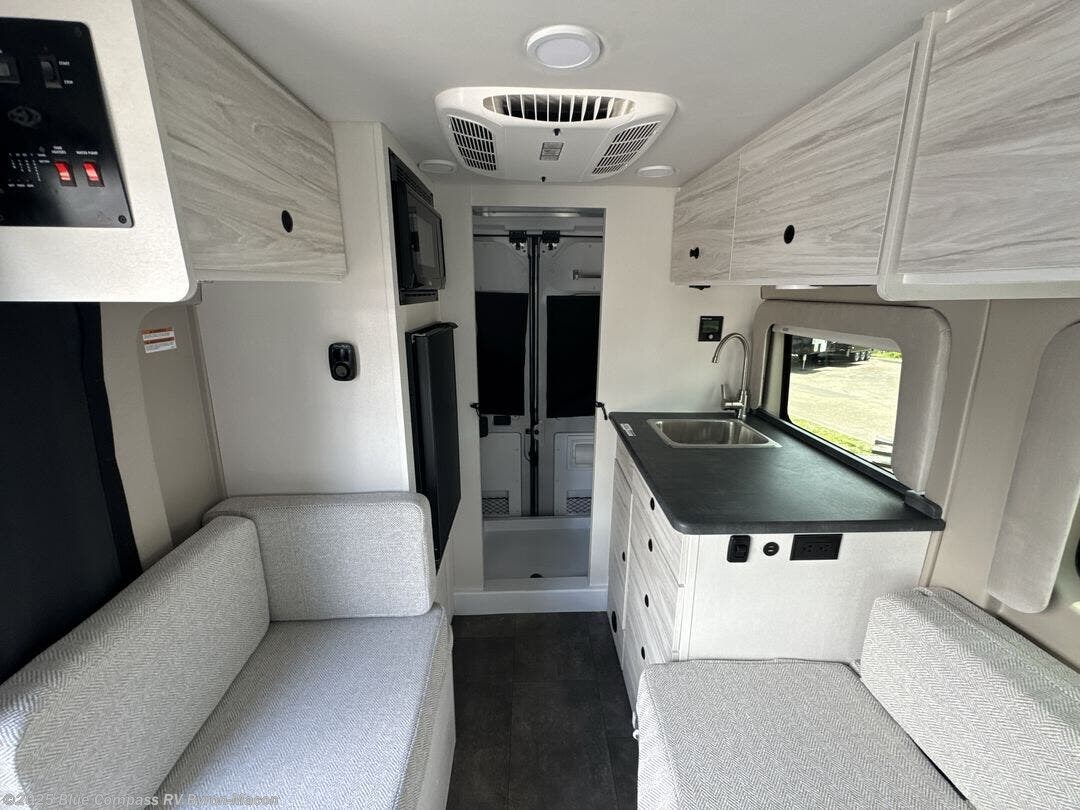 Any trip in this camper van will be spent in comfort thanks to the convenient wet bath and full kitchen amenities. You can whip up a hearty breakfast on the portable induction cooktop or use the microwave oven. There is a stainless steel sink with a cover for more prep space, and the pressed countertops will be easy to clean. After you've hiked for the day and gotten cleaned up in the rear wet bath, you can relax on the 54" sofa that will convert to a 54" x 72" bed. There is also a 27" bench seat for more seating space, overhead cabinets for storage, and an overhead TV to keep you entertained.