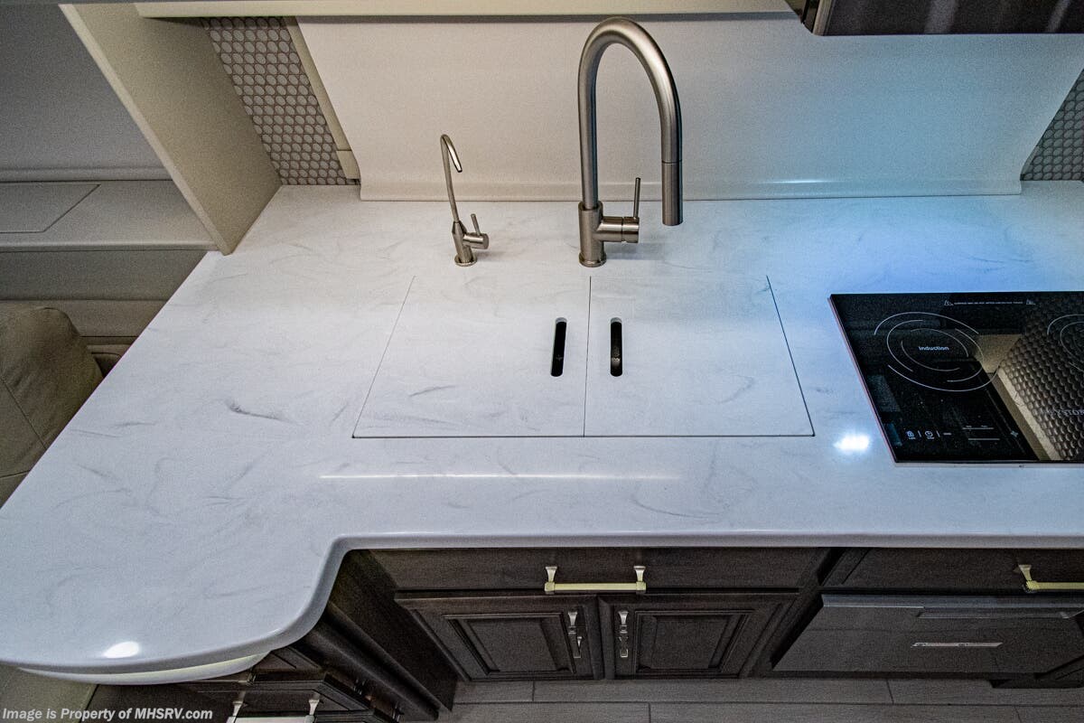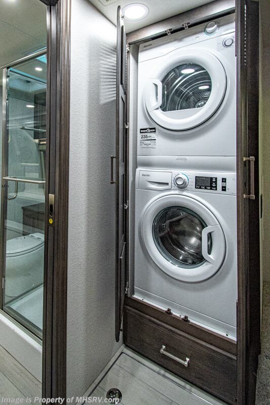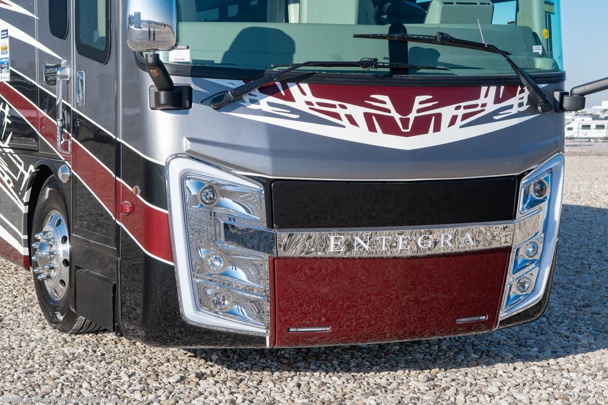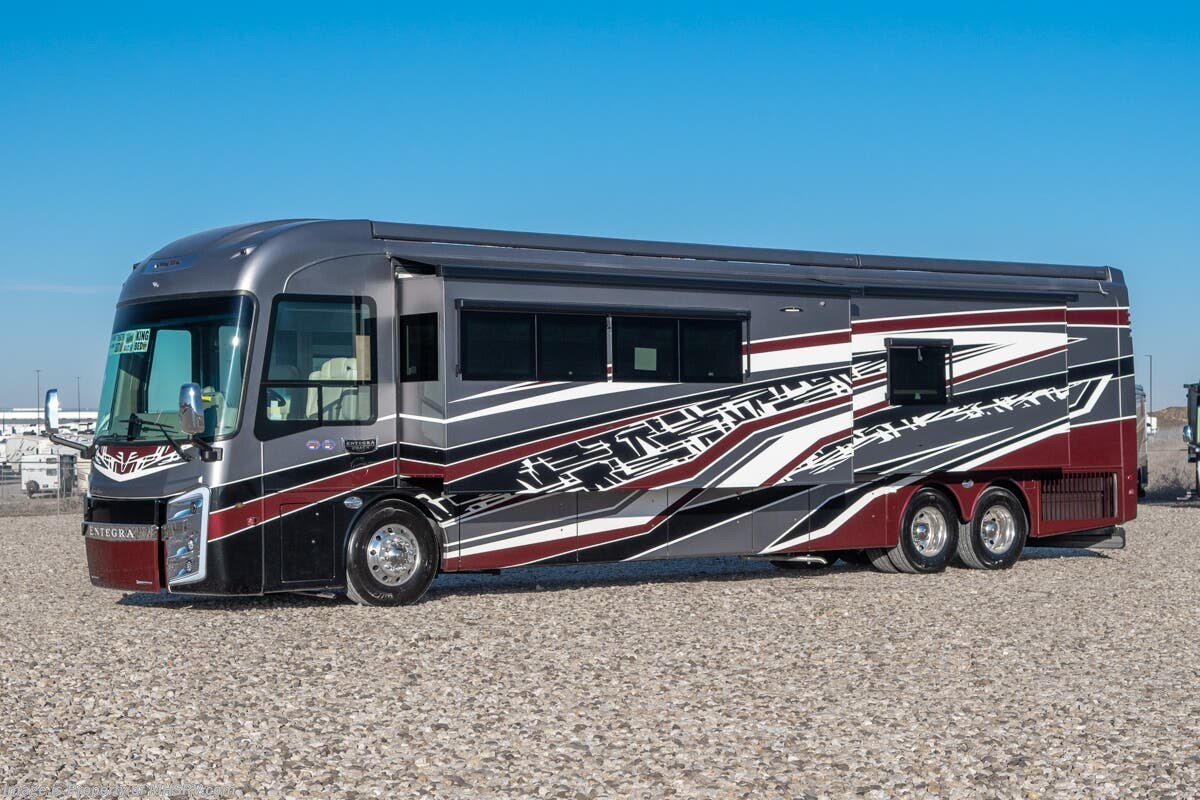 More About This RV This luxury bath & 1/2 diesel motor coach measures approximately 44 feet 11 inches in length and is backed by Entegra Coach's superior 2-Year/24K Mile Limited Coach & 5-Year Limited Structural Warranties. New for 2026 on the Aspire is the larger square-shaped windows with wood framed valances and a leather accent, LED strip lighting in bed base and under the sofa/dinette cabinets, upgraded tile work in the entry well, GE convection microwave with air fryer and larger Samsung Smart TV in the bedroom. Some of the standard features that really set the Entegra Aspire apart include the Valid 15” high brightness digital dash with quad core graphics processor and on-board diagnostics, Ramco 360° HD digital camera system, Aqua-Hot® 400D hydronic water and heating system with in-floor heat throughout, power tilt & telescoping steering wheel, Aqua View Showermi$er with “GREEN” technology saves fresh water, day and night shades throughout, solid-surface countertops with LED accent lighting, Girard window awnings & slide-out toppers, stainless steel refrigerator, Induction cook top with matching wood cover, LED marker and turn lights, DEF fill door, power rear engine door with push button control, Firefly multiplex system with 10” VegaTouch touchscreen for complete integration of coach controls, a 10,000 Onan diesel generator, Victron MultiPlus II 120V 3000VA pure sine inverter system with 7" digital LED information system, water softener prep, (3) 15K BTU roof A/C units with heat pumps, heated floors, 50 amp power cord reel, power water hose reel, GPS navigation system, frameless dual pane & tinted windows, automatic hydraulic leveling system, central vacuum, LED TV in bedroom, automatic generator start, Splendide stack washer/dryer, removed carpet on all slide floors, 360 degree birds' eye view camera system, LED TV in cab and much more.