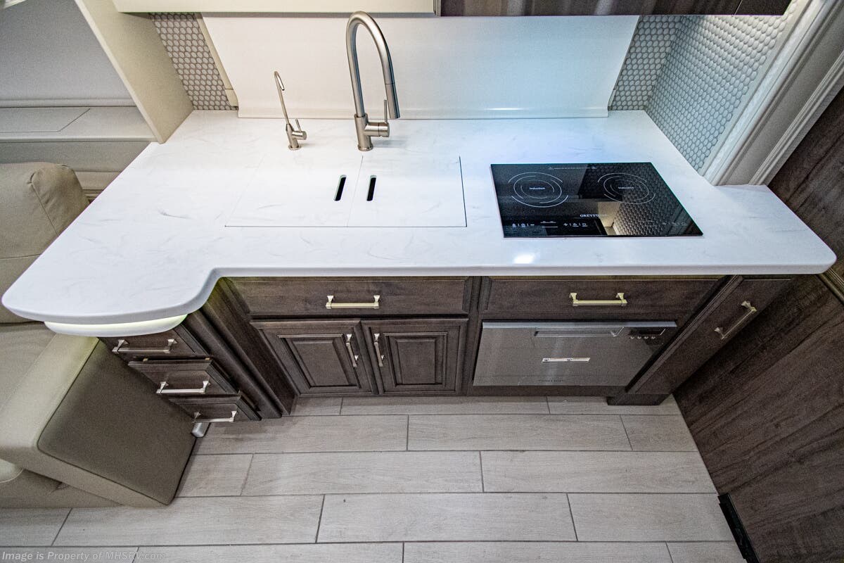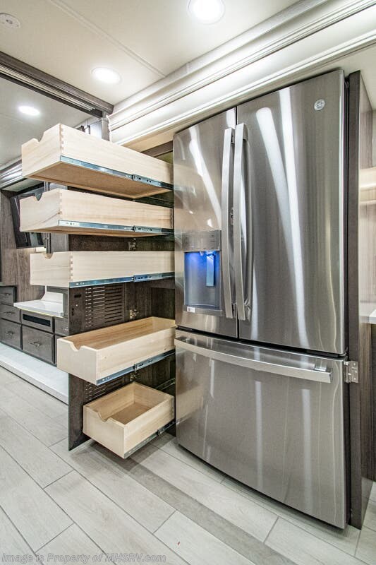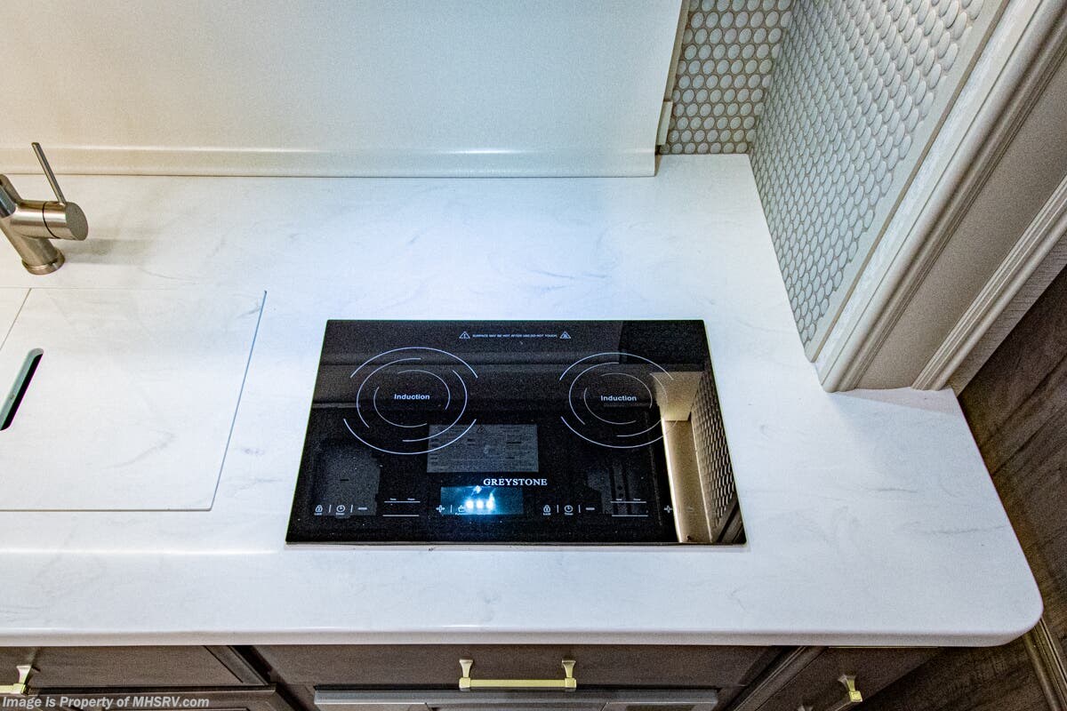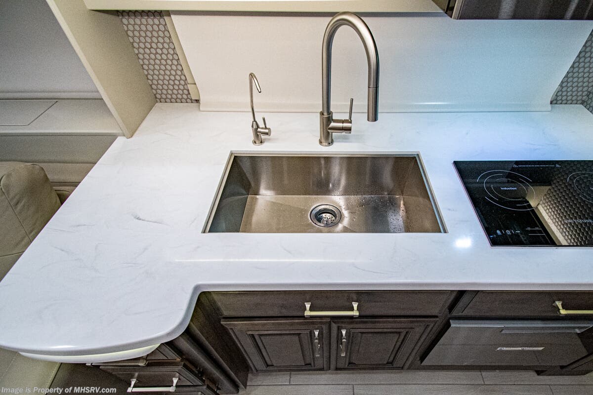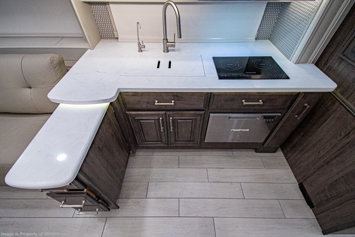 More About This RV This luxury bath & 1/2 diesel motor coach measures approximately 44 feet 11 inches in length and is backed by Entegra Coach's superior 2-Year/24K Mile Limited Coach & 5-Year Limited Structural Warranties. New for 2026 on the Aspire is the larger square-shaped windows with wood framed valances and a leather accent, LED strip lighting in bed base and under the sofa/dinette cabinets, upgraded tile work in the entry well, GE convection microwave with air fryer and larger Samsung Smart TV in the bedroom. Some of the standard features that really set the Entegra Aspire apart include the Valid 15” high brightness digital dash with quad core graphics processor and on-board diagnostics, Ramco 360° HD digital camera system, Aqua-Hot® 400D hydronic water and heating system with in-floor heat throughout, power tilt & telescoping steering wheel, Aqua View Showermi$er with “GREEN” technology saves fresh water, day and night shades throughout, solid-surface countertops with LED accent lighting, Girard window awnings & slide-out toppers, stainless steel refrigerator, Induction cook top with matching wood cover, LED marker and turn lights, DEF fill door, power rear engine door with push button control, Firefly multiplex system with 10” VegaTouch touchscreen for complete integration of coach controls, a 10,000 Onan diesel generator, Victron MultiPlus II 120V 3000VA pure sine inverter system with 7" digital LED information system, water softener prep, (3) 15K BTU roof A/C units with heat pumps, heated floors, 50 amp power cord reel, power water hose reel, GPS navigation system, frameless dual pane & tinted windows, automatic hydraulic leveling system, central vacuum, LED TV in bedroom, automatic generator start, Splendide stack washer/dryer, removed carpet on all slide floors, 360 degree birds' eye view camera system, LED TV in cab and much more.