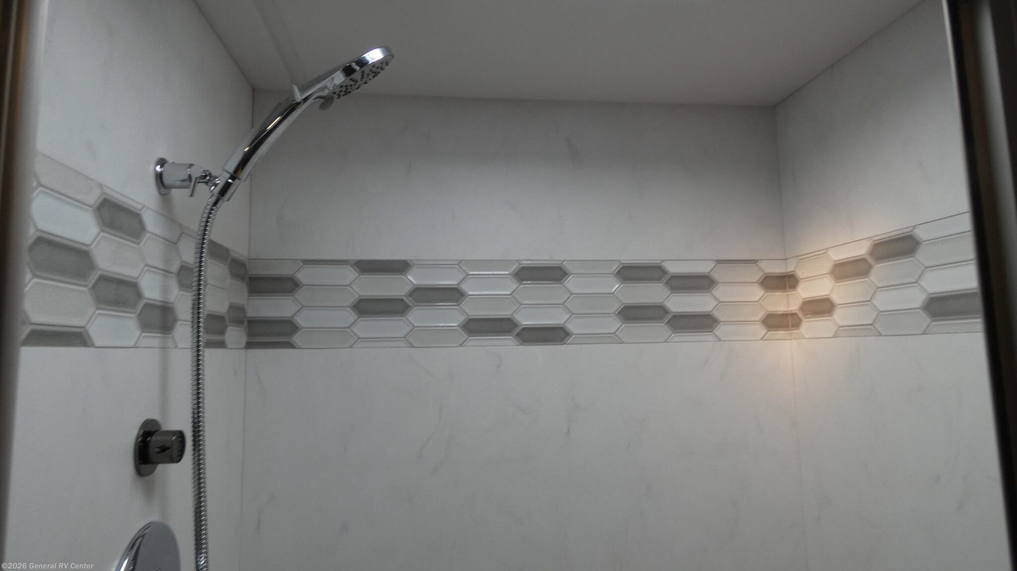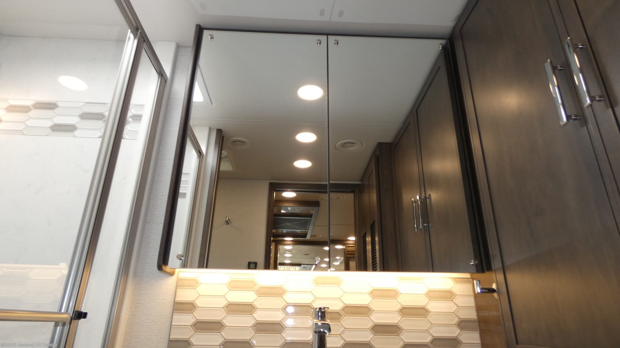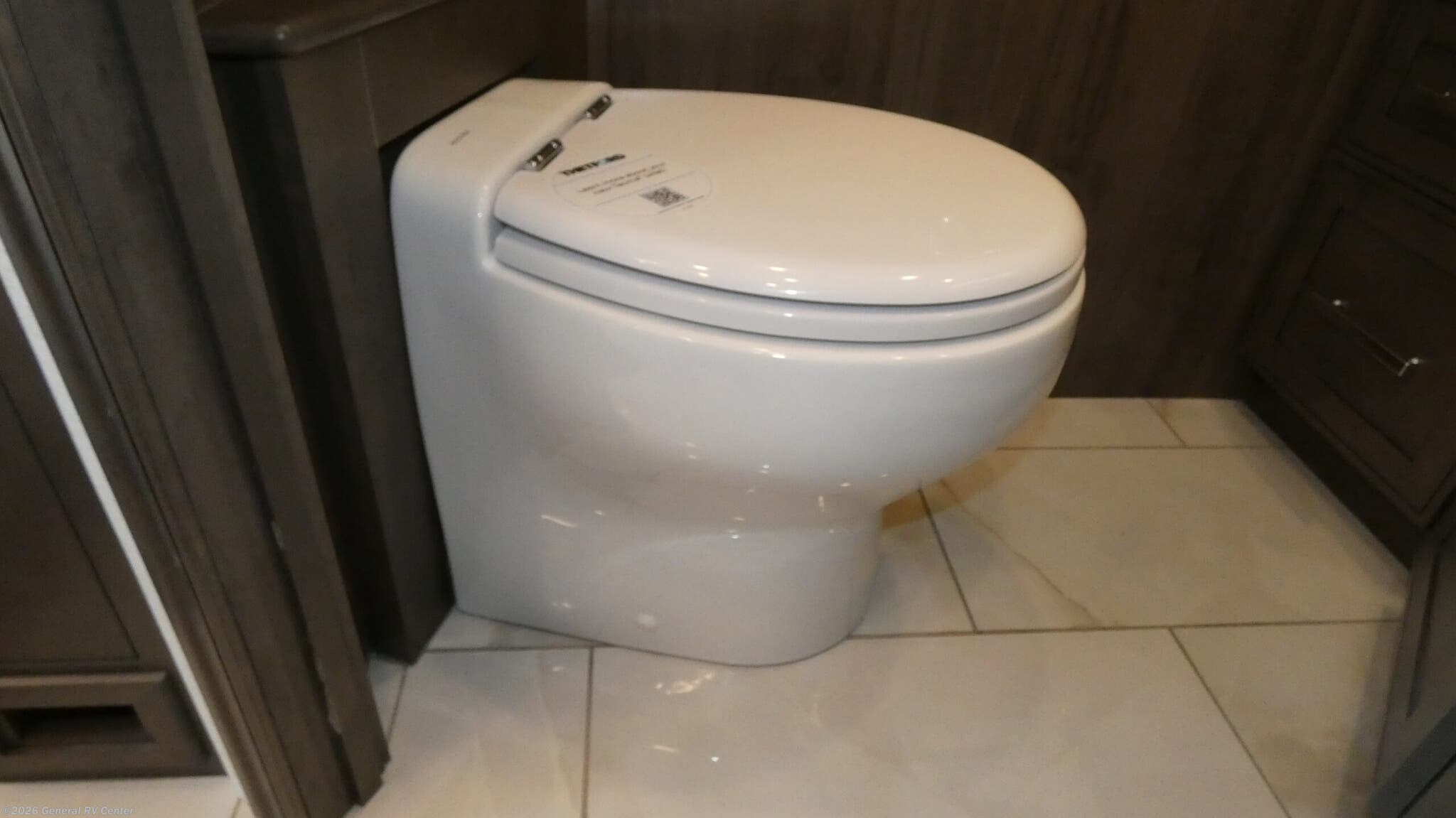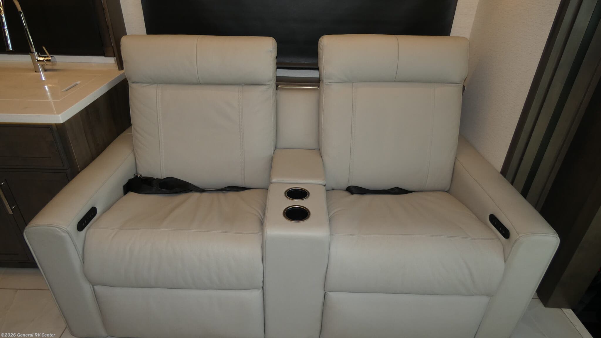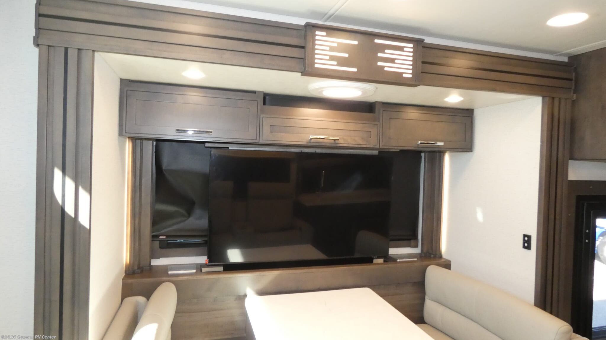 Entegra Coach Centurion Super C diesel motorhome 39N highlights: TV Lift Bath and Half Rear Bathroom Slide Out Dinette Up front, you are welcomed with adjustable air-ride leather driver and passenger seats, ensuring a smooth and comfortable ride for both driver and co-pilot. On one side, a large slide-out expands the living space and features a 74" hide-a-bed sofa that easily transitions from comfortable seating to a convenient sleeping area. Adjacent to the sofa is the well-appointed kitchen, complete with a stainless-steel refrigerator, induction cooktop, and a convection microwave with air-fryer functionality, plus ample overhead cabinetry for dry goods and snacks. Across from the kitchen, a dinette in its own slide-out creates a spacious dining area, paired with a 50" Smart TV on a lift, perfect for enjoying meals or movie nights together. Mid-coach, a convenient half bath adds everyday practicality. At the rear, the private bedroom offers a relaxing retreat with a gel memory foam mattress in a slide-out for extra walking space, nightstands on both sides, storage drawers for essentials, and a Smart TV for evening entertainment. The bedroom is completed by its own full bathroom, featuring a wardrobe, overhead cabinets, and a spacious 40" x 30" shower for added comfort and convenience. Built to balance durability, technology, and comfort, the Entegra Coach Centurion Super C diesel motorhome showcases four standout features that enhance every journey. The one-piece, seamless fiberglass roof improves long-term durability while reducing the risk of leaks. Power independence is elevated with an Onan® 8,000W diesel generator paired with 400W of solar panels, providing reliable energy on or off the grid. Inside, hand-laid porcelain tile floors with in-floor heating deliver both elegance and year-round comfort. Rounding out the experience, the Detroit® Safety Assurance package adds advanced driver-assist features for increased confidence and peace of mind on every mile.