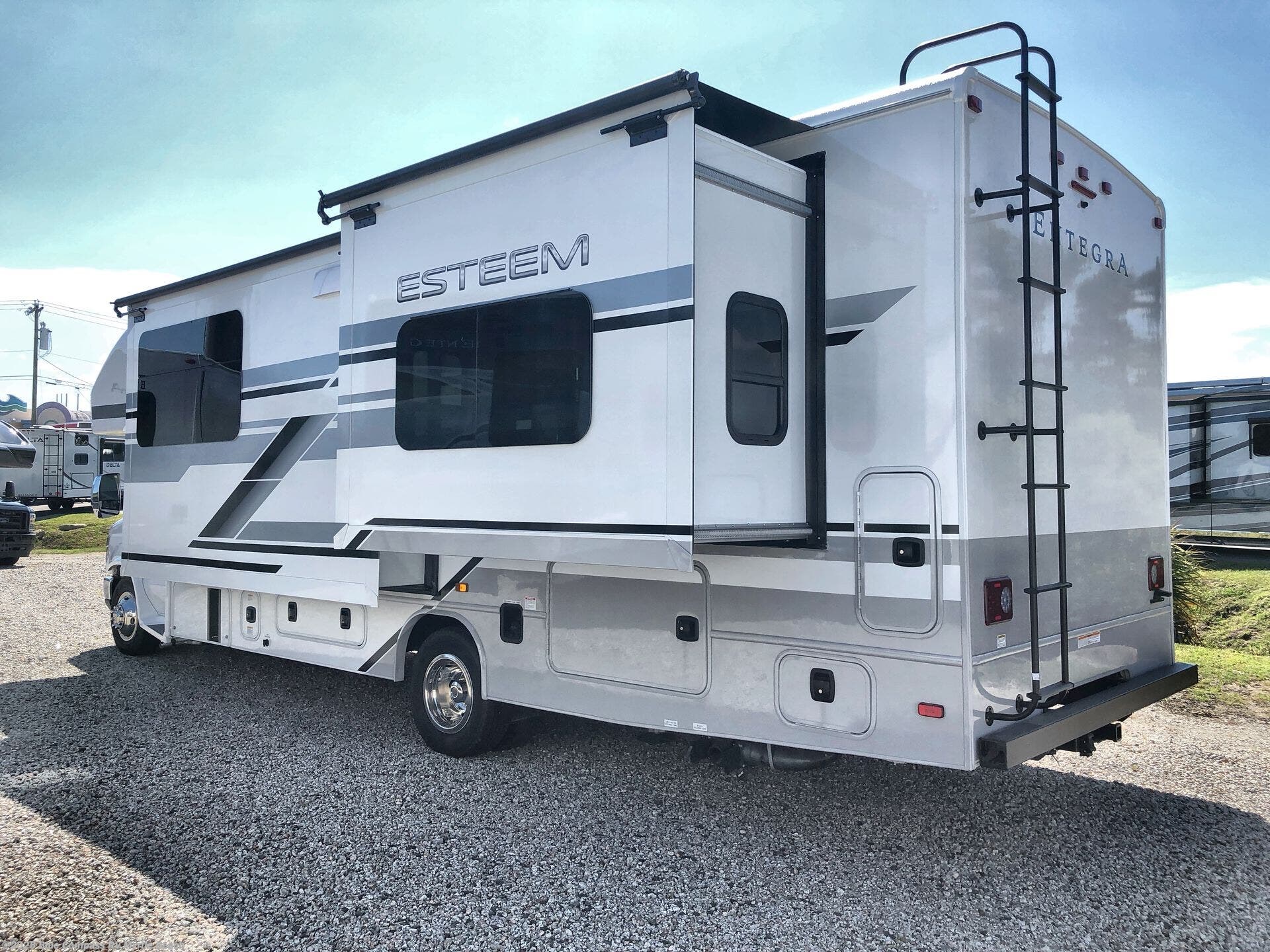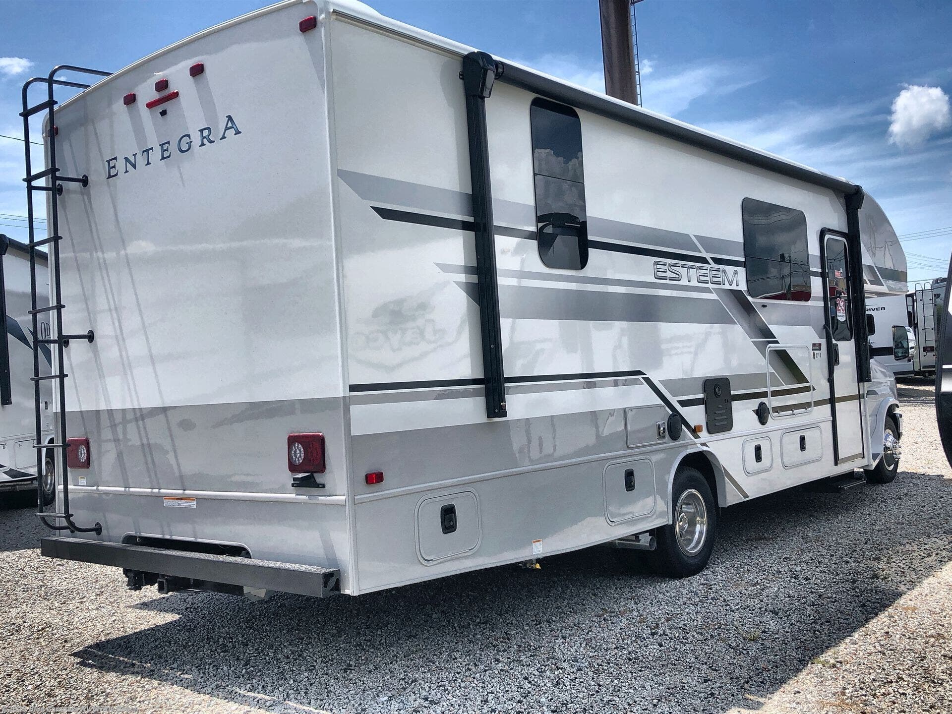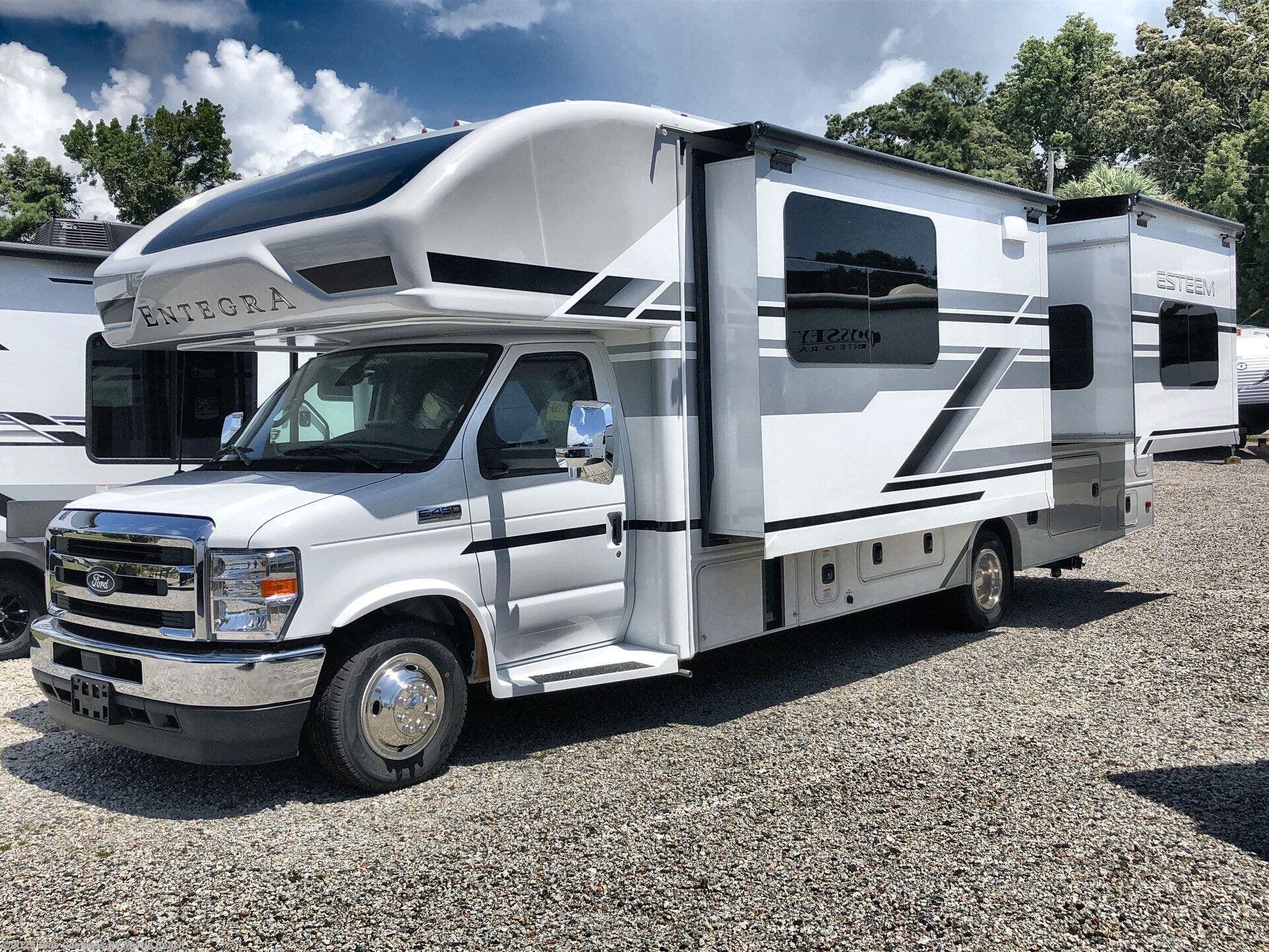 Make one of these Entegra Coach Esteem Class C gas motorhomes your own! The interior design includes solid-surface countertops that pair well with the many technological upgrades. The fully custom-molded ABS surround in the cab area features its signature panoramic window and power shade for a beautiful view while you drive and provide privacy at night. They also come with E-Z Drive Elite which has a computer-balanced driveshaft, Koni FSD shocks, Hellwig helper springs, and a heavy-duty rear stabilizer bar for a smooth ride. Automatic leveling jacks will make set-up a breeze and the electric awning with LED lights will create an outdoor living space where you can relax after unpacking. Inside, you'll enjoy hardwood cabinet doors and drawer fronts, blackout night roller shades, and high-intensity recessed LED ceiling lights to keep your space well lit. There is also a JBL audio system and a BMPRO total coach control system to easily manage your unit's functions!