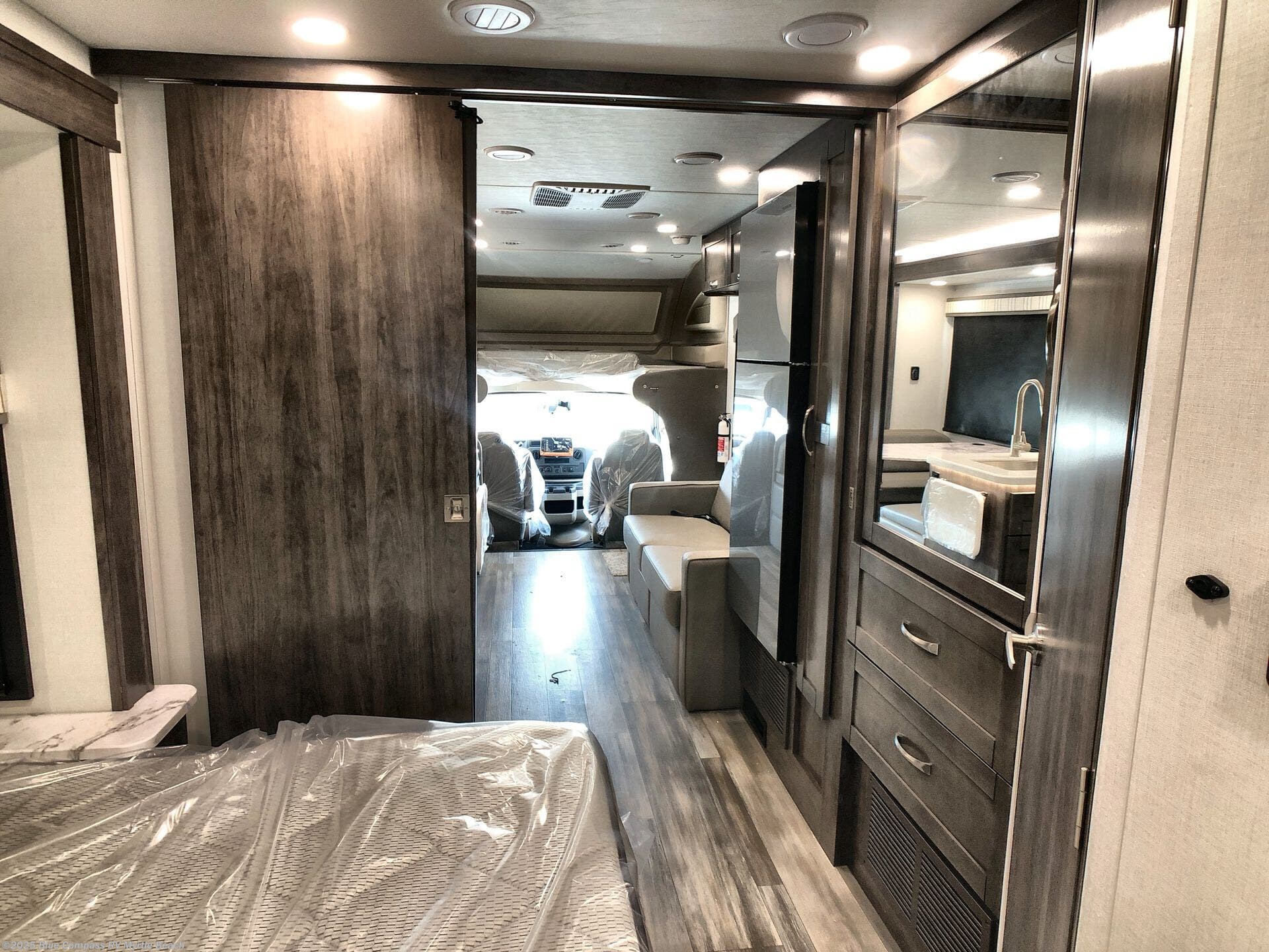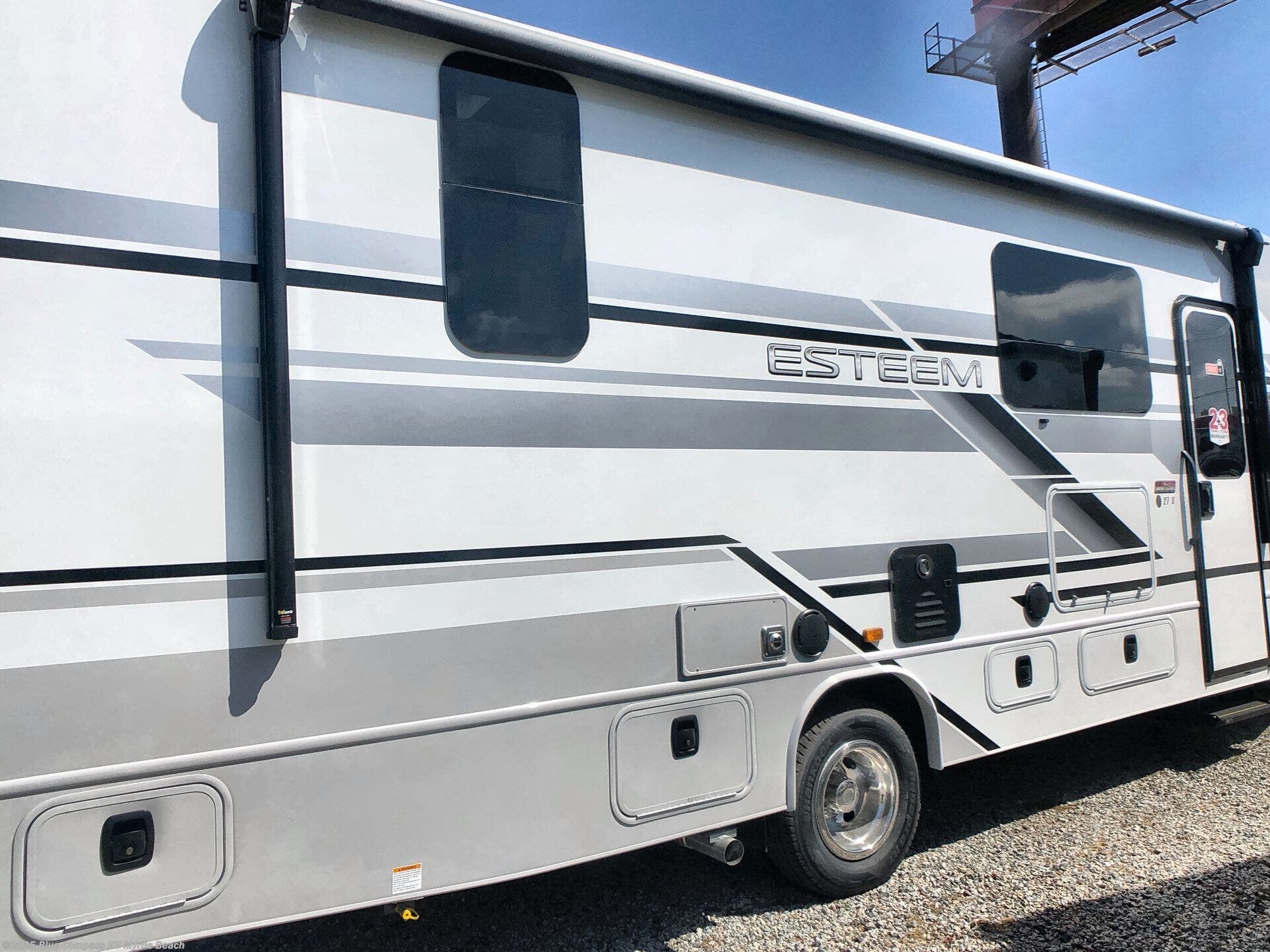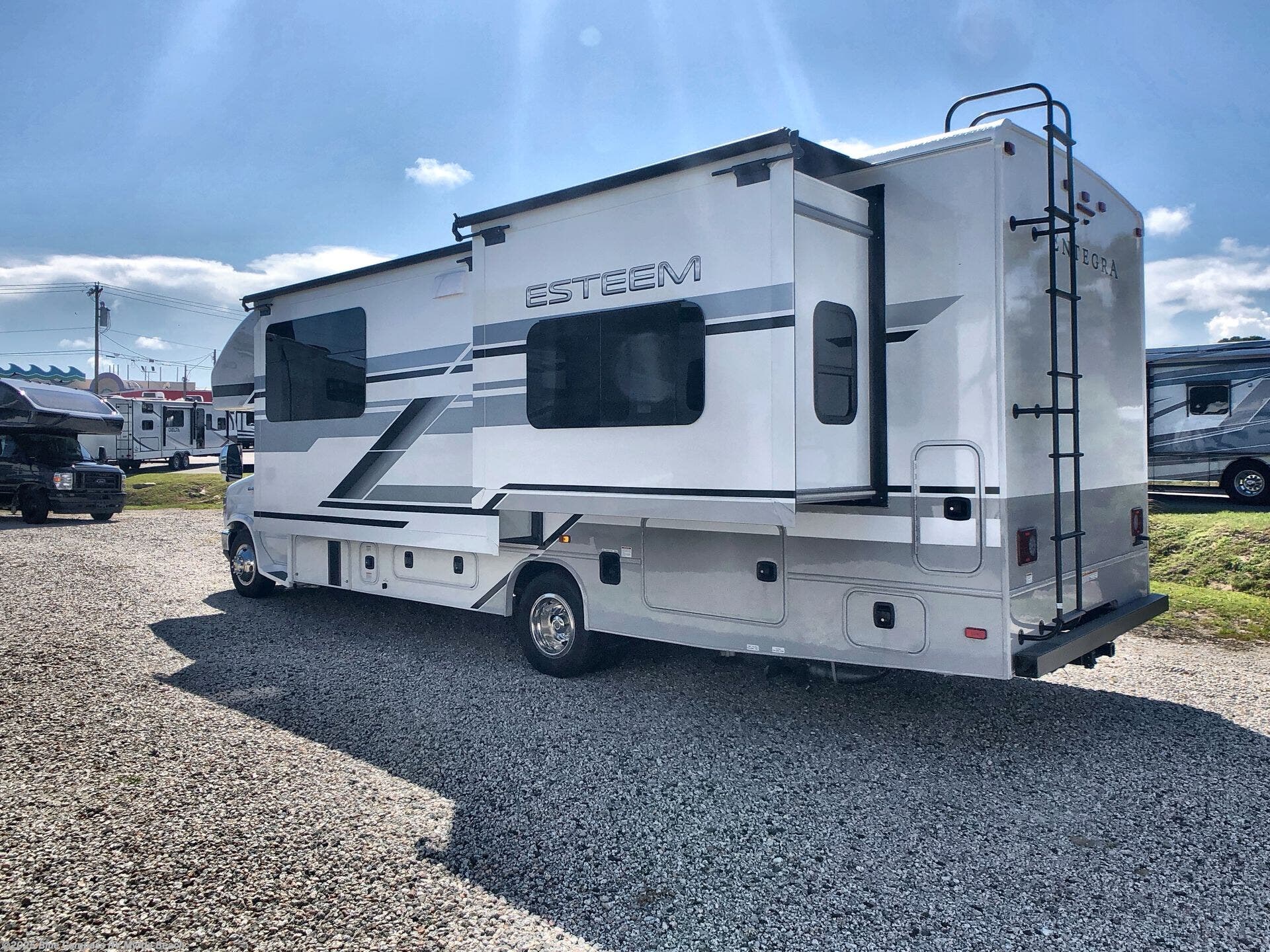 Make one of these Entegra Coach Esteem Class C gas motorhomes your own! The interior design includes solid-surface countertops that pair well with the many technological upgrades. The fully custom-molded ABS surround in the cab area features its signature panoramic window and power shade for a beautiful view while you drive and provide privacy at night. They also come with E-Z Drive Elite which has a computer-balanced driveshaft, Koni FSD shocks, Hellwig helper springs, and a heavy-duty rear stabilizer bar for a smooth ride. Automatic leveling jacks will make set-up a breeze and the electric awning with LED lights will create an outdoor living space where you can relax after unpacking. Inside, you'll enjoy hardwood cabinet doors and drawer fronts, blackout night roller shades, and high-intensity recessed LED ceiling lights to keep your space well lit. There is also a JBL audio system and a BMPRO total coach control system to easily manage your unit's functions!