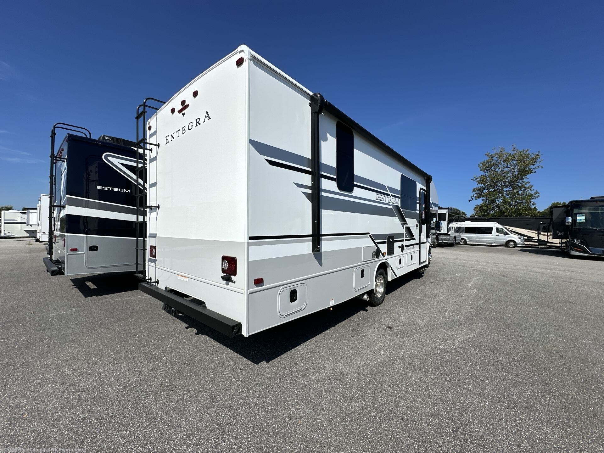 Make one of these Entegra Coach Esteem Class C gas motorhomes your own! The interior design includes solid-surface countertops that pair well with the many technological upgrades. The fully custom-molded ABS surround in the cab area features its signature panoramic window and power shade for a beautiful view while you drive and provide privacy at night. They also come with E-Z Drive Elite which has a computer-balanced driveshaft, Koni FSD shocks, Hellwig helper springs, and a heavy-duty rear stabilizer bar for a smooth ride. Automatic leveling jacks will make set-up a breeze and the electric awning with LED lights will create an outdoor living space where you can relax after unpacking. Inside, you'll enjoy hardwood cabinet doors and drawer fronts, blackout night roller shades, and high-intensity recessed LED ceiling lights to keep your space well lit. There is also a JBL audio system and a BMPRO total coach control system to easily manage your unit's functions!