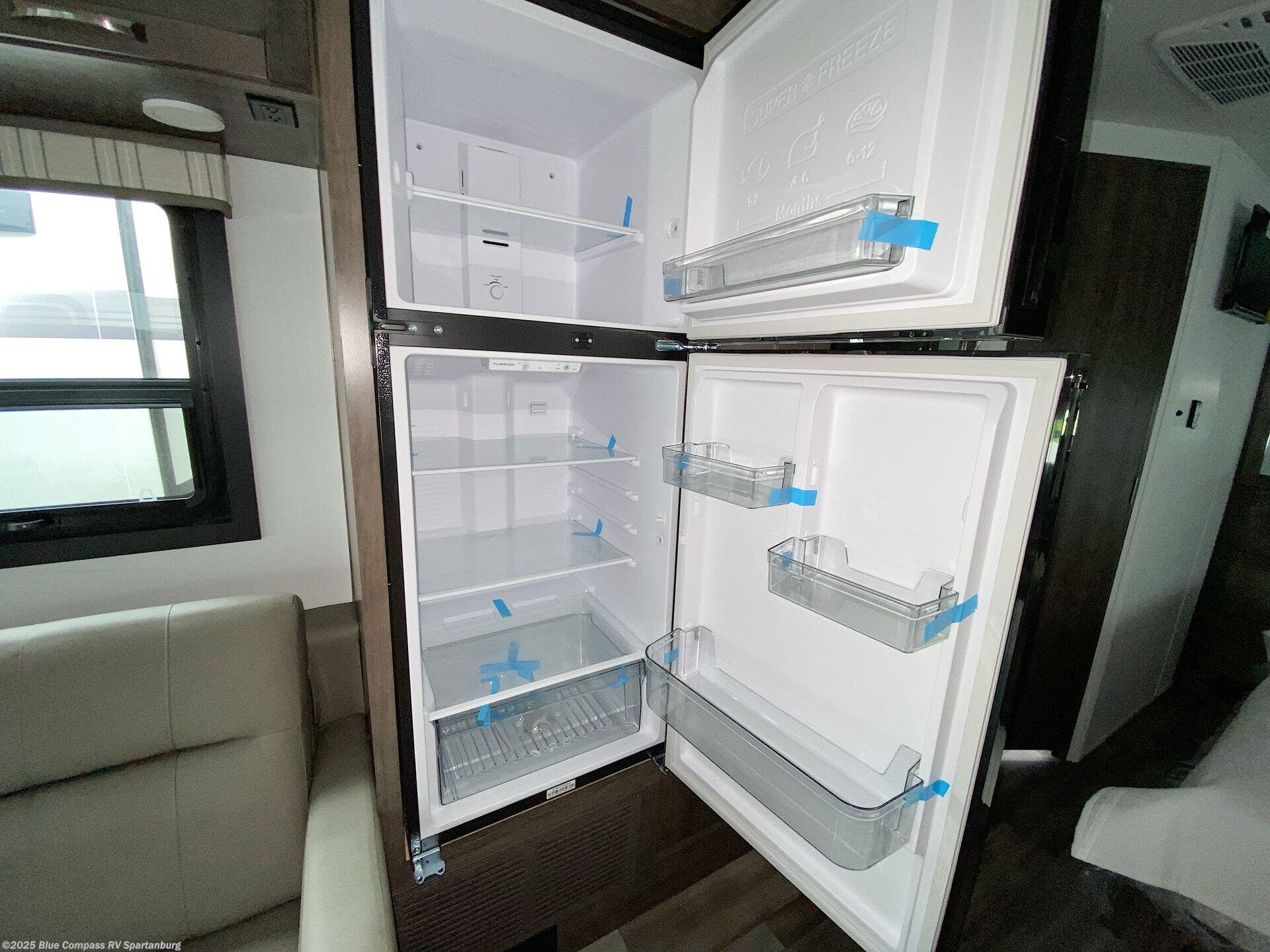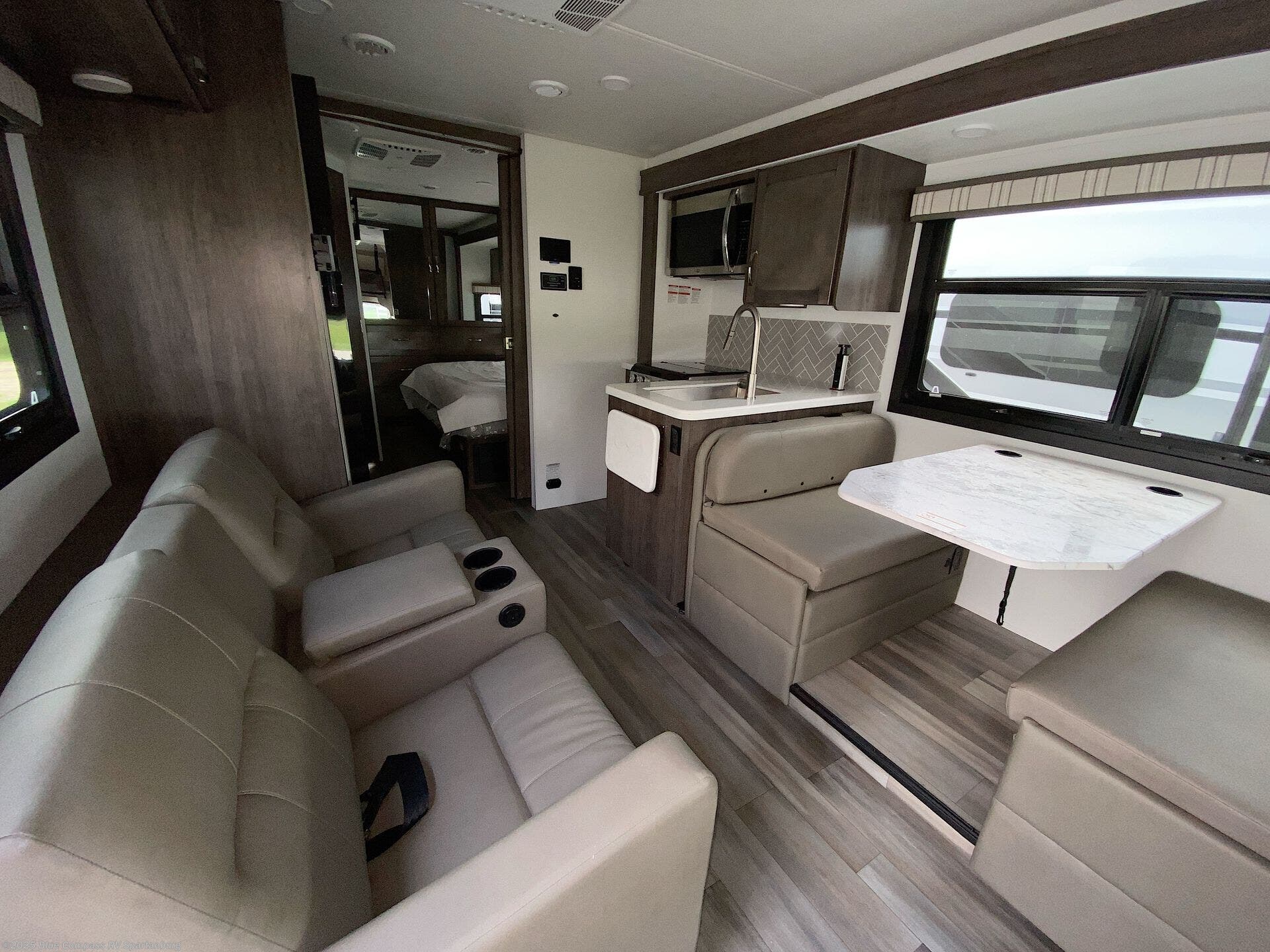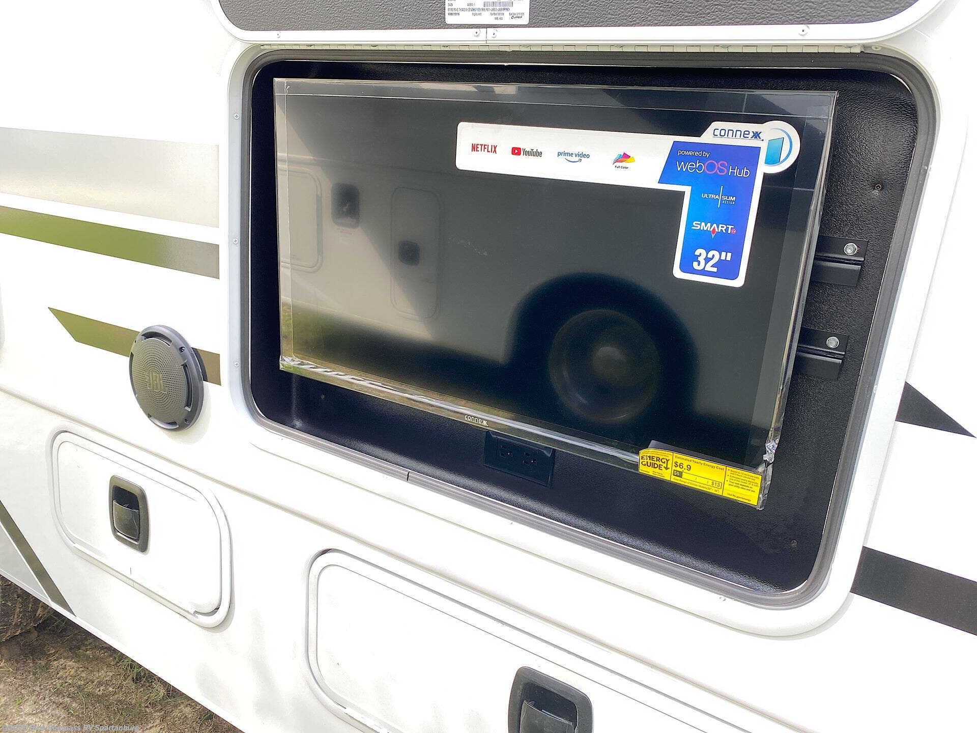 You can bring a few guests to join in on the fun with this motorhome! The bunk over cab and 66" x 76" king bed offer comfortable places to sleep, plus you can transform the booth dinette and the sofa into extra sleeping spaces if needed. Everyone can freshen up each morning with the 30" x 36" shower in the rear corner bathroom, and keep their bellies full with a Furrion all-in-one cooktop and oven plus a residential microwave. There is even a countertop extension to make meal prepping easier. Take the fun outside and watch movies on the exterior LED HD Smart TV while staying protected by the 18' electric awning with LED lights!