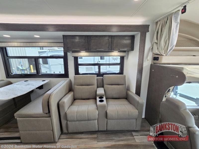 Enjoy a home on wheels with this motorhome! The rear private bedroom has a 60" x 74" queen bed slide to lay your head on at night and dual wardrobes opposite to keep your clothes looking their best. Add the optional TV if you enjoy watching a movie in bed. The separated bathroom makes it easy for one person to freshen up in the 30" x 36" shower while another uses the private toilet and sink. Prepare your best home cooked meals with the Furrion all-in-one cooktop and oven then enjoy them at the booth dinette. The tri-fold sofa offers a comfortable place to relax but it can be switched out for the an optional theater sofa instead. There is also a bunk over cab for more to join in on the fun!