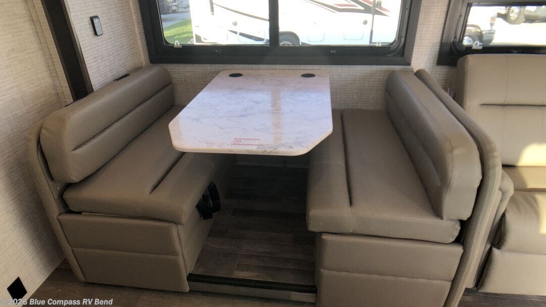Enjoy a home on wheels with this motorhome! The rear private bedroom has a 60" x 74" queen bed slide to lay your head on at night and dual wardrobes opposite to keep your clothes looking their best. Add the optional TV if you enjoy watching a movie in bed. The separated bathroom makes it easy for one person to freshen up in the 30" x 36" shower while another uses the private toilet and sink. Prepare your best home cooked meals with the Furrion all-in-one cooktop and oven then enjoy them at the booth dinette. The tri-fold sofa offers a comfortable place to relax but it can be switched out for the an optional theater sofa instead. There is also a bunk over cab for more to join in on the fun!
