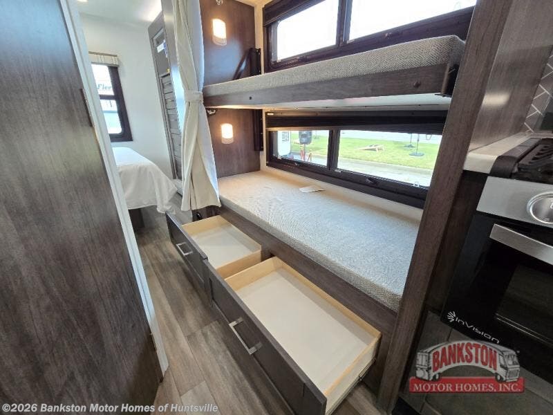 The whole family can travel together in this motorhome! The kiddos can sleep on the set of bunk beds with tablet holders and you can sleep on the 60" x 74" queen bed in the rear private bedroom. Everyone can easily access the dual entry bathroom to freshen up in the 32" radius shower each morning. Cook up delicious meals on the Furrion all-in-one cooktop, then head to the booth dinette which can also transform into an extra sleeping space. You can take an afternoon nap on the sofa or head outdoors to watch the big game at the exterior LED HD Smart TV underneath the 18' electric awning with LED lights to highlight the good times!