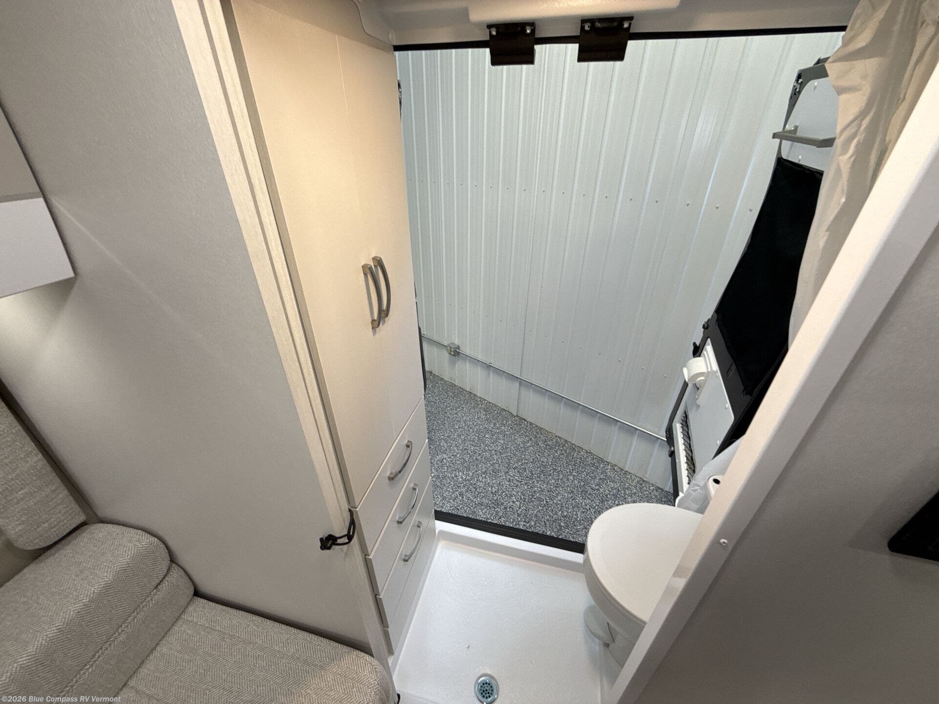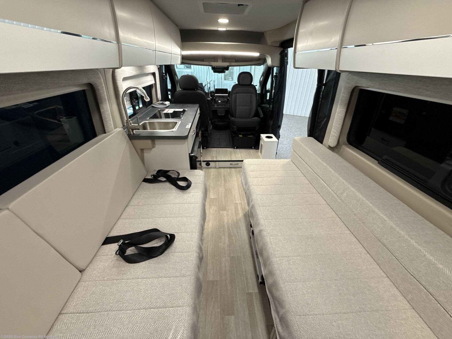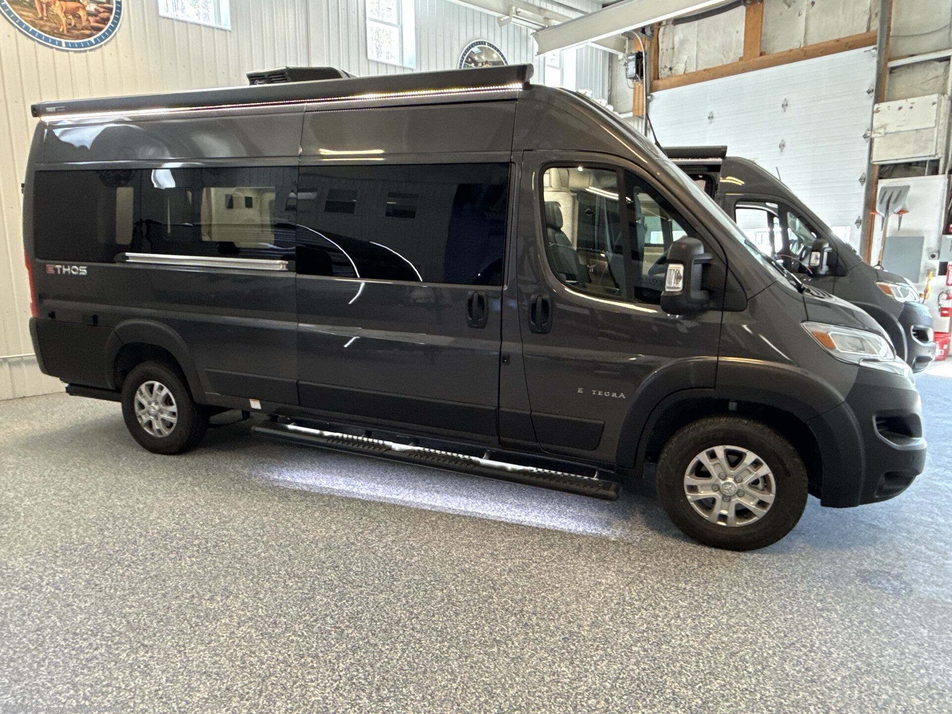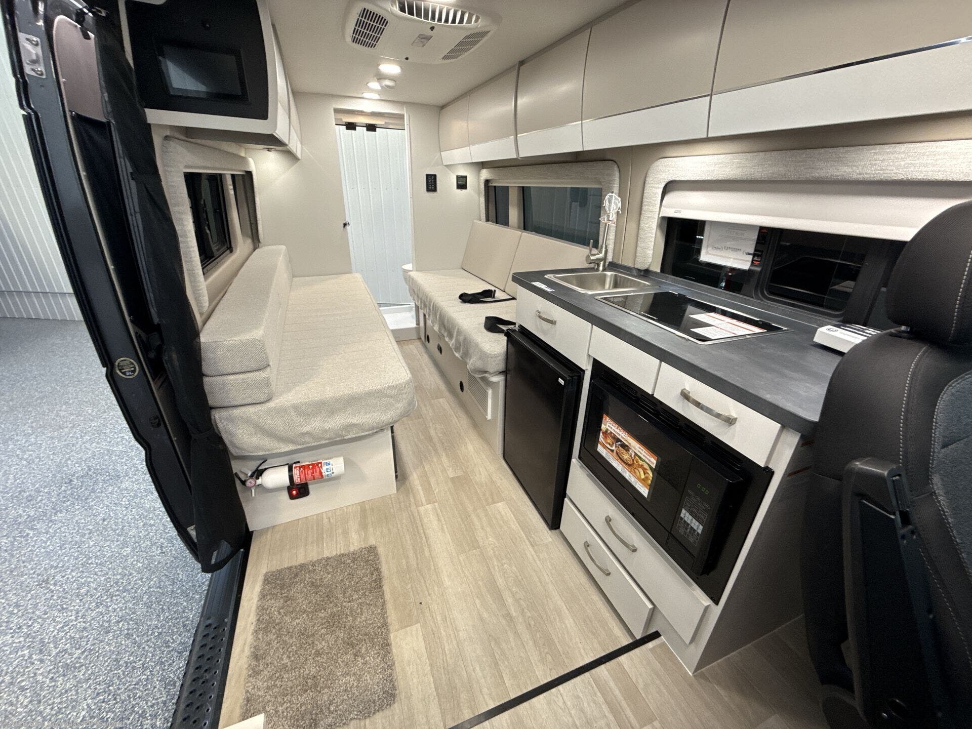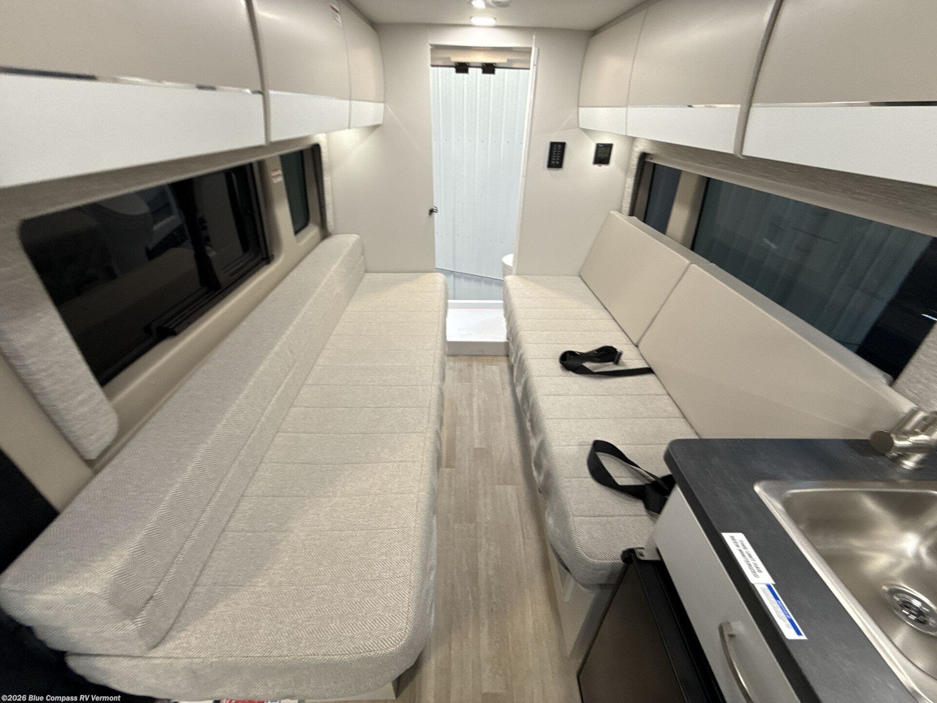 Your trek across country is made comfortable in this coach for two. You can swivel the captains seats around when you get to your destination, or head outdoors to sit under the 13' Thule armless awning with LED lights. The pull-out table indoors will provide a space for your coffee in the morning, while breakfast is being cooked in the convection microwave or on the two burner cooktop. A rear wet bath will allow you to stay clean throughout your trip, and you'll find plenty of storage space for your belongings. You'll love the versatile sleeping arrangements in this model that includes twin-size beds with a filler cushion that converts to a king-size bed, plus there is under-bed storage for your luggage. The optional Li Package can also be added which features a 48V-165 amp hour smart lithium battery, providing 7.9KW hours of power, and more; see dealer for more details!
