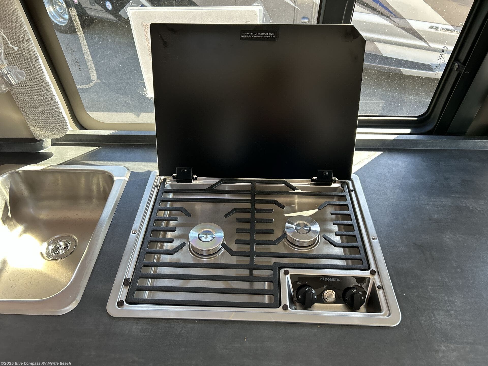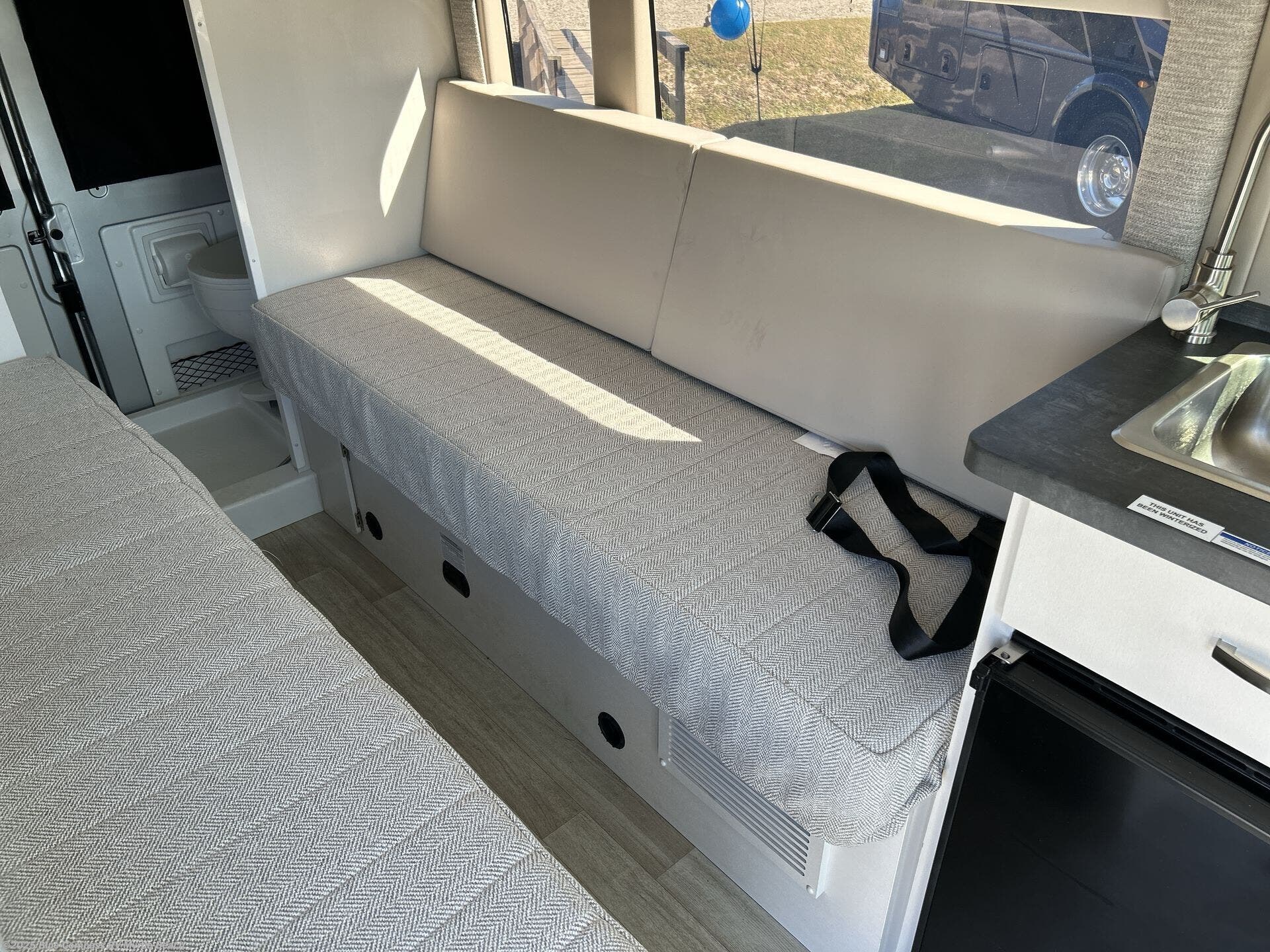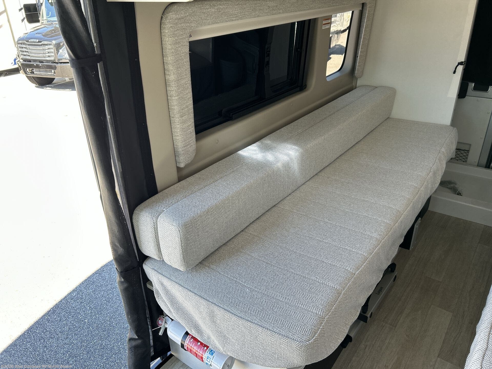 Your trek across country is made comfortable in this coach for two. You can swivel the captains seats around when you get to your destination, or head outdoors to sit under the 13' Thule armless awning with LED lights. The pull-out table indoors will provide a space for your coffee in the morning, while breakfast is being cooked in the convection microwave or on the two burner cooktop. A rear wet bath will allow you to stay clean throughout your trip, and you'll find plenty of storage space for your belongings. You'll love the versatile sleeping arrangements in this model that includes twin-size beds with a filler cushion that converts to a king-size bed, plus there is under-bed storage for your luggage. The optional Li Package can also be added which features a 48V-165 amp hour smart lithium battery, providing 7.9KW hours of power, and more; see dealer for more details!