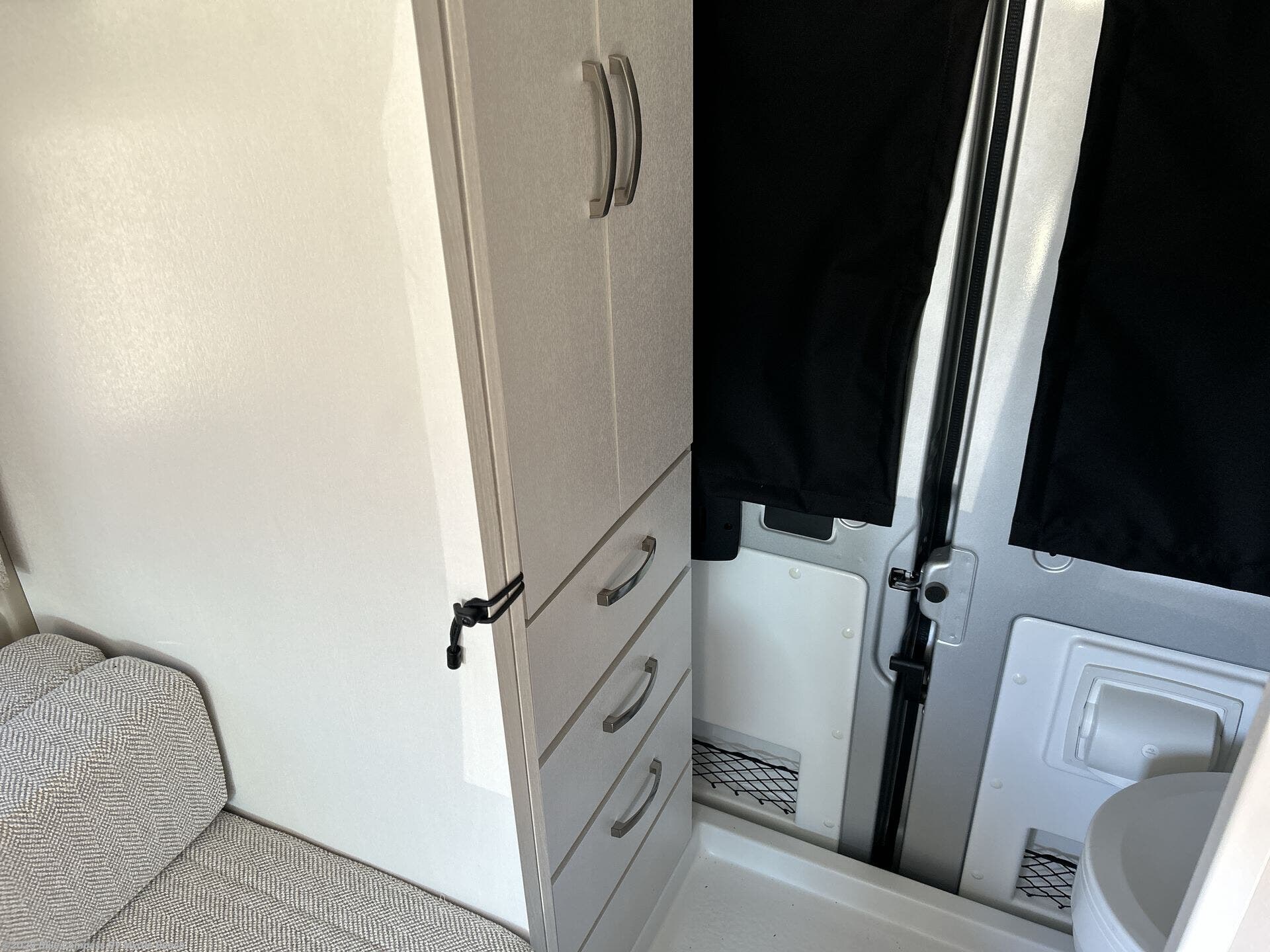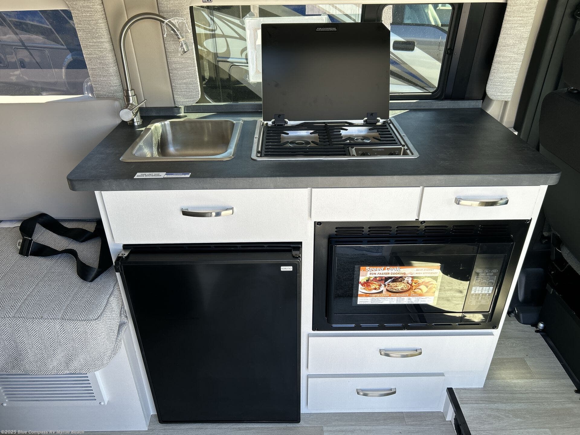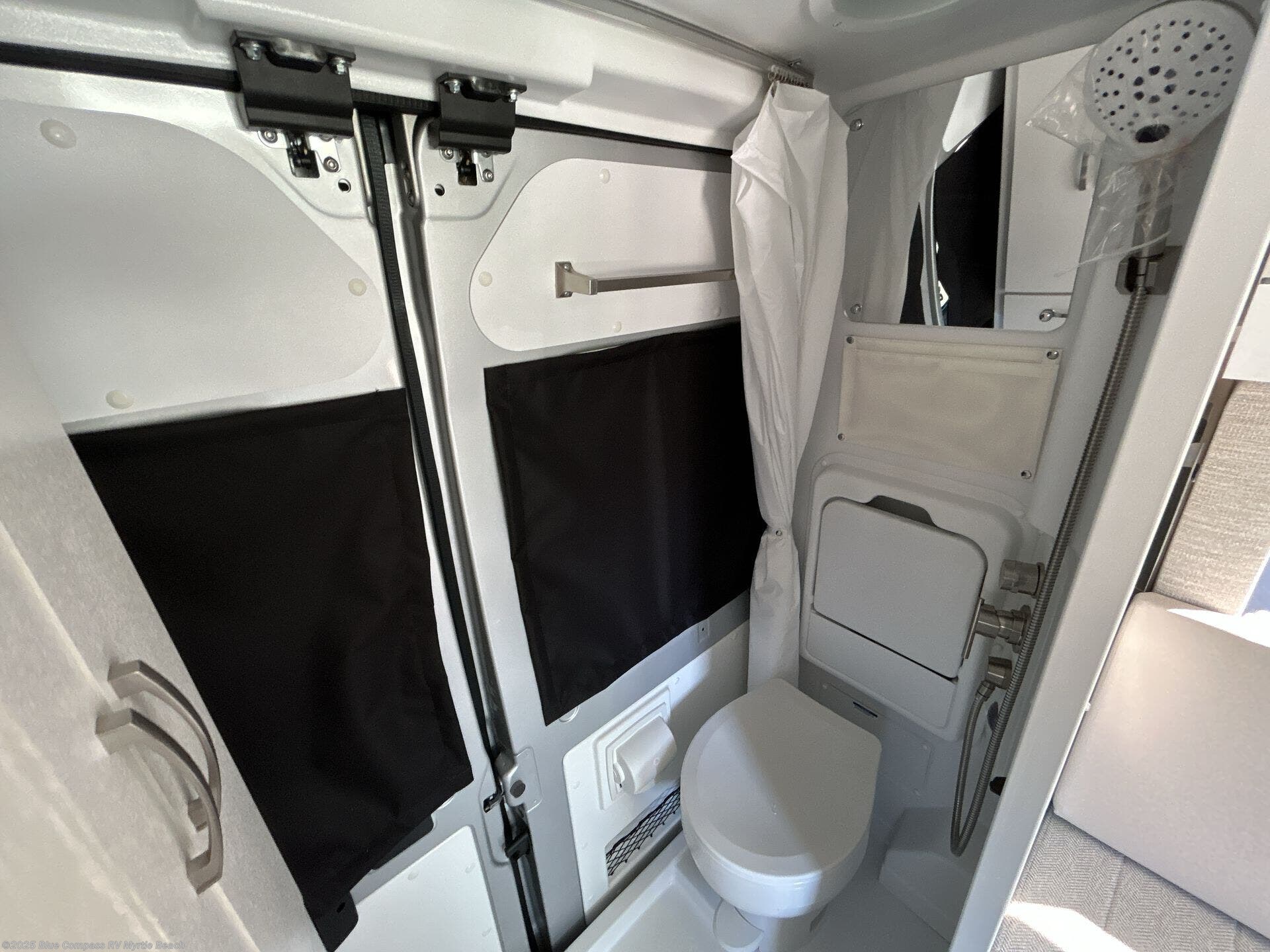 Your trek across country is made comfortable in this coach for two. You can swivel the captains seats around when you get to your destination, or head outdoors to sit under the 13' Thule armless awning with LED lights. The pull-out table indoors will provide a space for your coffee in the morning, while breakfast is being cooked in the convection microwave or on the two burner cooktop. A rear wet bath will allow you to stay clean throughout your trip, and you'll find plenty of storage space for your belongings. You'll love the versatile sleeping arrangements in this model that includes twin-size beds with a filler cushion that converts to a king-size bed, plus there is under-bed storage for your luggage. The optional Li Package can also be added which features a 48V-165 amp hour smart lithium battery, providing 7.9KW hours of power, and more; see dealer for more details!