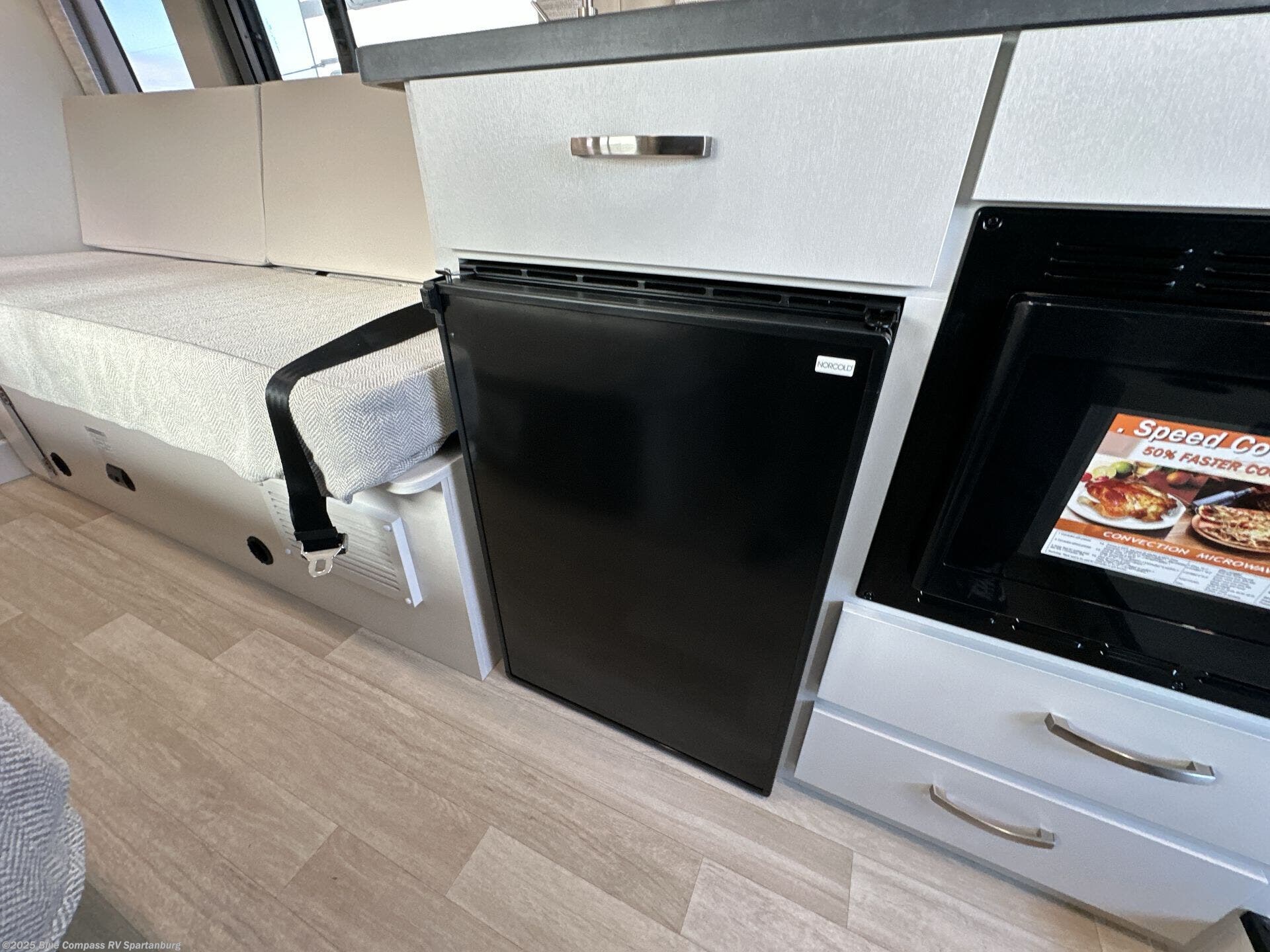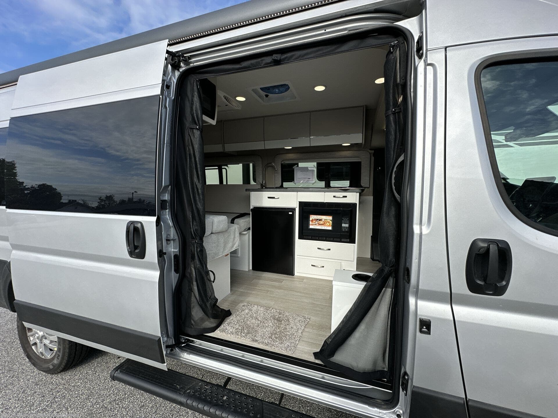 Your trek across country is made comfortable in this coach for two. You can swivel the captains seats around when you get to your destination, or head outdoors to sit under the 13' Thule armless awning with LED lights. The pull-out table indoors will provide a space for your coffee in the morning, while breakfast is being cooked in the convection microwave or on the two burner cooktop. A rear wet bath will allow you to stay clean throughout your trip, and you'll find plenty of storage space for your belongings. You'll love the versatile sleeping arrangements in this model that includes twin-size beds with a filler cushion that converts to a king-size bed, plus there is under-bed storage for your luggage. The optional Li Package can also be added which features a 48V-165 amp hour smart lithium battery, providing 7.9KW hours of power, and more; see dealer for more details!