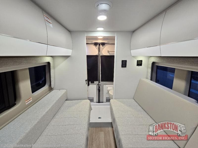 Your trek across country is made comfortable in this coach for two. You can swivel the captains seats around when you get to your destination, or head outdoors to sit under the 13' Thule armless awning with LED lights. The pull-out table indoors will provide a space for your coffee in the morning, while breakfast is being cooked in the convection microwave or on the two burner cooktop. A rear wet bath will allow you to stay clean throughout your trip, and you'll find plenty of storage space for your belongings. You'll love the versatile sleeping arrangements in this model that includes twin-size beds with a filler cushion that converts to a king-size bed, plus there is under-bed storage for your luggage. The optional Li Package can also be added which features a 48V-165 amp hour smart lithium battery, providing 7.9KW hours of power, and more; see dealer for more details!