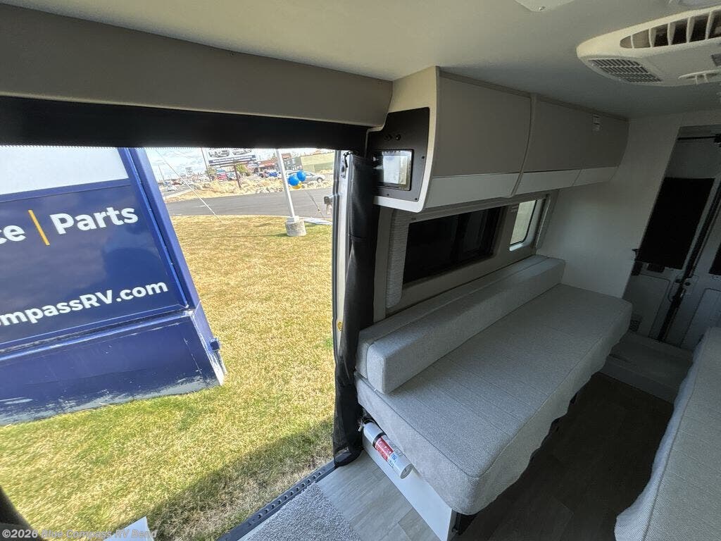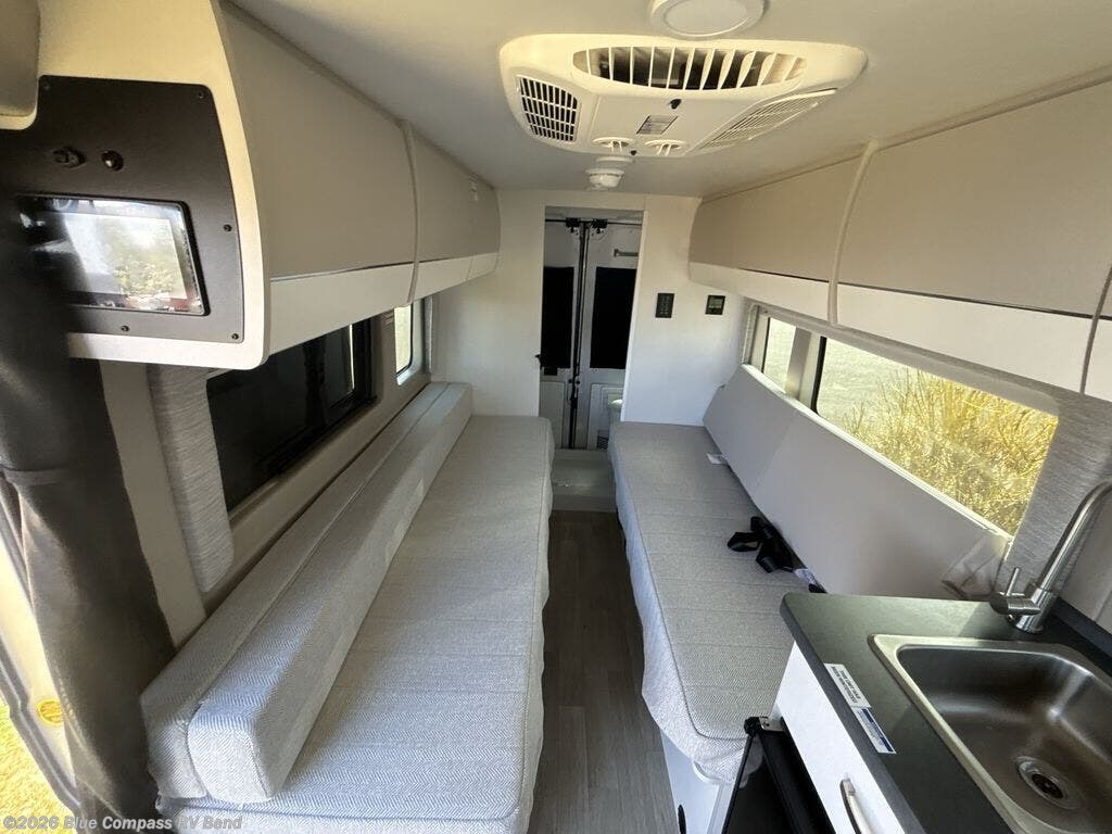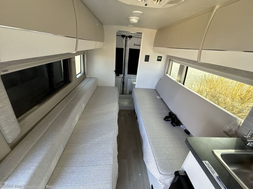 Your trek across country is made comfortable in this coach for two. You can swivel the captains seats around when you get to your destination, or head outdoors to sit under the 13' Thule armless awning with LED lights. The pull-out table indoors will provide a space for your coffee in the morning, while breakfast is being cooked in the convection microwave or on the two burner cooktop. A rear wet bath will allow you to stay clean throughout your trip, and you'll find plenty of storage space for your belongings. You'll love the versatile sleeping arrangements in this model that includes twin-size beds with a filler cushion that converts to a king-size bed, plus there is under-bed storage for your luggage. The optional Li Package can also be added which features a 48V-165 amp hour smart lithium battery, providing 7.9KW hours of power, and more; see dealer for more details!