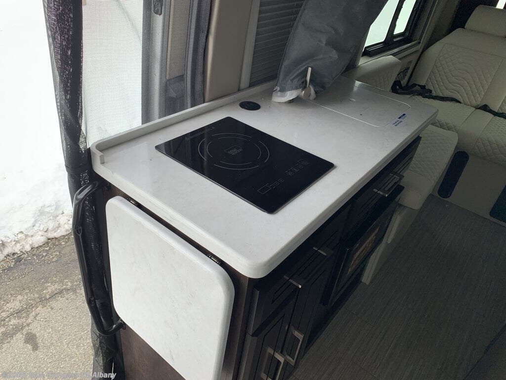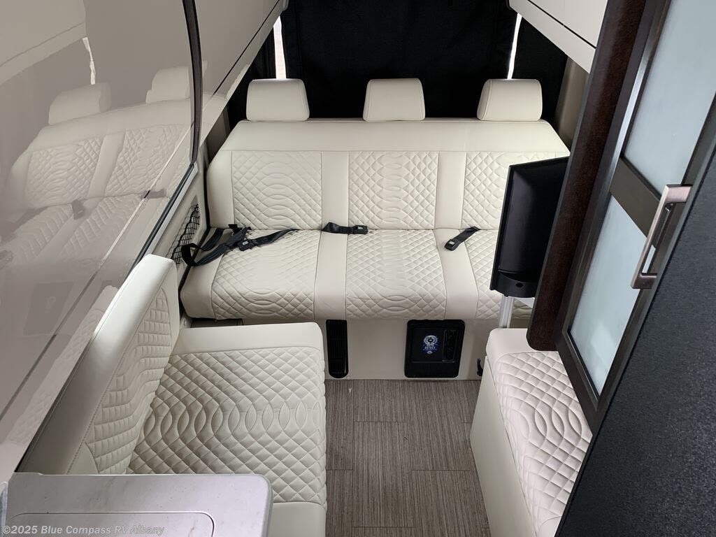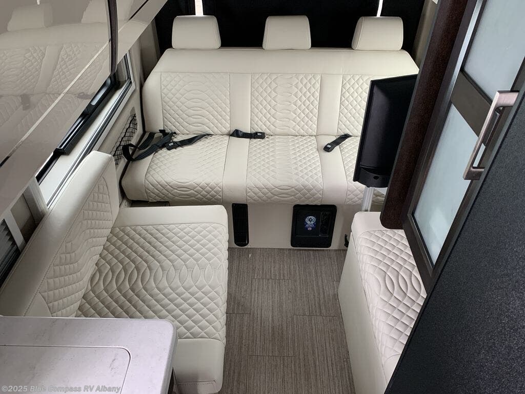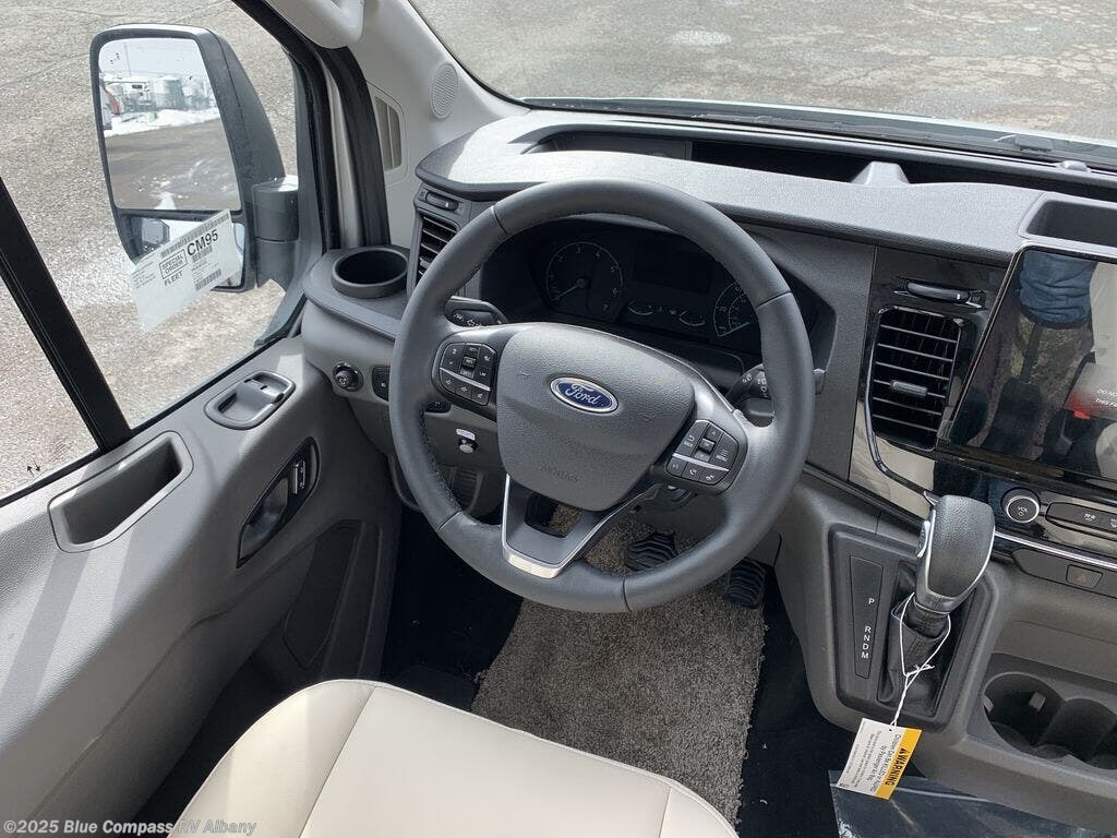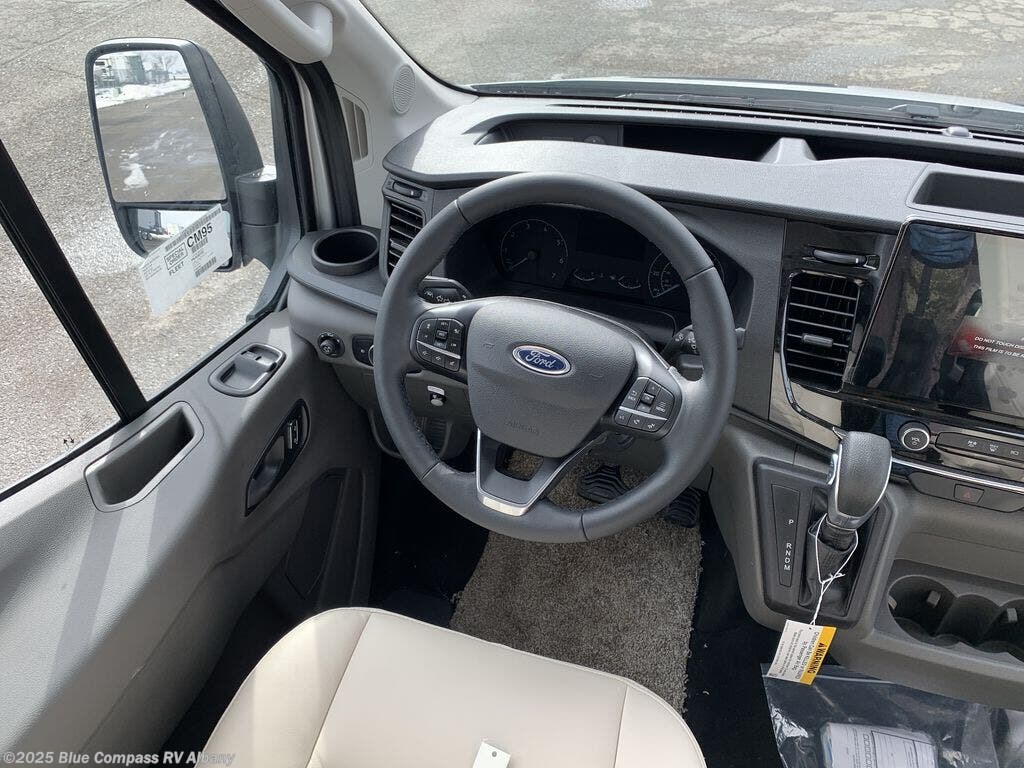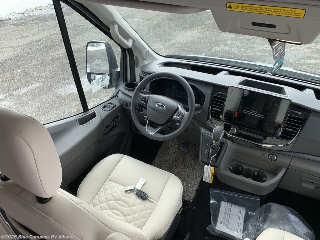 The Expanse brings you luxury, comfort, and safety all in an easy-to-drive Class B size. The rear 68" wide power sofa has plenty of space to stretch out, and two additional jump seats and a table mount make it comfortable enough for a few people to eat dinner or watch the 24" LED HD TV. You could also enjoy meals up front, where the driver and passenger seats can be swiveled around to access the table there. Conveniently, the kitchen is in the middle so no matter where you decide to eat, the table is only a few steps away! The wet bath is also centrally located, with a 25" x 46 3/4" shower, foot flush toilet, and Aqua View® SHOWERMI$ER™ water management system. Thoughtful design includes styling elements like the Tecnoform® European-style high-gloss cabinetry, residential vinyl flooring, and a removable privacy shade for the sliding door window.