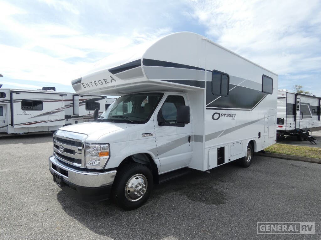 Experience the open road in style with the 2025 Entegra Coach Odyssey SE 22TF. This compact yet spacious RV is designed to make every journey comfortable and memorable. With a length of just under 25 feet, it offers the perfect balance of maneuverability and living space. The thoughtfully arranged floorplan features a front living area that seamlessly transitions into a central kitchen equipped with a full-size electric refrigerator and a convection microwave. The kitchen is perfect for preparing meals on the go, with a two-burner cooktop that ensures you can whip up your favorite dishes with ease. Sleeping up to six, the Odyssey SE 22TF boasts a versatile sleeping arrangement, including a cozy double bed, convertible spaces, and two bunks. The center bath is conveniently located and features a sleek plastic and glass shower, ensuring you stay refreshed during your travels. Outside, a 16-foot powered retractable awning provides ample shade for outdoor relaxation. Built on a robust Ford E350 chassis with a powerful 325-horsepower engine, this RV delivers both reliability and performance. Whether you're exploring new destinations or revisiting favorite spots, the Odyssey SE 22TF is your perfect travel companion. For more details, visit your nearest General RV dealership today!