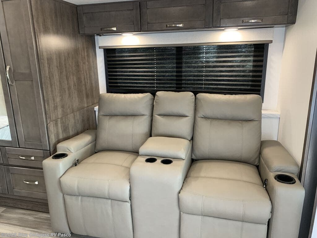 With any Odyssey Class C gas motorhome by Entegra Coach, the driver will appreciate the power from the 325 HP engine, the towing capacity from the 7,500 lb. hitch, the tire pressure monitoring system, the navigation from the Sony infotainment center with Apple CarPlay and Android Auto, plus the backup and side-view cameras when parking and driving down the highway. The kitchen offers full amenities including a recessed stainless steel sink with a cutting board sink cover, LED-lit countertops, a decorative backsplash, and a pop-up charging station with 110 outlet and USB plugs to keep your smart phones charged. Get ready for luxury in a Class C, choose your favorite today!