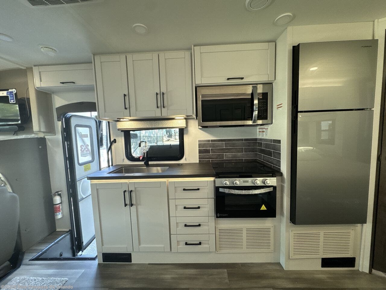 With any Odyssey Class C gas motorhome by Entegra Coach, the driver will appreciate the power from the 325 HP engine, the towing capacity from the 7,500 lb. hitch, the tire pressure monitoring system, the navigation from the Sony infotainment center with Apple CarPlay and Android Auto, plus the backup and side-view cameras when parking and driving down the highway. The kitchen offers full amenities including a recessed stainless steel sink with a cutting board sink cover, LED-lit countertops, a decorative backsplash, and a pop-up charging station with 110 outlet and USB plugs to keep your smart phones charged. Get ready for luxury in a Class C, choose your favorite today!