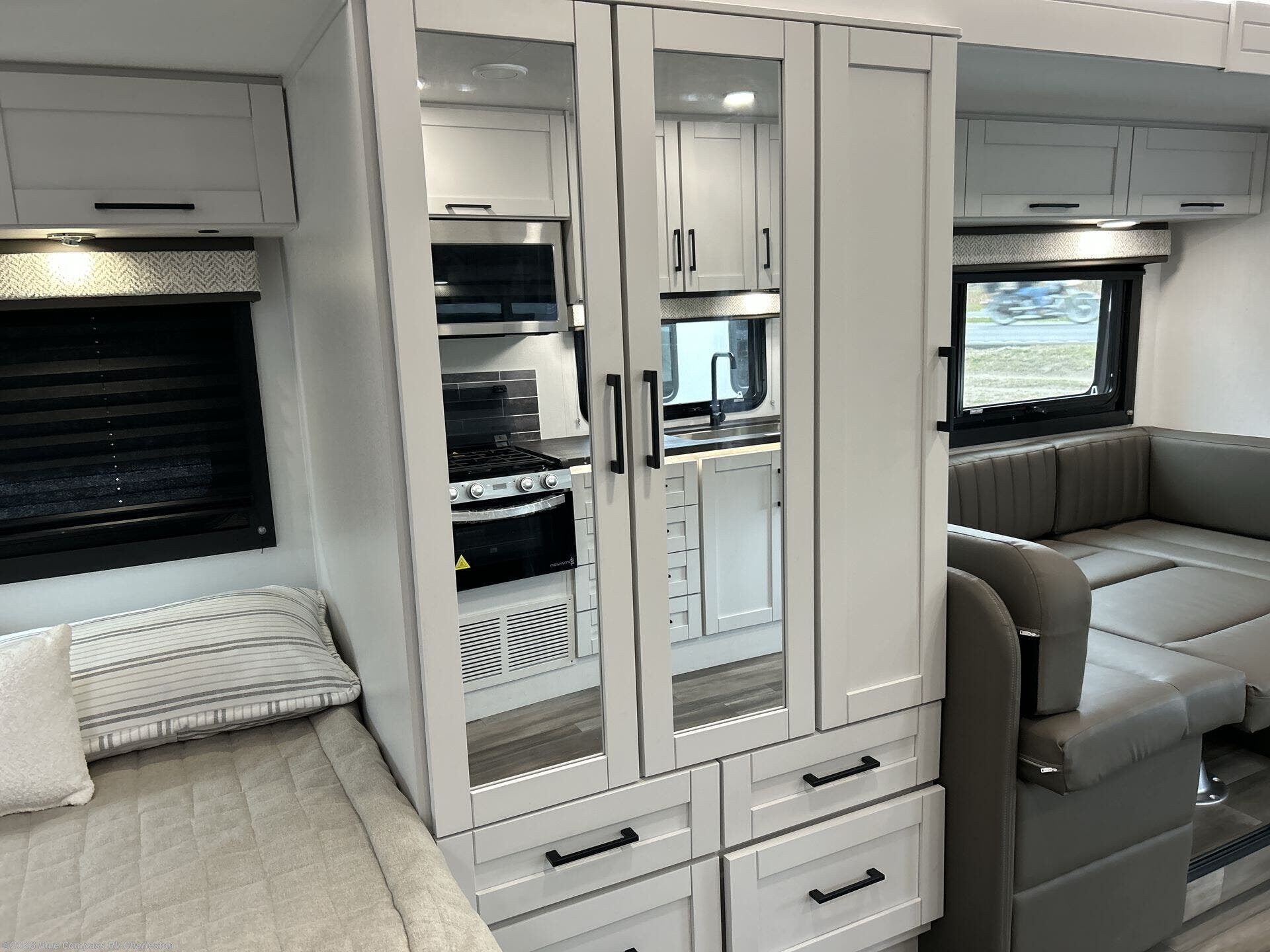 With any Odyssey Class C gas motorhome by Entegra Coach, the driver will appreciate the power from the 325 HP engine, the towing capacity from the 7,500 lb. hitch, the tire pressure monitoring system, the navigation from the Sony infotainment center with Apple CarPlay and Android Auto, plus the backup and side-view cameras when parking and driving down the highway. The kitchen offers full amenities including a recessed stainless steel sink with a cutting board sink cover, LED-lit countertops, a decorative backsplash, and a pop-up charging station with 110 outlet and USB plugs to keep your smart phones charged. Get ready for luxury in a Class C, choose your favorite today!