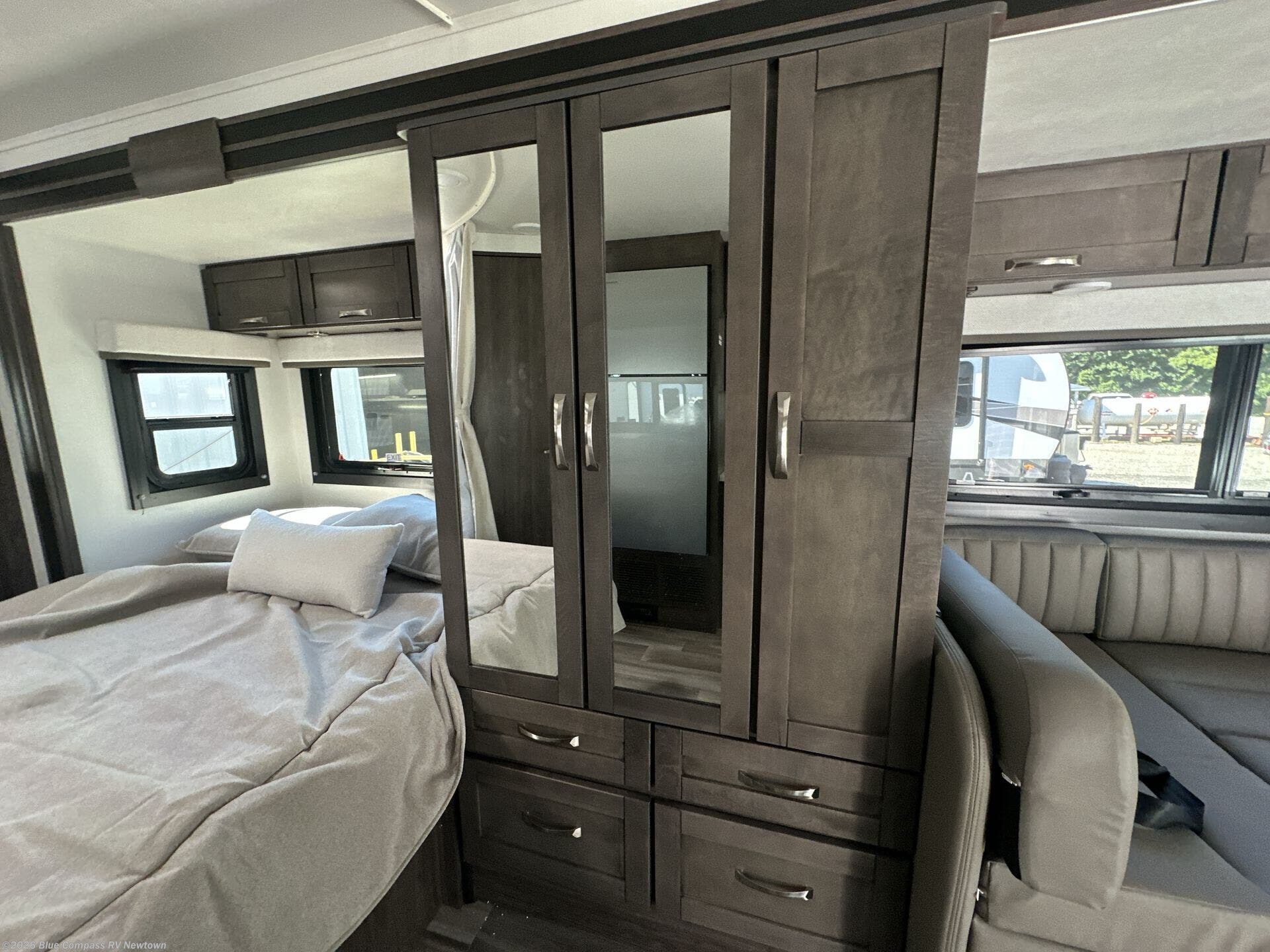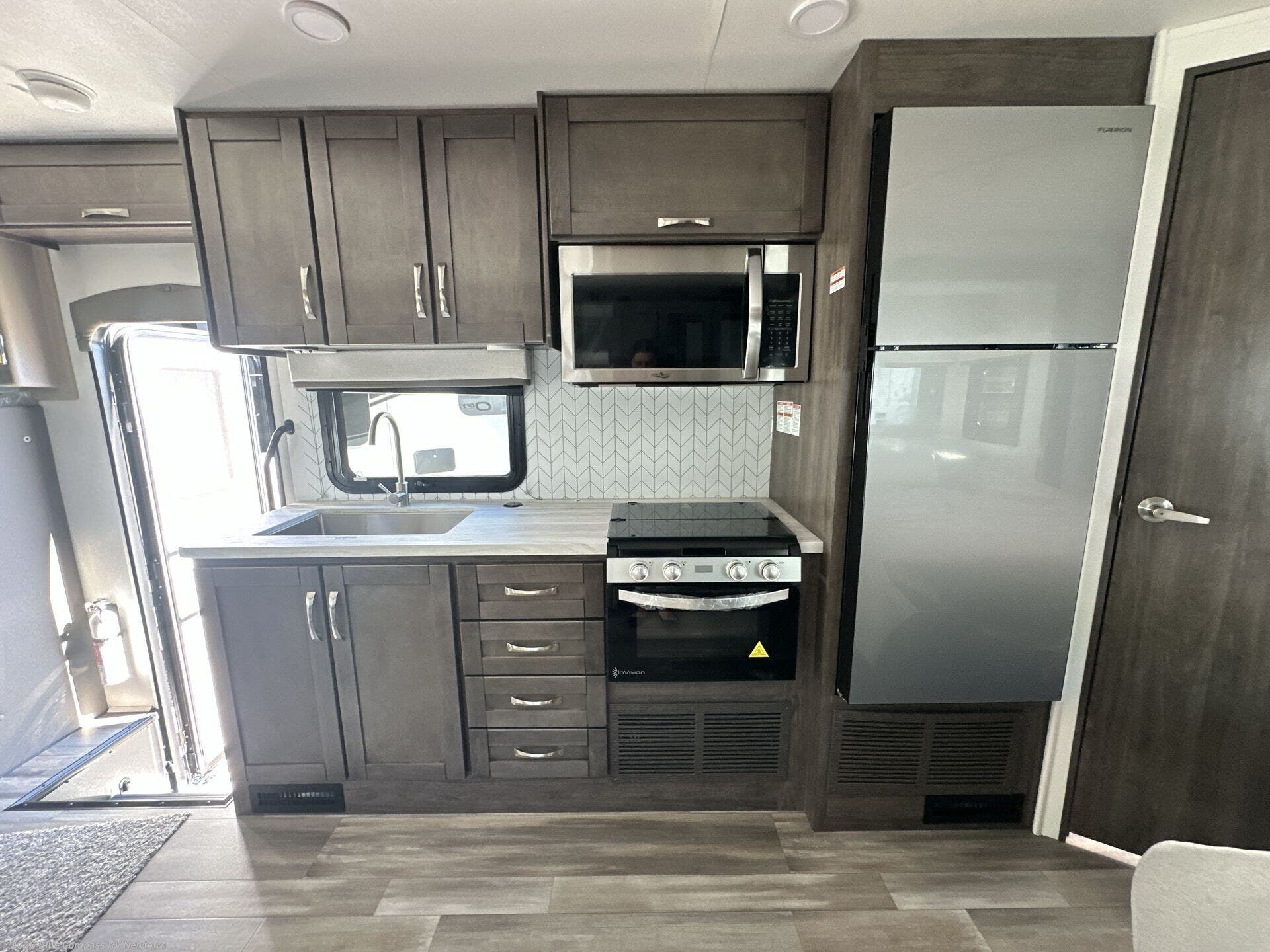 With any Odyssey Class C gas motorhome by Entegra Coach, the driver will appreciate the power from the 325 HP engine, the towing capacity from the 7,500 lb. hitch, the tire pressure monitoring system, the navigation from the Sony infotainment center with Apple CarPlay and Android Auto, plus the backup and side-view cameras when parking and driving down the highway. The kitchen offers full amenities including a recessed stainless steel sink with a cutting board sink cover, LED-lit countertops, a decorative backsplash, and a pop-up charging station with 110 outlet and USB plugs to keep your smart phones charged. Get ready for luxury in a Class C, choose your favorite today!