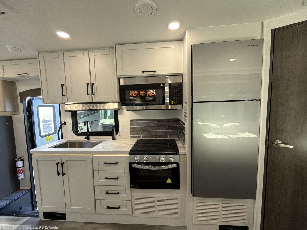 With any Odyssey Class C gas motorhome by Entegra Coach, the driver will appreciate the power from the 325 HP engine, the towing capacity from the 7,500 lb. hitch, the tire pressure monitoring system, the navigation from the Sony infotainment center with Apple CarPlay and Android Auto, plus the backup and side-view cameras when parking and driving down the highway. The kitchen offers full amenities including a recessed stainless steel sink with a cutting board sink cover, LED-lit countertops, a decorative backsplash, and a pop-up charging station with 110 outlet and USB plugs to keep your smart phones charged. Get ready for luxury in a Class C, choose your favorite today!