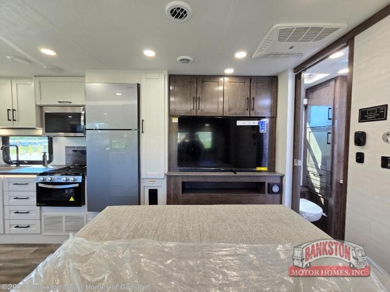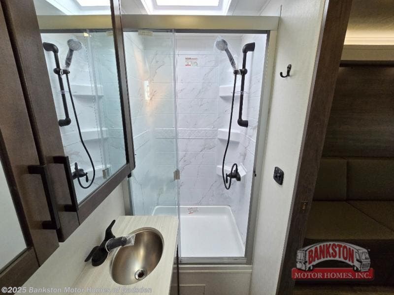 Enjoy a whole lot of comfort, fun and versatility in this coach! The queen Murphy bed and sofa combination allows you to convert between a living area and a bedroom, with a fireplace and an LED HD Smart TV. Outside, the exterior TV and 19' electric awning provide you an outdoor living space to enjoy nature and its beauty. The inside also provides a rear full bathroom including a space saving sliding door, linen storage, counter space for toiletries and a shower. You can dine at the U-shaped dinette or while sitting on the swivel captains chairs, and the cab-over bunk will be a perfect place to stay the night.