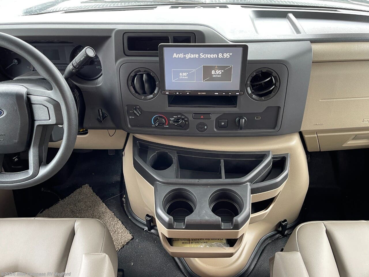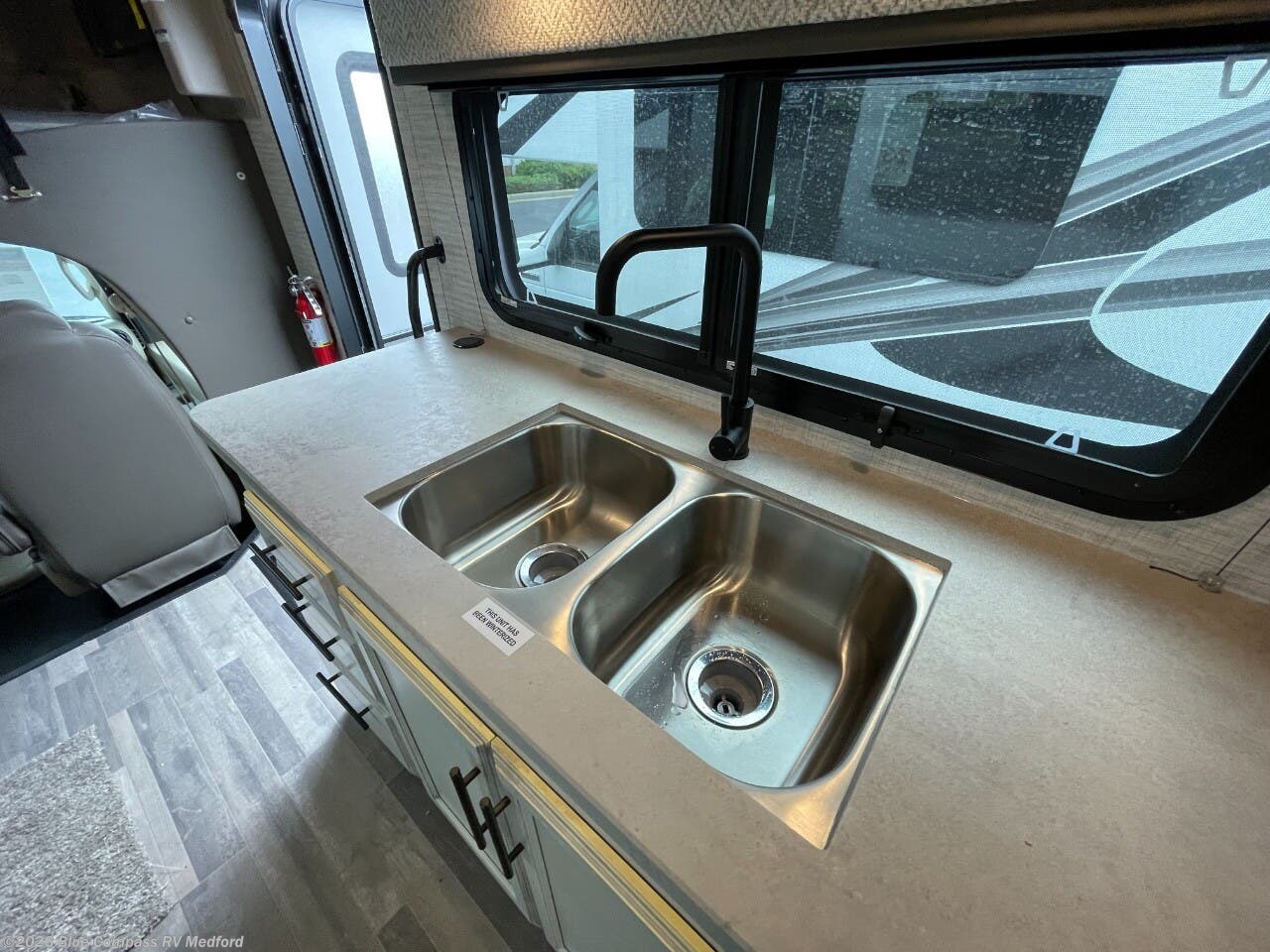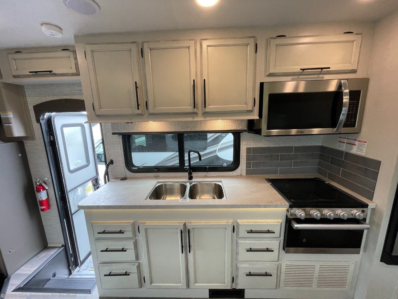 With any Odyssey Class C gas motorhome by Entegra Coach, the driver will appreciate the power from the 325 HP engine, the towing capacity from the 7,500 lb. hitch, the tire pressure monitoring system, the navigation from the Sony infotainment center with Apple CarPlay and Android Auto, plus the backup and side-view cameras when parking and driving down the highway. The kitchen offers full amenities including a recessed stainless steel sink with a cutting board sink cover, LED-lit pressed countertops, a decorative backsplash, and a pop-up charging station with 110 outlet and USB plugs to keep your smart phones charged. Get ready for luxury in a Class C, choose your favorite today!