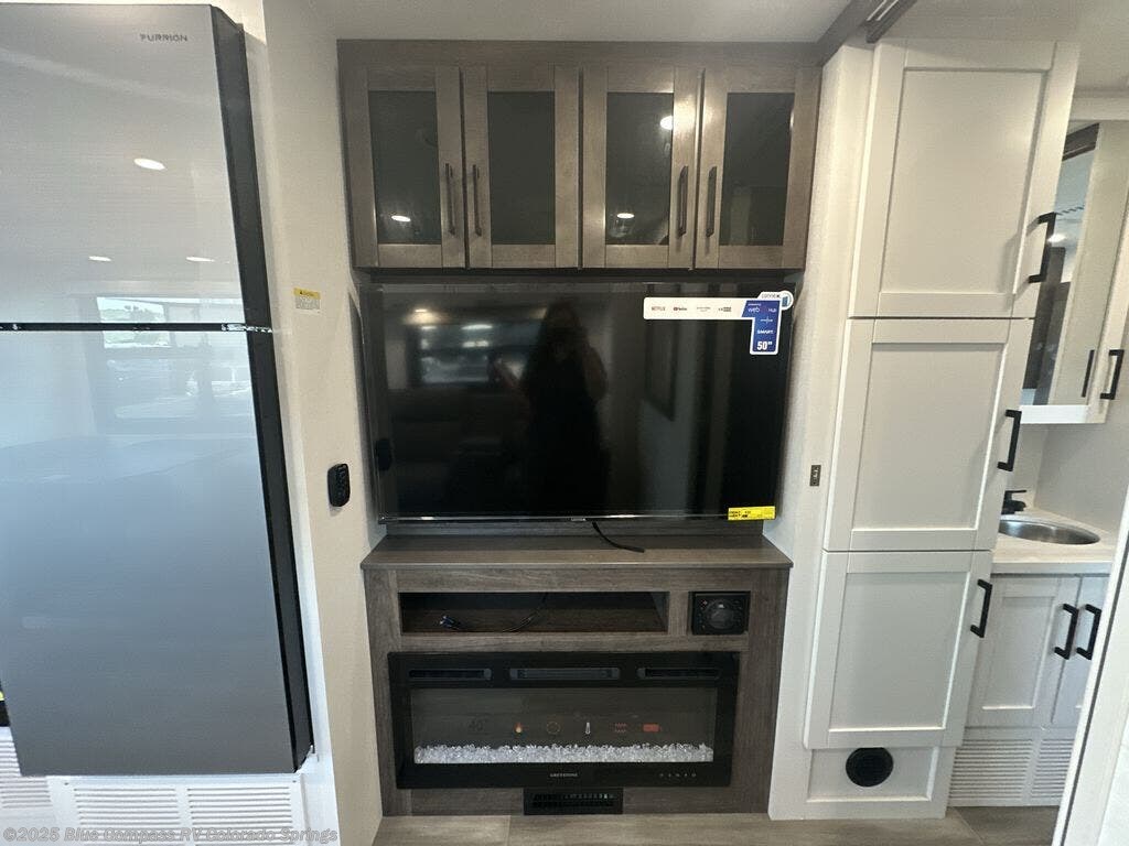 Relax inside while sitting on the sofa, at the booth dinette or on the swivel captains chairs while enjoying the fireplace and 50" TV, or unwind outside under the 18' electric awning while watching the exterior TV. After shopping in town or hiking the trails you can get cleaned up in the private toilet and shower room then brush your teeth in the bathroom sink a few steps outside the door. The private bedroom includes a space saving sliding door, a unique rear queen bed slide, plus storage. The cook will enjoy making meals using the residential-size microwave and Furrion all-in-one cooktop and oven, then storing leftovers in the 8 cu. ft. refrigerator. And the L-shaped counter with sink will come in handy.