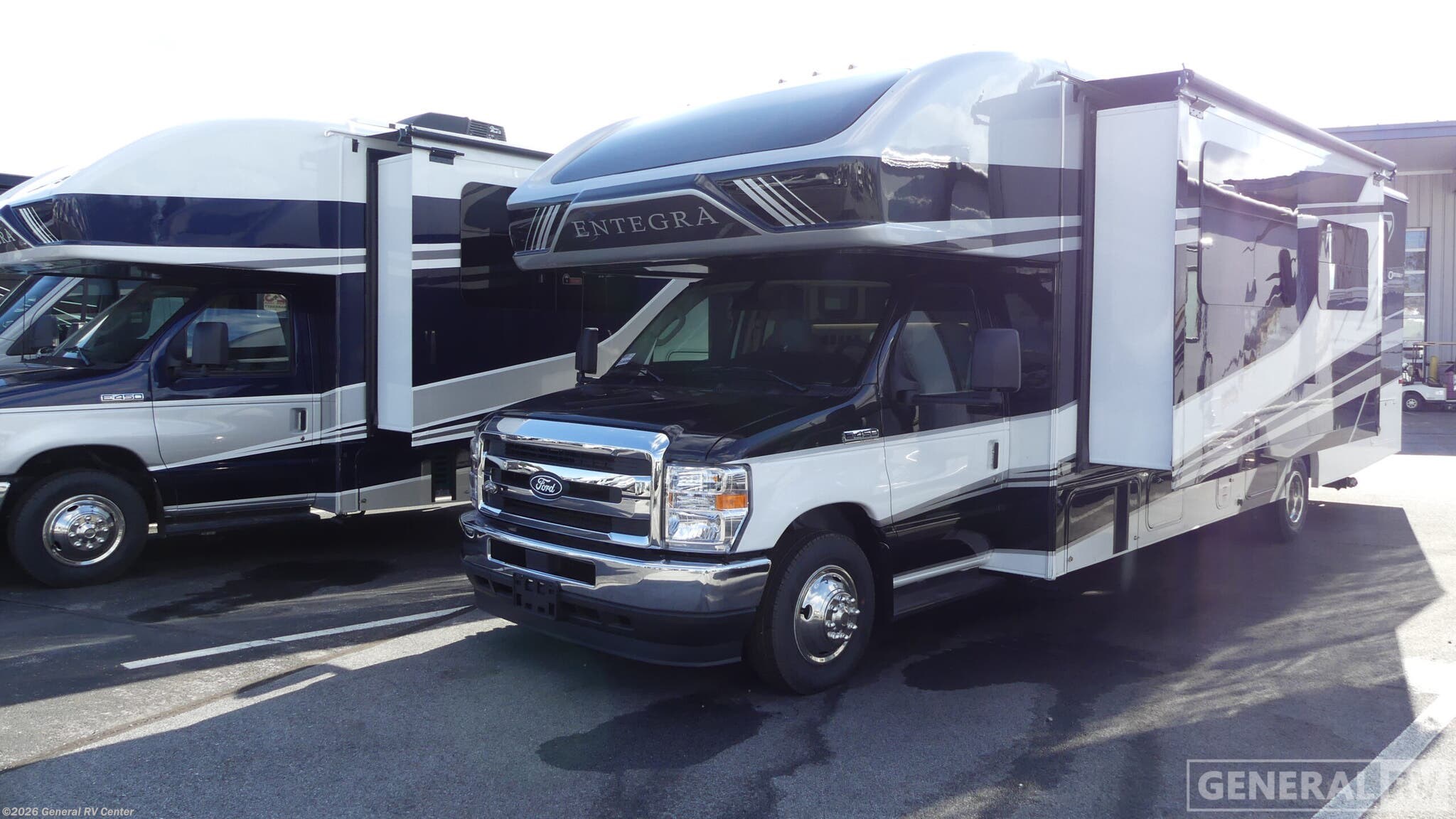 Step into the world of luxurious travel with the 2026 Entegra Coach Odyssey 30Z. This RV is designed for those who crave adventure without sacrificing comfort. With its spacious interior and smart layout, it comfortably sleeps up to eight people, making it perfect for family getaways or trips with friends. The front kitchen is a culinary enthusiast's dream, equipped with a full-size electric refrigerator and a three-burner cooktop, allowing you to whip up delicious meals on the go. The center living area boasts a cozy fireplace and a 50" TV, creating the ideal space for relaxation and entertainment. The Odyssey 30Z’s thoughtful design continues with its rear bedroom, featuring a plush queen bed and ample storage, ensuring restful nights after a day of exploration. The center bath, complete with a 30" x 36" shower, offers convenience and privacy. Outside, the 18-foot powered retractable awning and exterior TV enhance your outdoor living experience, providing shade and entertainment under the open sky. Built on a robust Ford E450 chassis with a powerful 325-horsepower engine, this RV promises a smooth ride and the capability to tow up to 7,500 pounds, making it a reliable companion for all your adventures. For more information or to experience this incredible RV firsthand, visit your nearest General RV dealership.