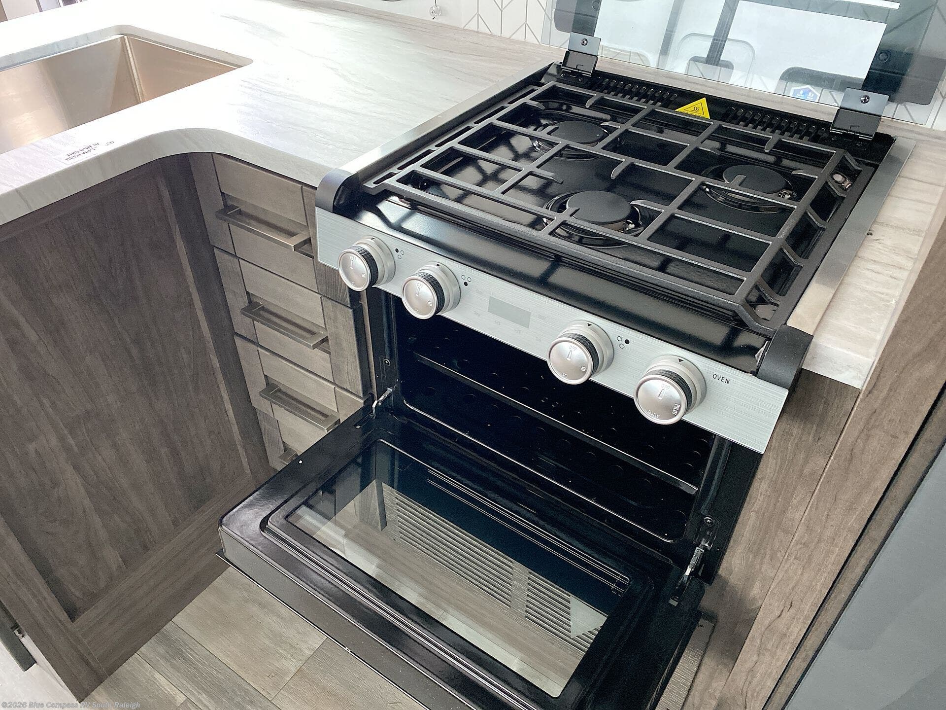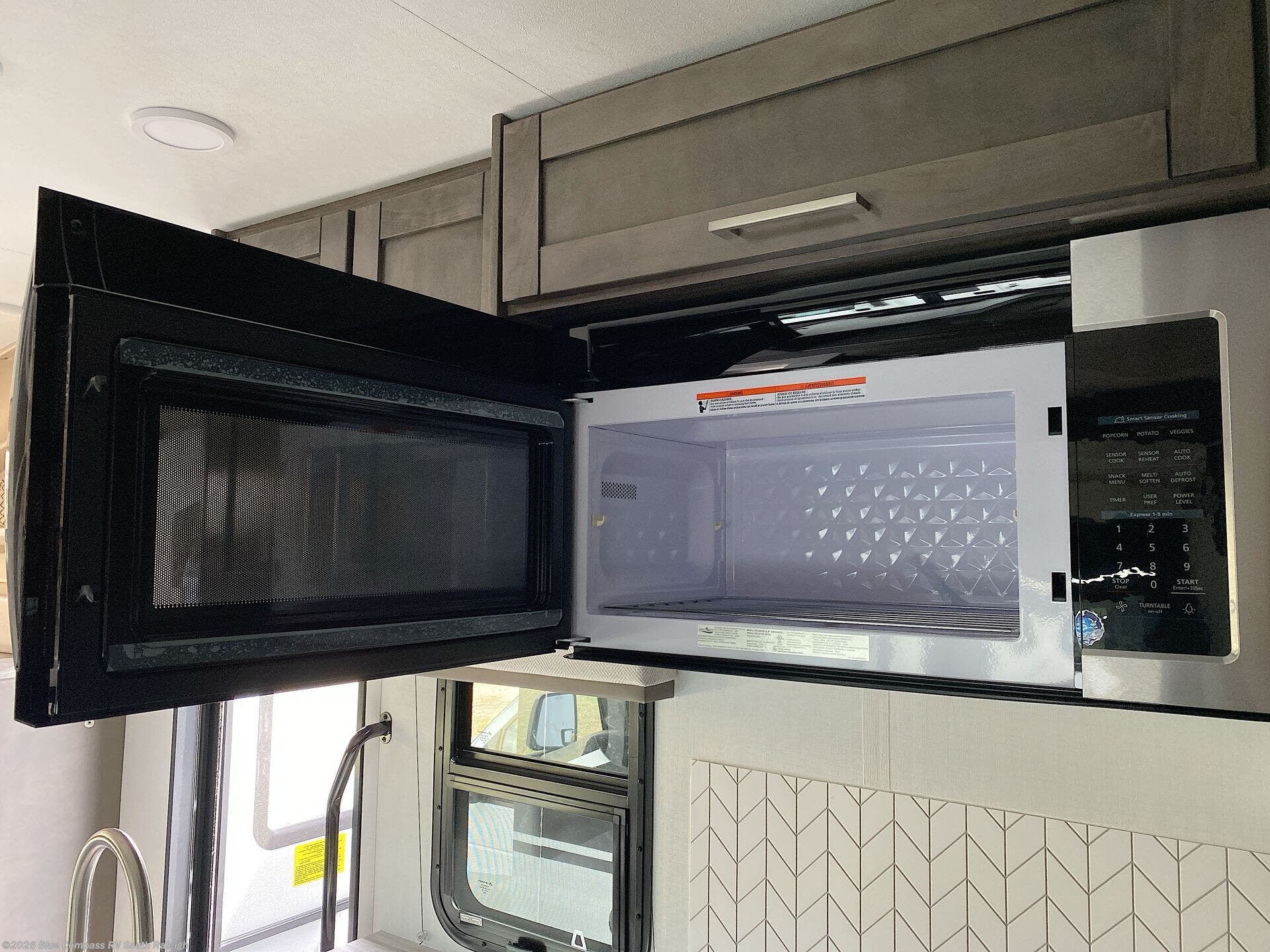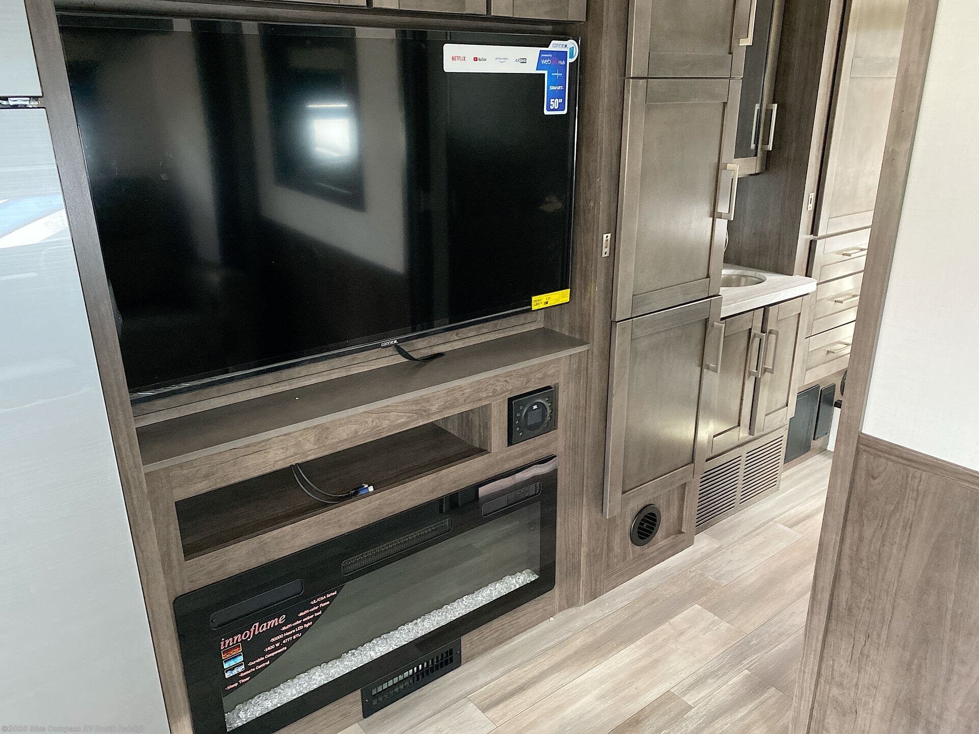 Relax inside while sitting on the sofa, at the booth dinette or on the swivel captains chairs while enjoying the fireplace and 50" TV, or unwind outside under the 18' electric awning while watching the exterior TV. After shopping in town or hiking the trails you can get cleaned up in the private toilet and shower room then brush your teeth in the bathroom sink a few steps outside the door. The private bedroom includes a space saving sliding door, a unique rear queen bed slide, plus storage. The cook will enjoy making meals using the residential-size microwave and Furrion all-in-one cooktop and oven, then storing leftovers in the 8 cu. ft. refrigerator. And the L-shaped counter with sink will come in handy.