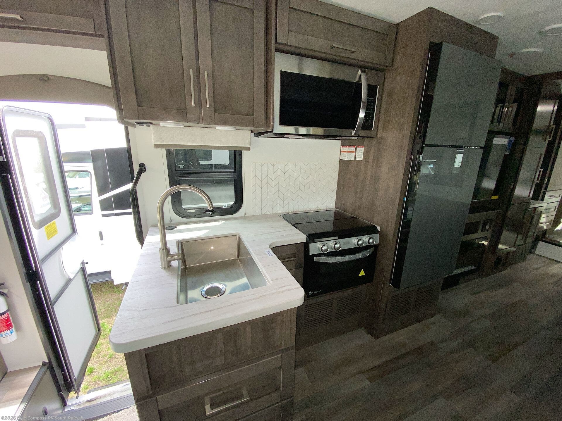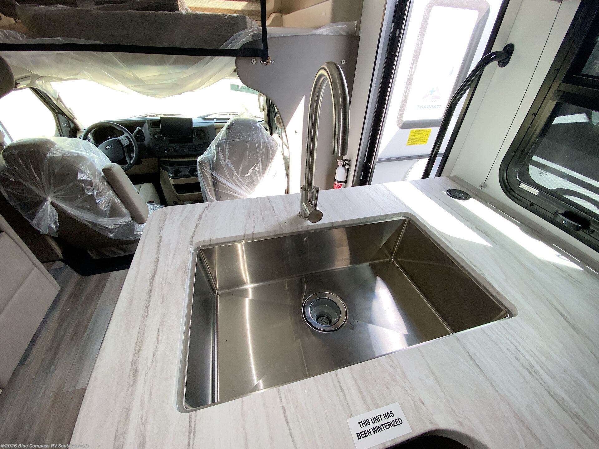 With any Odyssey Class C gas motorhome by Entegra Coach, the driver will appreciate the power from the 325 HP engine, the towing capacity from the 7,500 lb. hitch, the tire pressure monitoring system, the navigation from the Sony infotainment center with Apple CarPlay and Android Auto, plus the backup and side-view cameras when parking and driving down the highway. The kitchen offers full amenities including a recessed stainless steel sink with a cutting board sink cover, LED-lit pressed countertops, a decorative backsplash, and a pop-up charging station with 110 outlet and USB plugs to keep your smart phones charged. Get ready for luxury in a Class C, choose your favorite today!